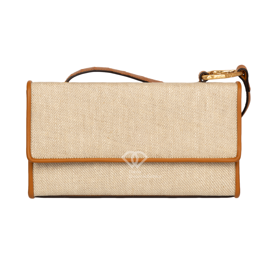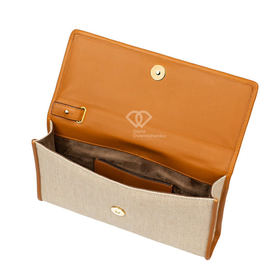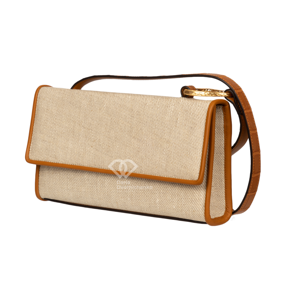Сумка-багет "Канва" с контрастной отделкой из кожи крокодила. Элегантный и структурированный аксессуар, который сочетает натуральную фактуру и строгий классический контраст. Идеально подходит для создания образа в стиле Old Money или Smart Casual в теплое время года. Классическая, удлиненная форма багета с четкими линиями и клапаном. Внутри — подкладка и карманы, включая центральное отделение. Застежка-клапан на магнитной кнопке, золотистая фурнитура. Нейтральная цветовая гамма позволяет легко интегрировать сумку как в дневные, так и в вечерние образы.