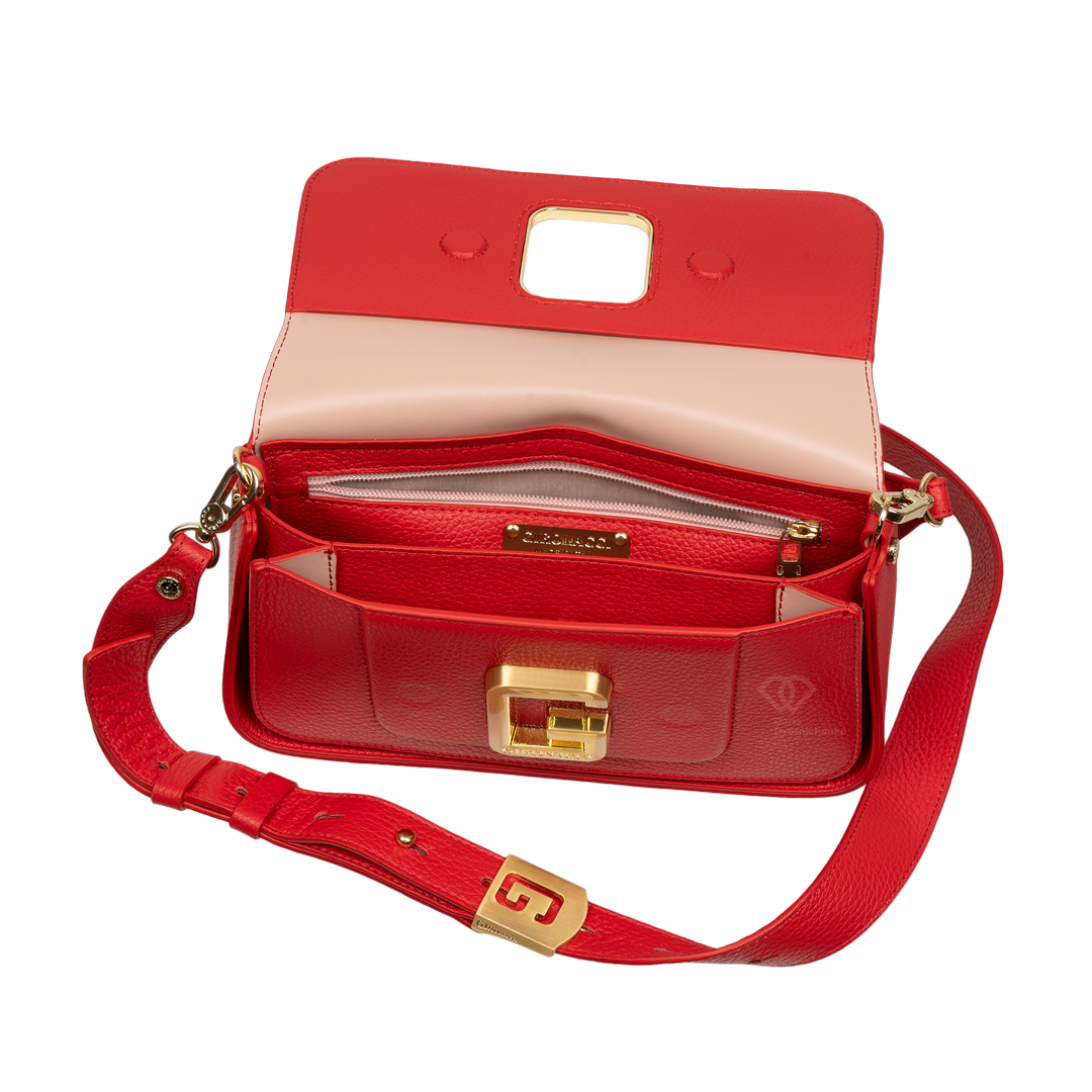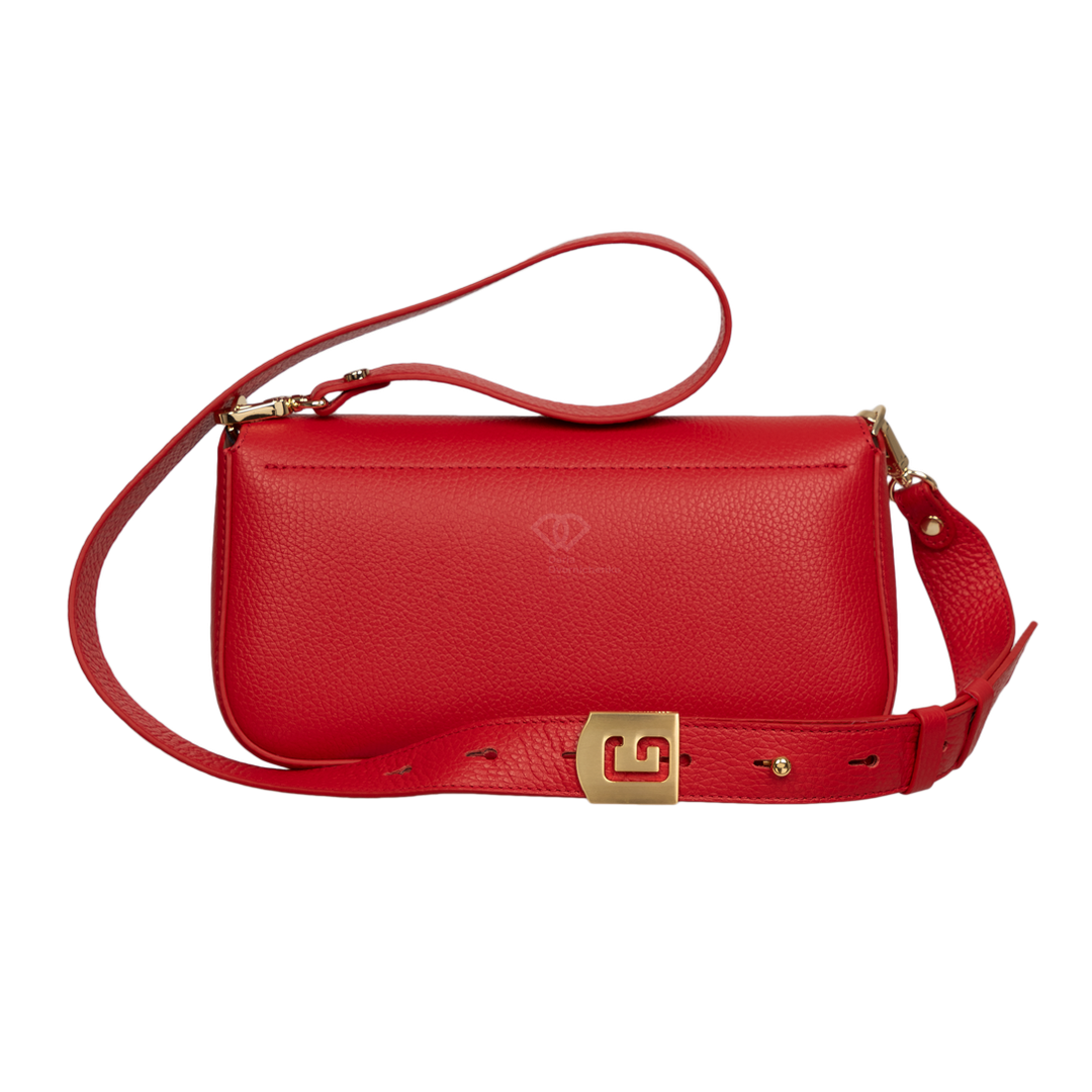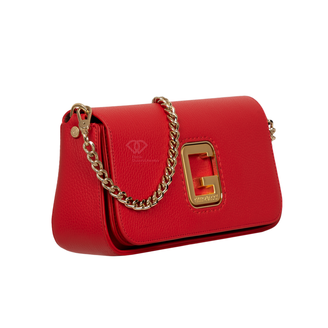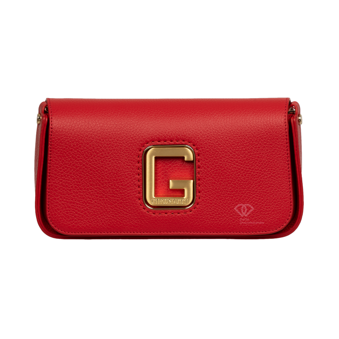 Сумка Багет итальянского бренда Gironacci (Джироначчи) изготовлена из натуральной кожи, с золотой фурнитурой. Закрывается на крышку-клапан и магнитный замок. Внутри два независимых отделения. На стенке заднего отделения большой карман на молнии. Ручка в виде съемной цепочки. Плечевой ремень съемный и регулируемый. Можно носить в руке, на плече и на изгибе руки.