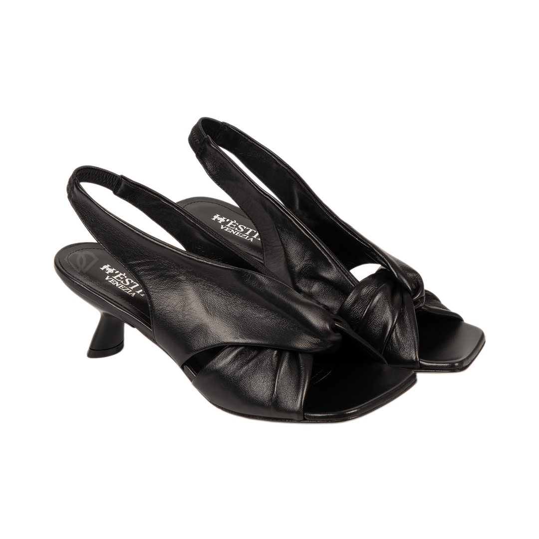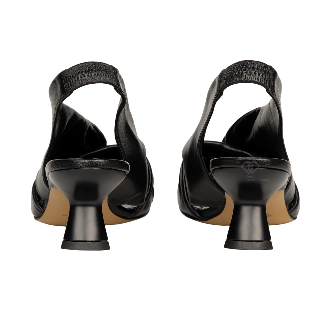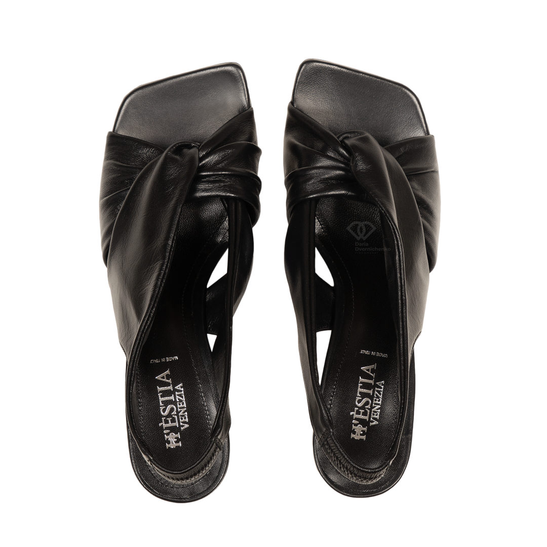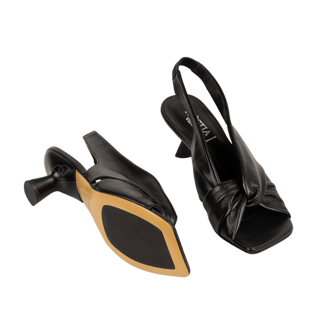 Эта модель босоножек выделяется эффектной мягкой драпировкой кожи, напоминающей изысканный узел. Лаконичный черный цвет и необычный силуэт делают их по-настоящему статусным аксессуаром. Мягкая гладкая кожа премиум-класса с деликатным матовым блеском. Перекрестная драпировка на мысе добавляет объём и текстурность, скрывая стопу ровно настолько, чтобы выглядеть загадочно и элегантно. Актуальная квадратная форма подошвы.Невысокий устойчивый каблук-рюмочка (kitten heel) обеспечивает комфорт на протяжении всего вечера.