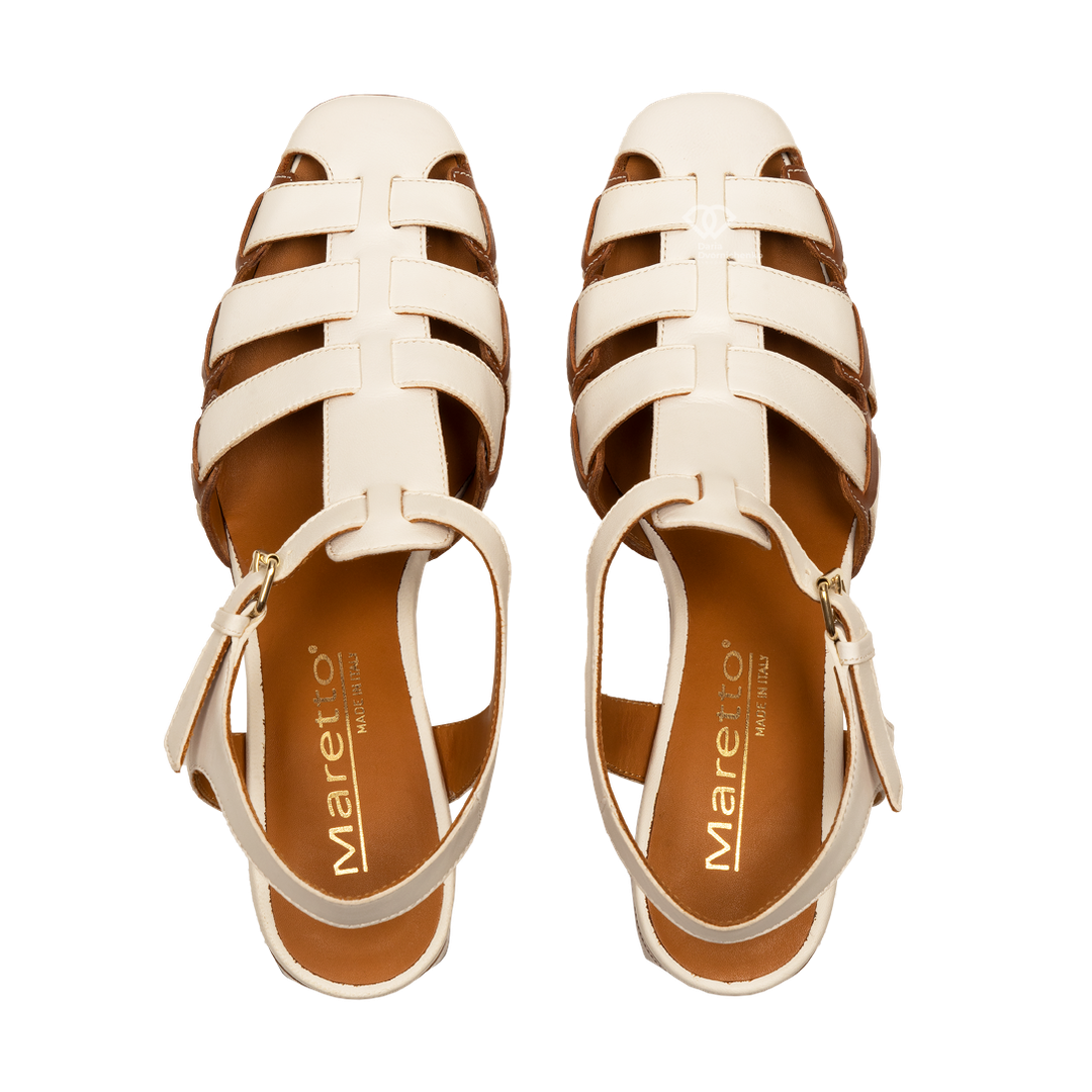 Эти босоножки станут центральным элементом вашего летнего гардероба. Модель выполнена из высококачественной натуральной кожи в благородном белом цвете. Переплетение ремешков обеспечивает отличную фиксацию стопы и придает образу легкую нотку ретро-шика. Устойчивый невысокий каблук идеален для долгих прогулок. Регулируемый ремешок на щиколотке с изящной золотистой фурнитурой.