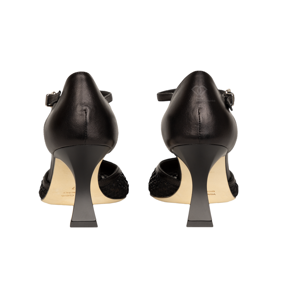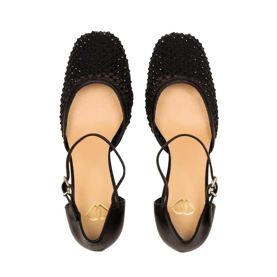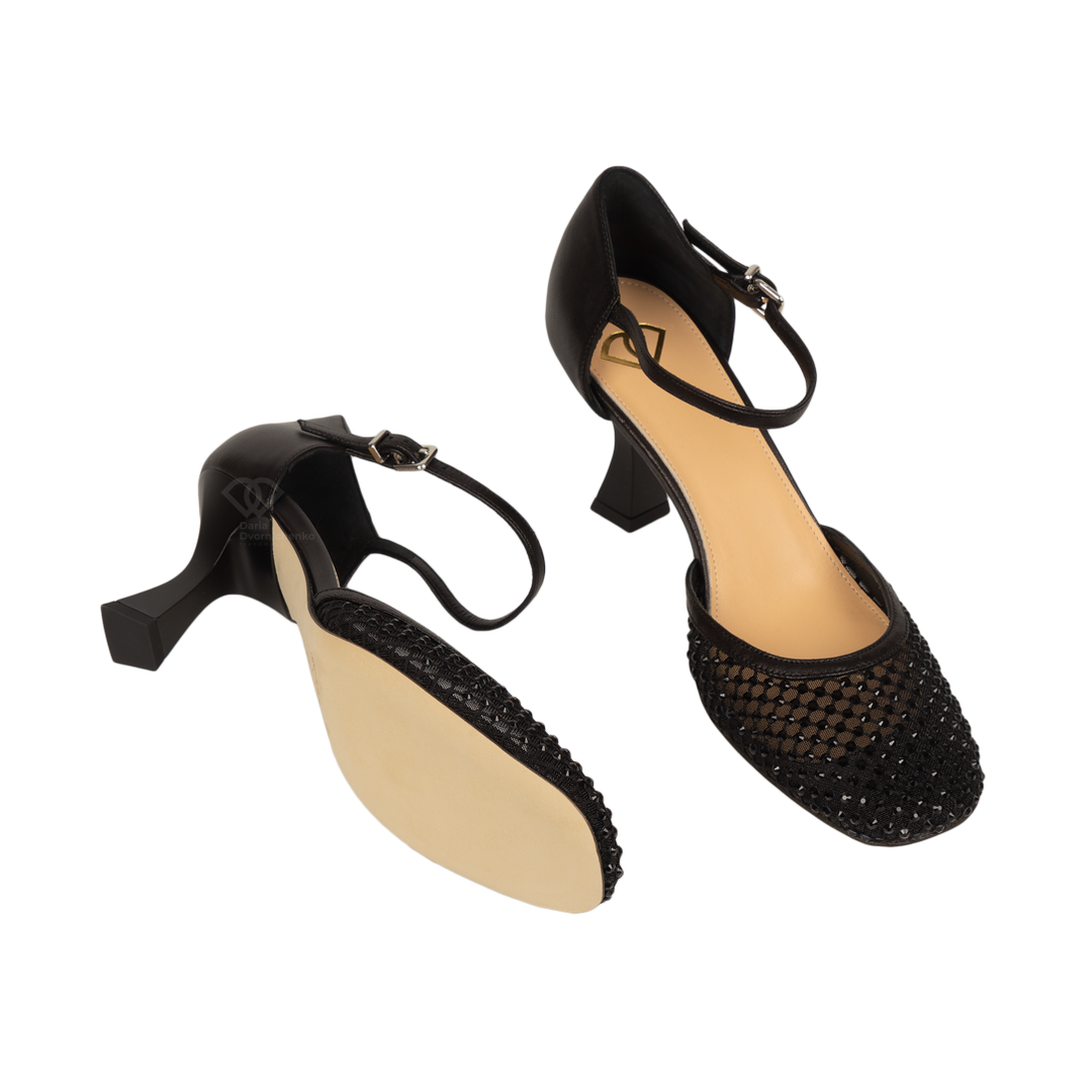 Классический силуэт Мэри-Джейн переосмыслен в современном ключе: изящная сетка, усыпанная мерцающими стразами, создает вау-эффект, а удобный каблук-рюмочка обеспечивает комфорт до самого утра. Ремешок с миниатюрной пряжкой подчеркивает щиколотку и обеспечивает идеальную фиксацию. Сетка с россыпью страз притягивает взгляды и добавляет роскоши любому образу.