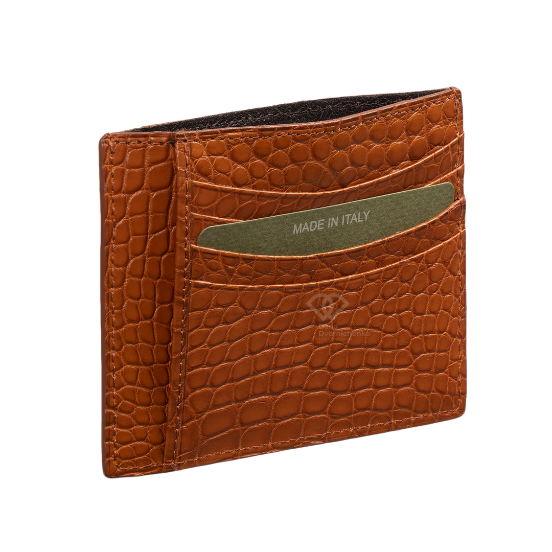 Компактный картхолдер Biagini выполнен из мягкой и при этом прочной крокодиловой кожи. Естественный фактурный рисунок чешуек, который делает каждый такой аксессуар уникальным, подчеркнули пигментами нескольких близких оттенков. Модель с четырьмя слотами для банковских карт (по две с каждой стороны) дополнили центральным карманом, где удобно хранить чеки. Идеальный аксессуар для тех, кто ценит минимализм, порядок и роскошные детали.Тонкий и плоский дизайн, который не утяжеляет карман и легко помещается в самые маленькие сумочки.