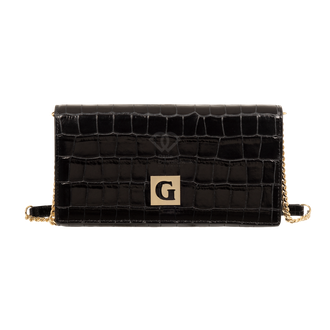 Эти изящные клатчи станут идеальным завершением вечернего или коктейльного образа. Фактура «под крокодила» в сочетании с золотистой фурнитурой добавляет аксессуару благородного лоска. Тонкий плечевой ремень-цепочка золотистого цвета позволяет носить сумку на плече, освобождая руки. Идеальный размер, чтобы вместить самое необходимое: телефон, ключи, помаду и картхолдер.