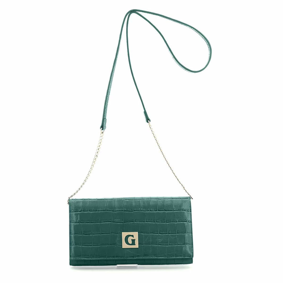 Эти изящные клатчи станут идеальным завершением вечернего или коктейльного образа. Фактура «под крокодила» в сочетании с золотистой фурнитурой добавляет аксессуару благородного лоска. Тонкий плечевой ремень-цепочка золотистого цвета позволяет носить сумку на плече, освобождая руки. Идеальный размер, чтобы вместить самое необходимое: телефон, ключи, помаду и картхолдер.
