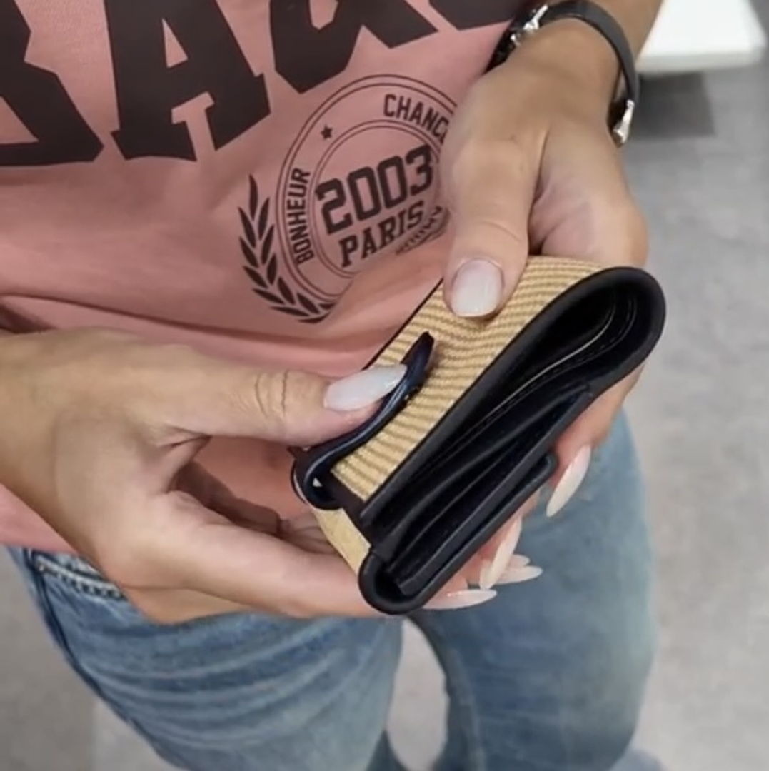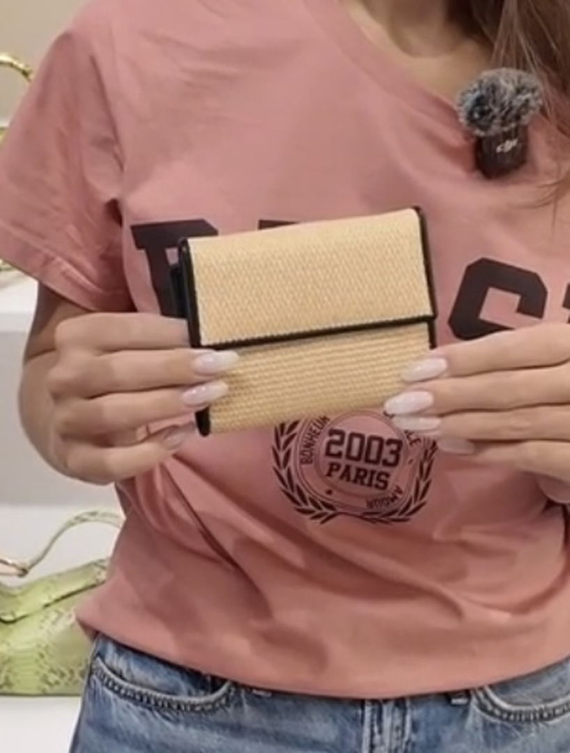 Изысканное сочетание природной текстуры и роскоши. Натуральная рафия дополнена мягкой кожей. Гладкая кожаная окантовка и внутренняя отделка добавляет аксессуару прочности. Несмотря на внешнюю легкость, кошелек функционален. Внутри, с двух сторон несколько отделений для банковских карт, отделения для купюр. Изящная кнопка обеспечивает безопасное хранение содержимого.