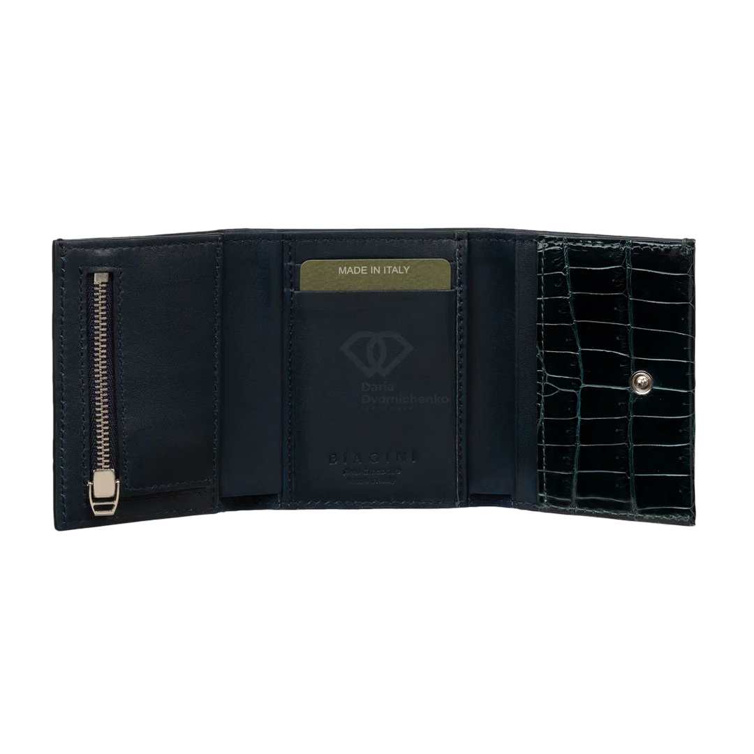 Компактный кошелек из натуральной кожи крокодила. Яркий и практичный аксессуар, который не только вместит все необходимое, но и станет модным цветовым акцентом. Внутри вместительное отделение для купюр, много слотов для банковских карт и отдельный внутренний отсек на молнии(идеально для мелочи).