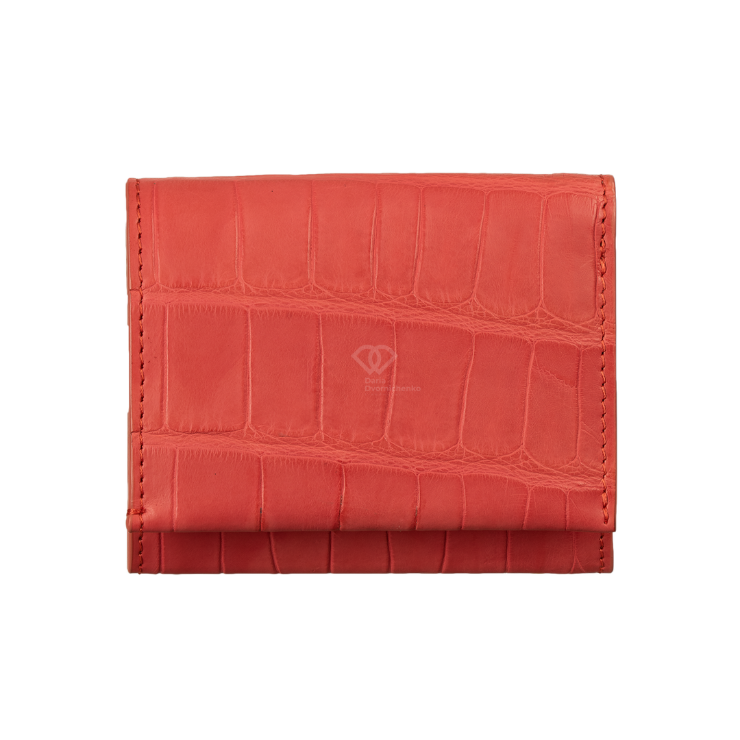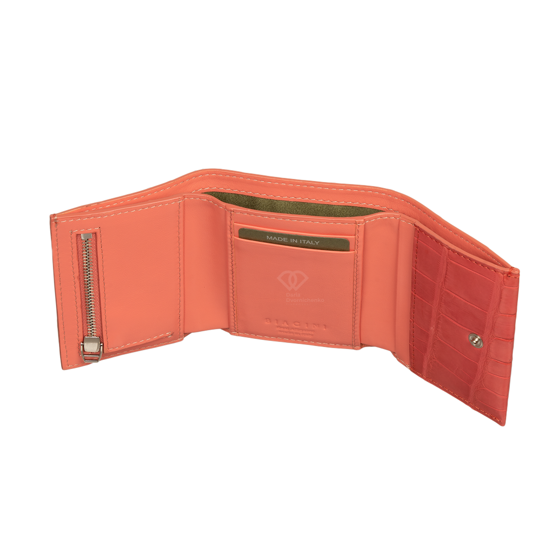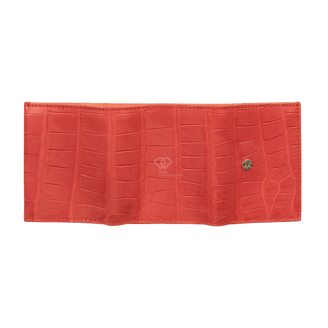 Компактный кошелек из натуральной кожи крокодила. Яркий и практичный аксессуар, который не только вместит все необходимое, но и станет модным цветовым акцентом. Внутри вместительное отделение для купюр, много слотов для банковских карт и отдельный внутренний отсек на молнии(идеально для мелочи).