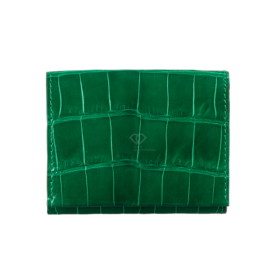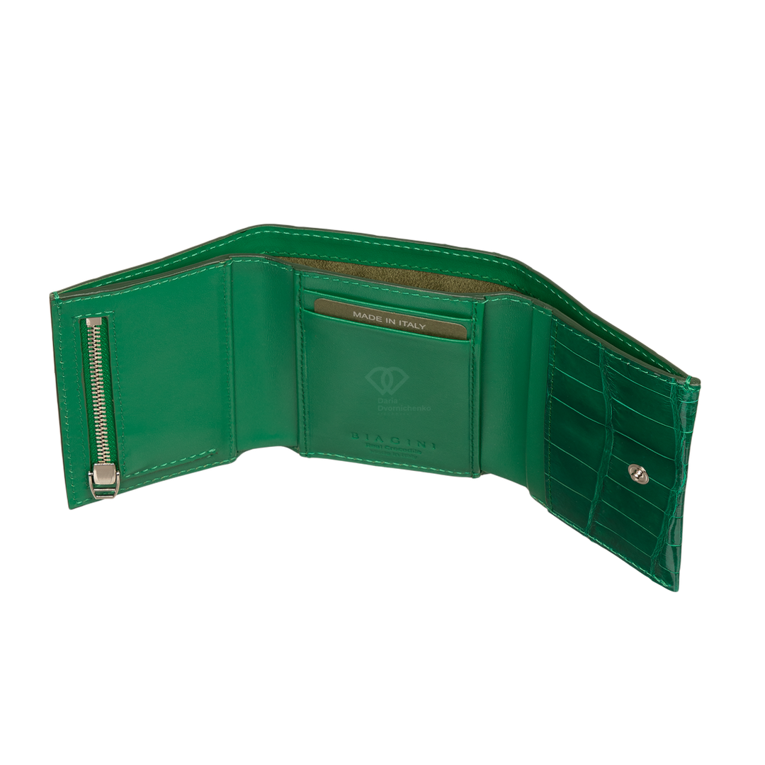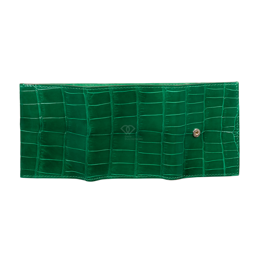 Компактный кошелек из натуральной кожи крокодила. Яркий и практичный аксессуар, который не только вместит все необходимое, но и станет модным цветовым акцентом. Внутри вместительное отделение для купюр, много слотов для банковских карт и отдельный внутренний отсек на молнии(идеально для мелочи).