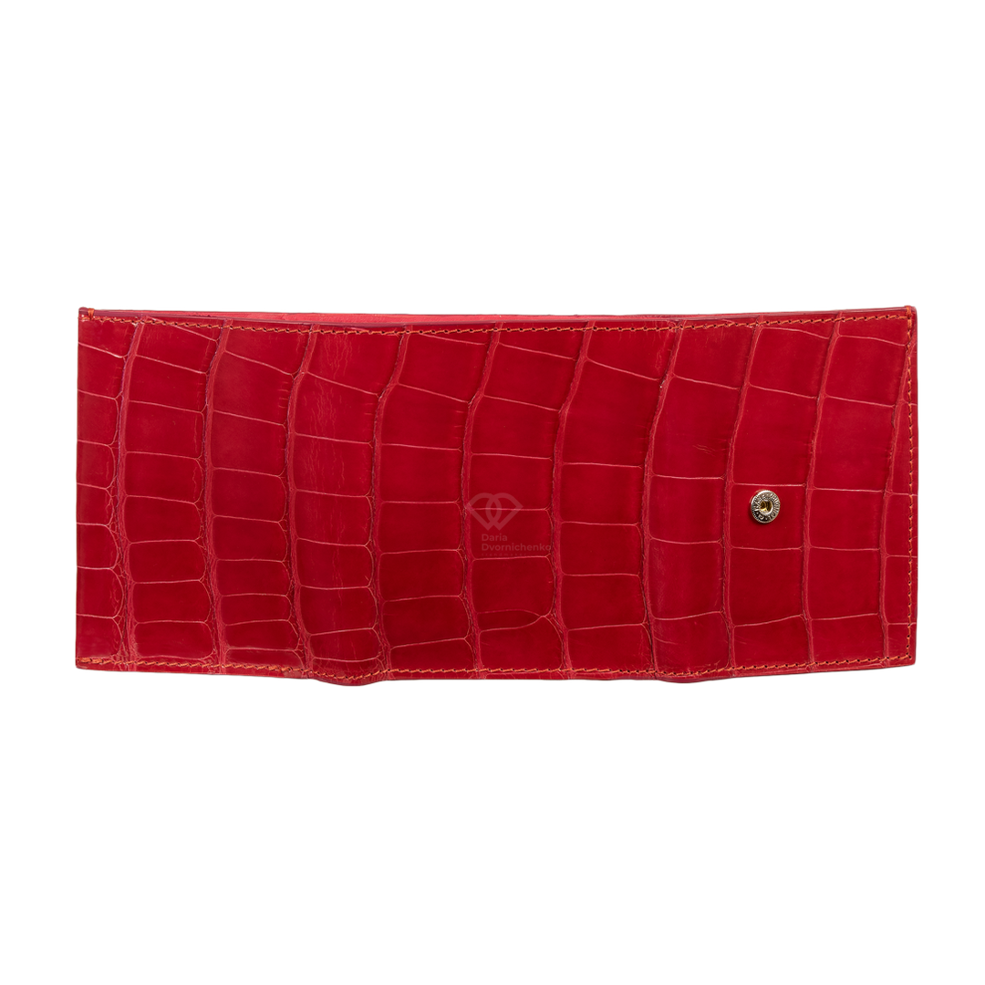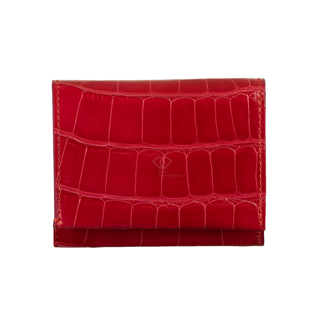 Компактный кошелек из натуральной кожи крокодила. Яркий и практичный аксессуар, который не только вместит все необходимое, но и станет модным цветовым акцентом. Внутри вместительное отделение для купюр, много слотов для банковских карт и отдельный внутренний отсек на молнии(идеально для мелочи).
