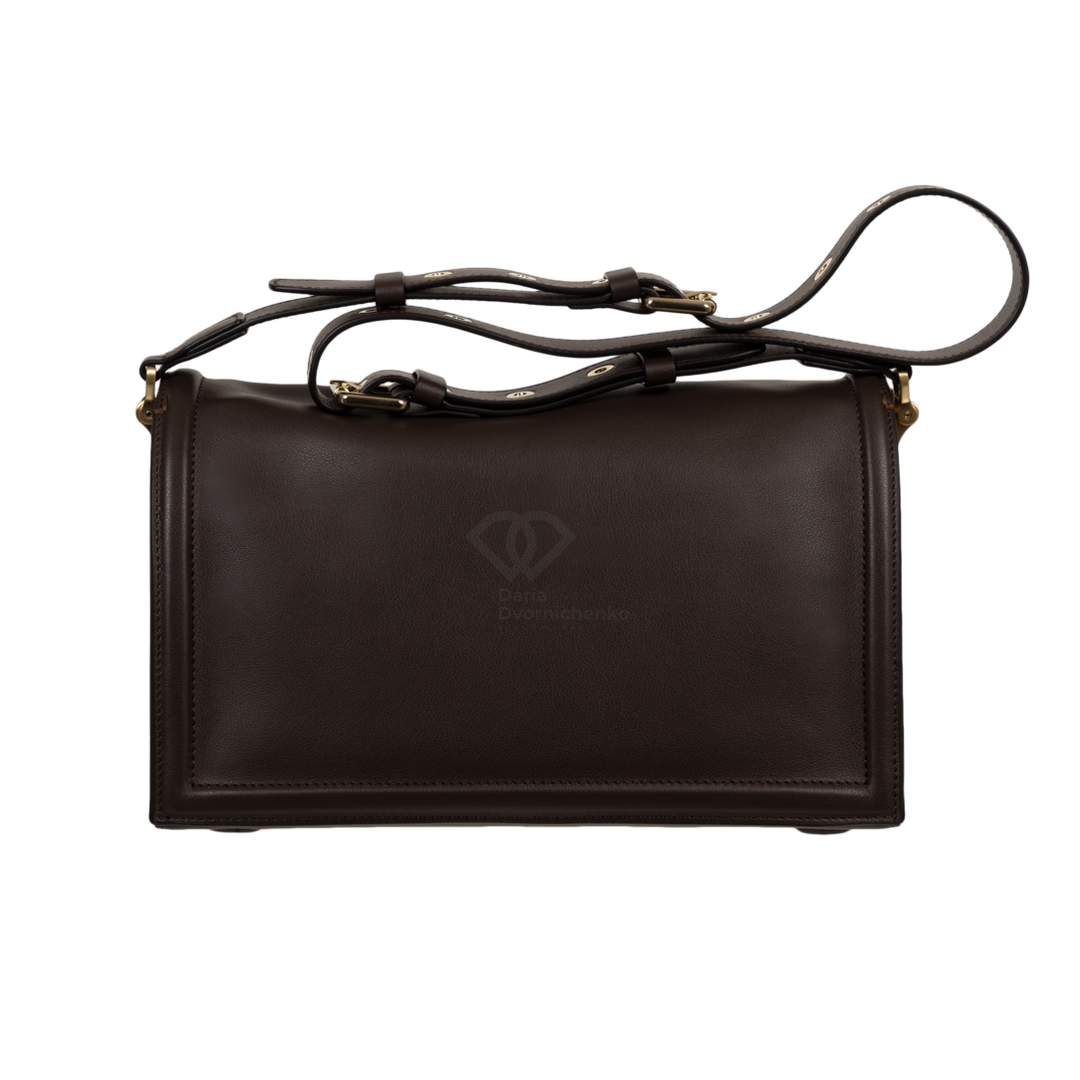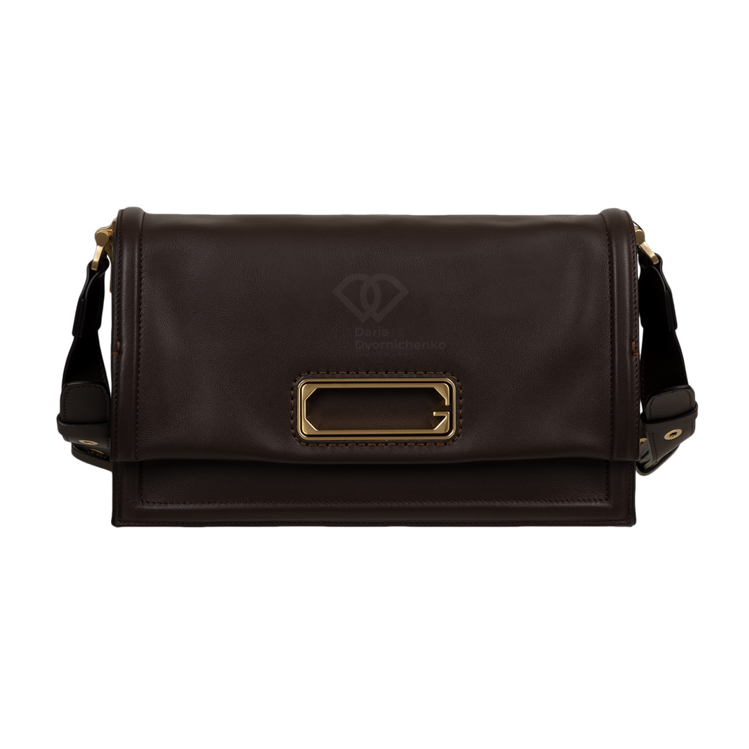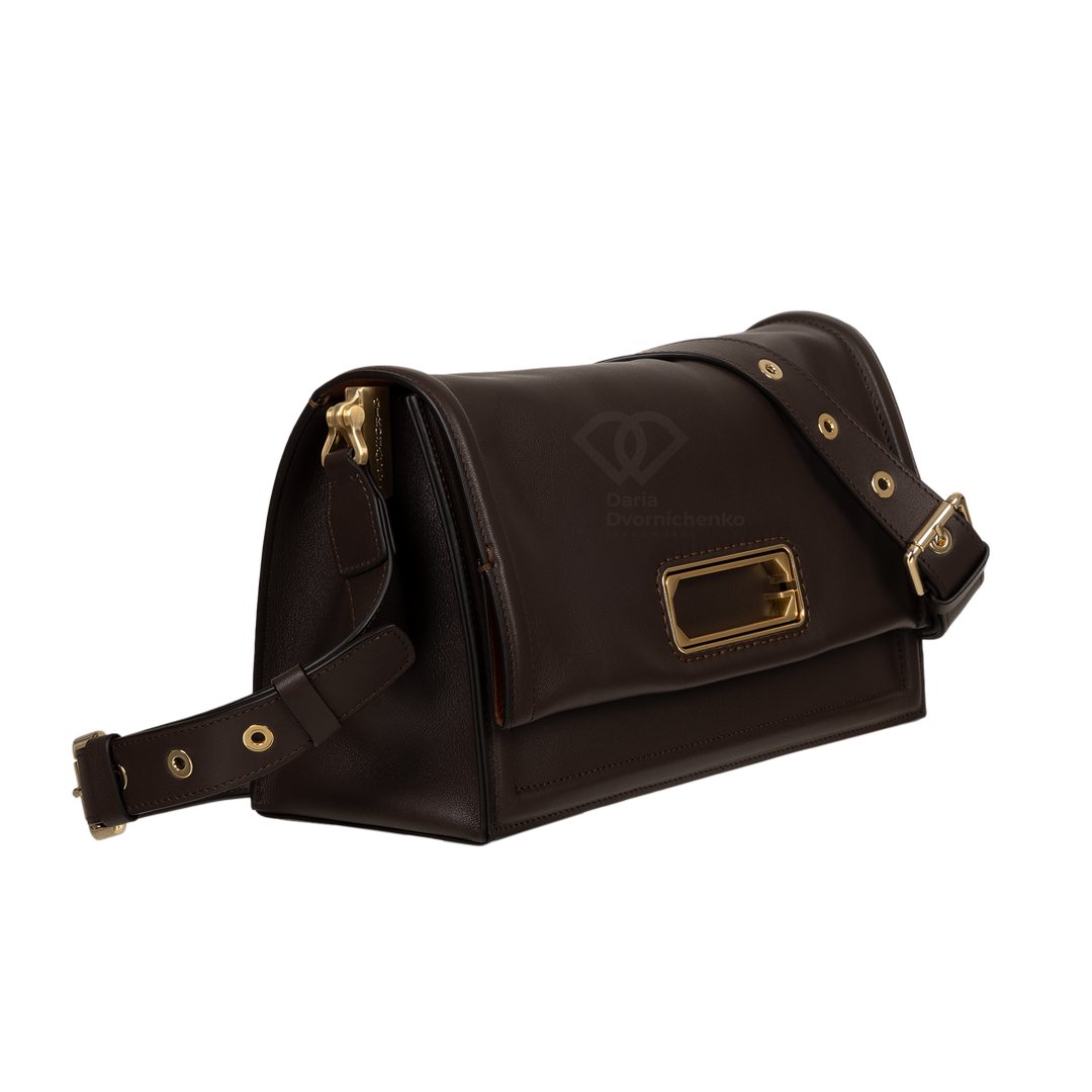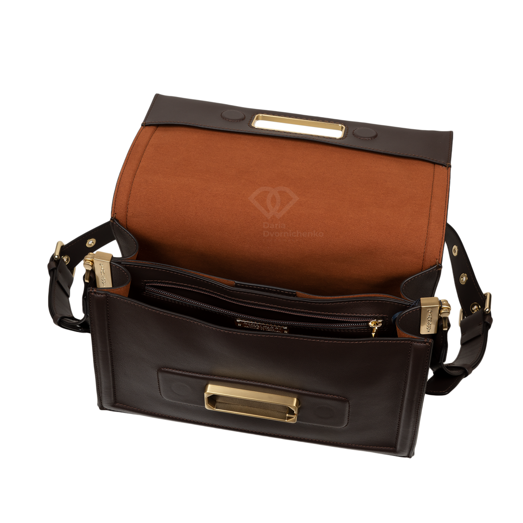 Элегантная сумочка выполнена из высококачественной кожи наппа, прямоугольная форма и четкие линии подчеркивают современный дизайн. Золотистые пряжки,замок и металлические элементы на ремешке и клапане придают изысканный акцент и дорогой вид. Закрывается на стильный клапан с золотистой металлической пластиной, которая служит центральным элементом дизайна. Внутренняя часть сумки отделана эффектной контрастной подкладкой из алькантары- добавляет изделию индивидуальности и стиля. Внутри 2 отделения, 1 карман на магнитах, 1 карман на молнии. Большой запас регулировки плечевого ремня до 135 см