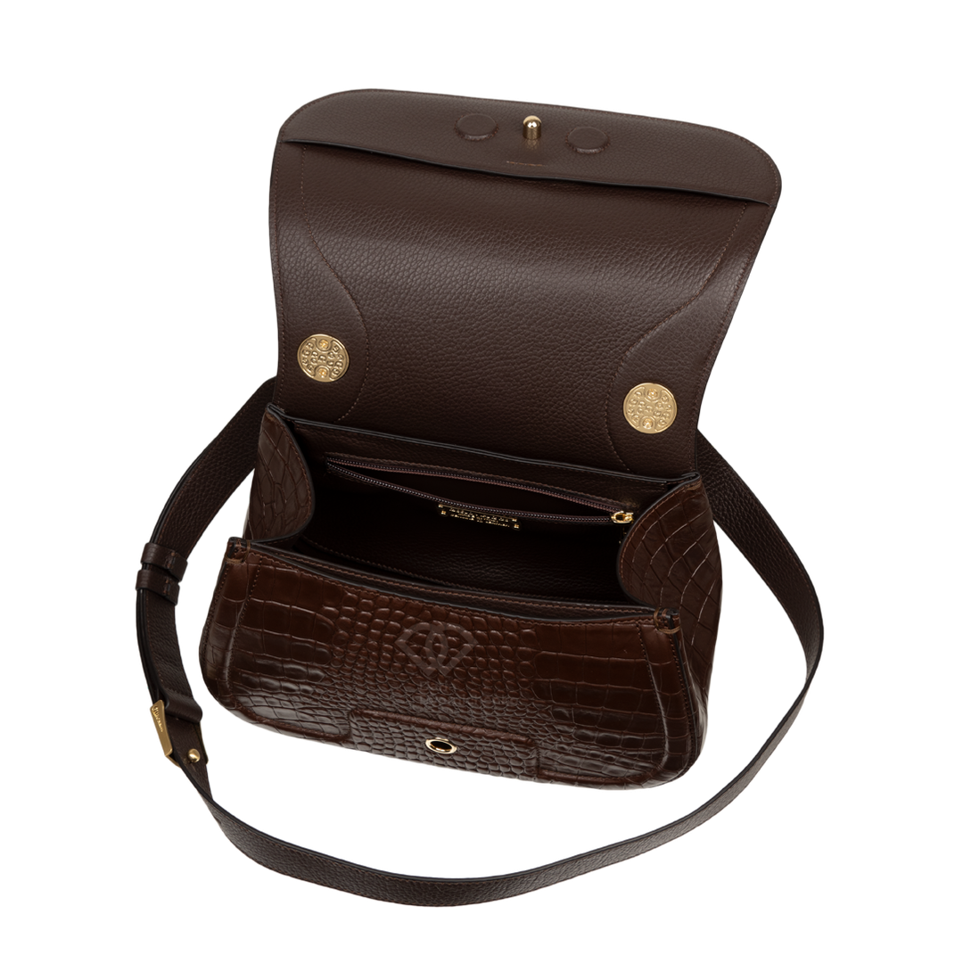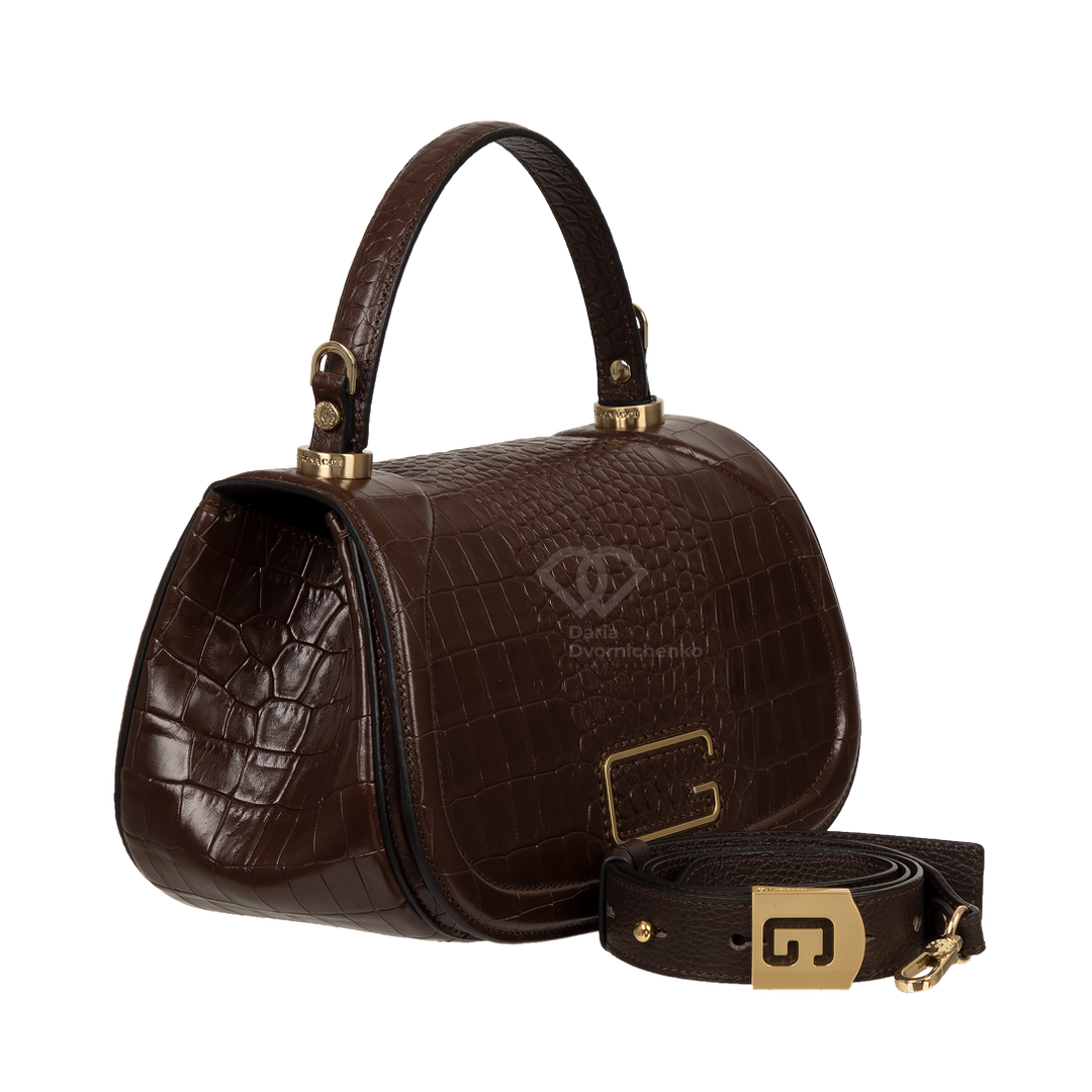 Кроссбоди выполнена из телячьей кожи с рельефным тиснением под крокодиловую кожу, она придает образу роскоши и индивидуальности. Изящная полукруглая форма со слегка изогнутым силуэтом придает сумке женственность и утонченность.Идеальный аксессуар для тех, кто ценит легкость и элегантность в повседневности. Металические элементы с тонким блеском подчёркивают качество и дизайн. Сумка оснащена удобной короткой ручкой и регулируемым плечевым ремешком. Внутри сумочка отделана гладкой подкладкой в тон основному цвету, основное отделение достаточно просторное для самых необходимых вещей.