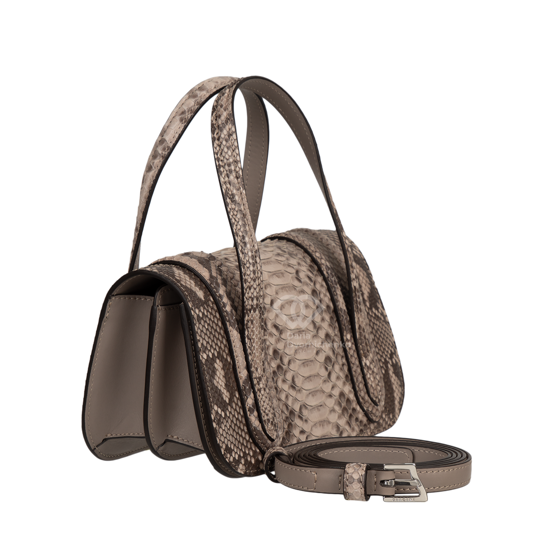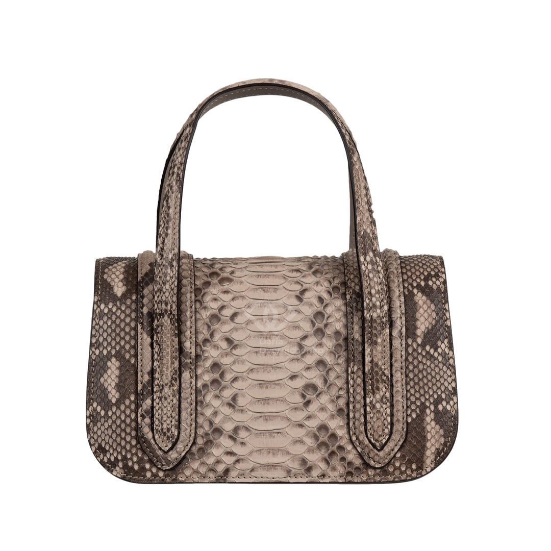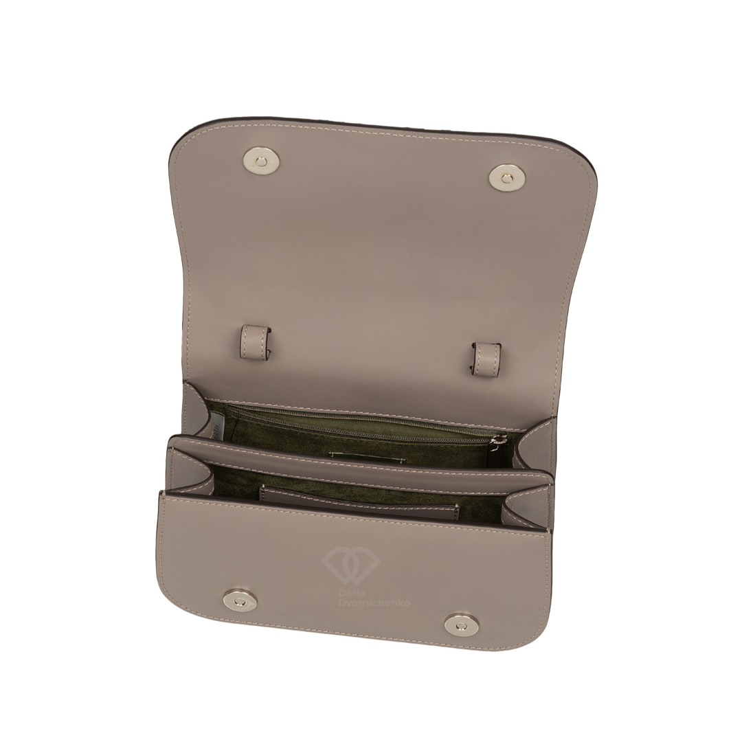 Кроссбоди Бониссима выполнена из комбинации высококачественной натуральной кожи: гладкая кожа нежного бежево-серого цвета используется для боковых частей и клапана, а центральная часть корпуса украшена вставкой из роскошной натуральной кожи питона с его неповторимым естественным узором. Сумка имеет структурированную форму с клапаном, который надежно фиксируется на двух металлических кнопках магнитах. Внутри находится хорошо организованно пространство с несколькими отделениями, что позволяет удобно разместить все необходимые мелочи. Внутренняя подкладка оливкового цвета добавляет контраста и практичности. Сумочка оснащена двумя удобными ручками для ношения в руке или на сгибе локтя. В комплекте так же идет съемный плечевой ремень из гладкой кожи, позволяющий носить сумку через плечо или как кроссбоди. Изящная серебристая фурнитура изящно дополняет образ сумки.