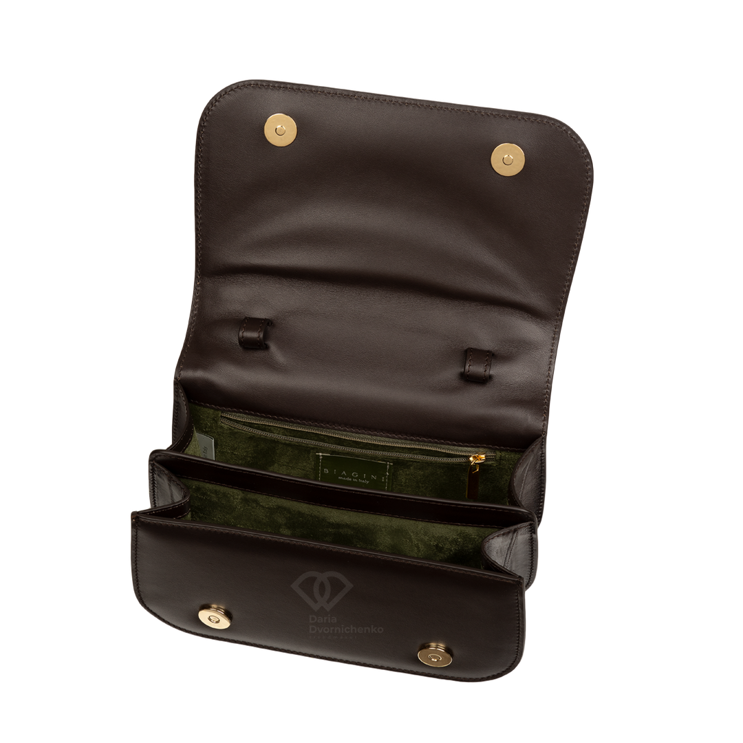 Кроссбоди Бониссима выполнена из натуральной кожи угря : гладкая кожа в тон используется для боковых частей и клапана, а центральная часть корпуса украшена вставкой из роскошной натуральной кожи угря с его неповторимым естественным узором. Сумка имеет структурированную форму с клапаном, который надежно фиксируется на двух металлических кнопках магнитах. Внутри находится хорошо организованно пространство с несколькими отделениями, что позволяет удобно разместить все необходимые мелочи. Внутренняя подкладка оливкового цвета добавляет контраста и практичности. Сумочка оснащена двумя удобными ручками для ношения в руке. В комплекте так же идет съемный плечевой ремень из гладкой кожи, позволяющий носить сумку через плечо или как кроссбоди.