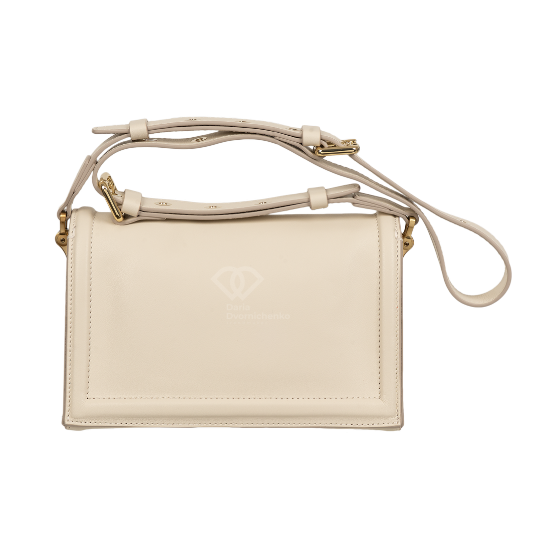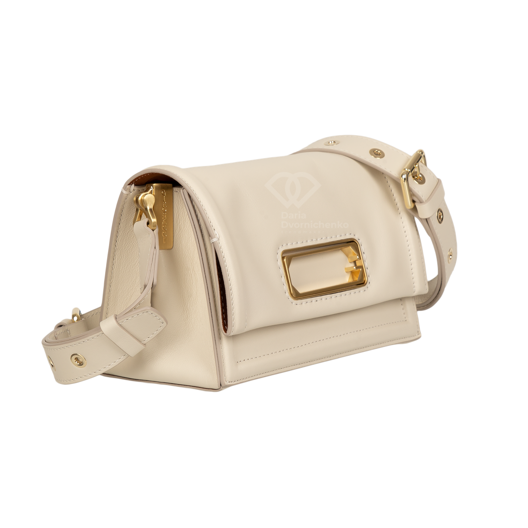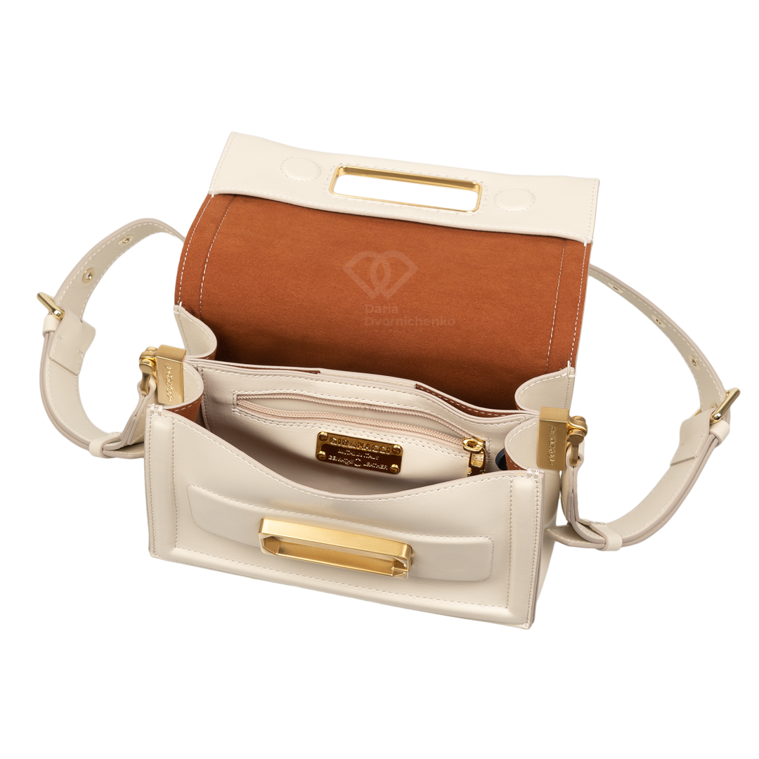 Элегантная сумочка выполнена из высококачественной кожи наппа, прямоугольная форма и четкие линии подчеркивают современный дизайн. Золотистые пряжки,замок и металлические элементы на ремешке и клапане придают изысканный акцент и дорогой вид. Закрывается на стильный клапан с золотистой металлической пластиной, которая служит центральным элементом дизайна. Внутренняя часть сумки отделана эффектной контрастной подкладкой из алькантары- добавляет изделию индивидуальности и стиля. Внутри 2 отделения, 1 карман на магнитах, 1 карман на молнии. Большой запас регулировки плечевого ремня до 135 см