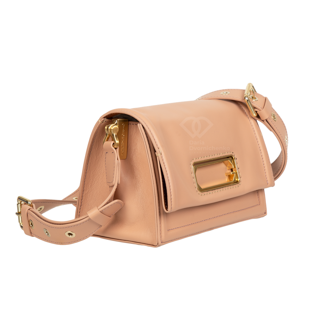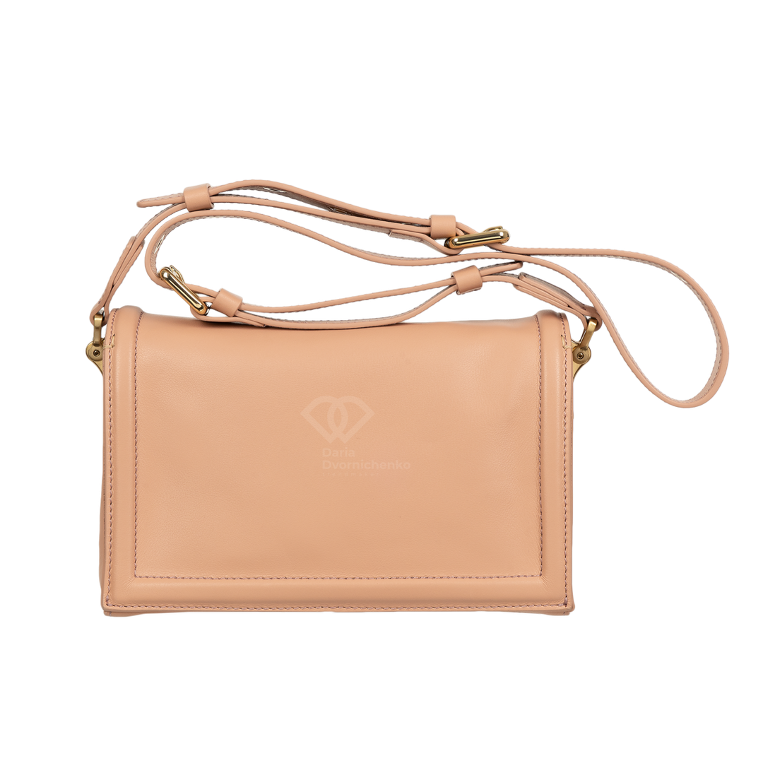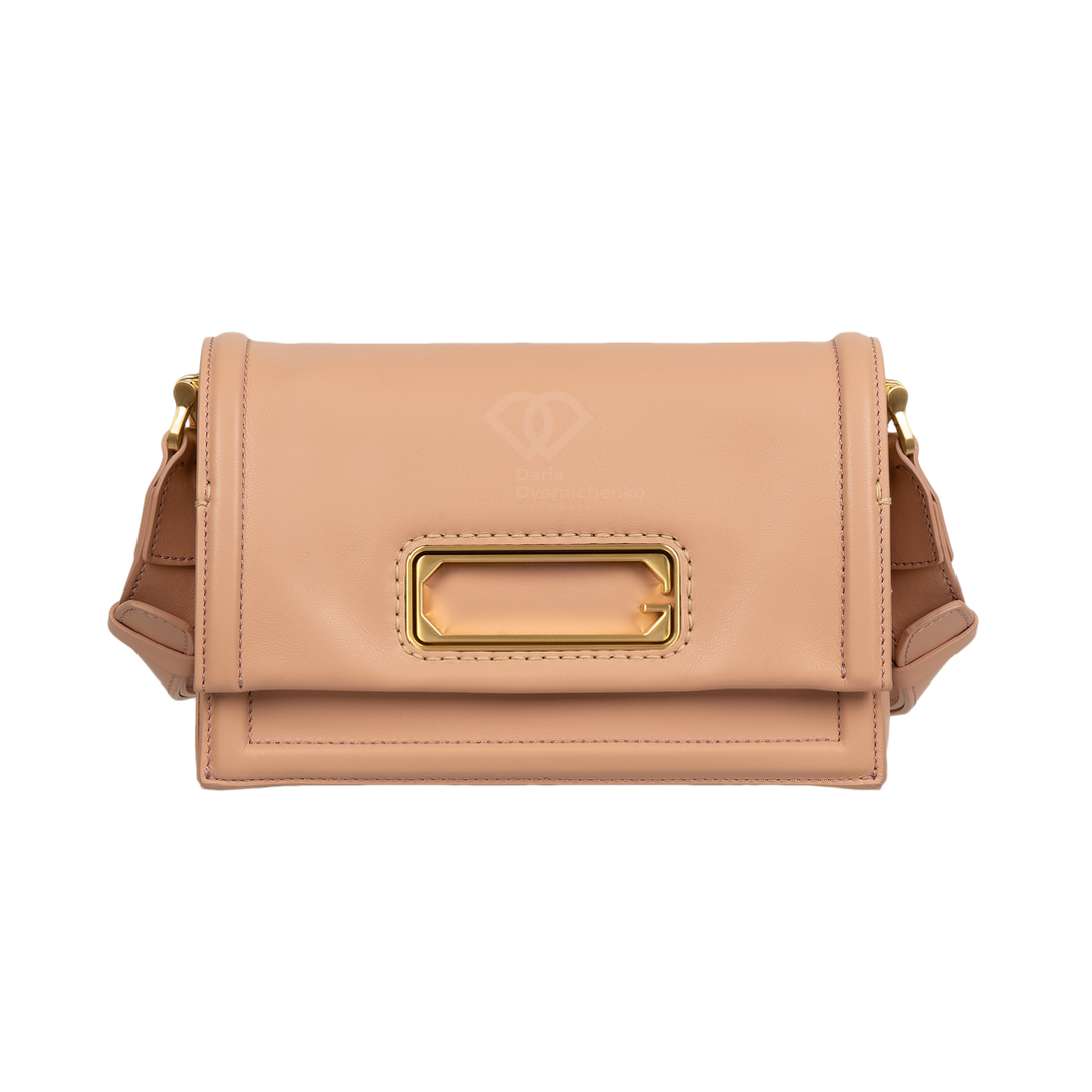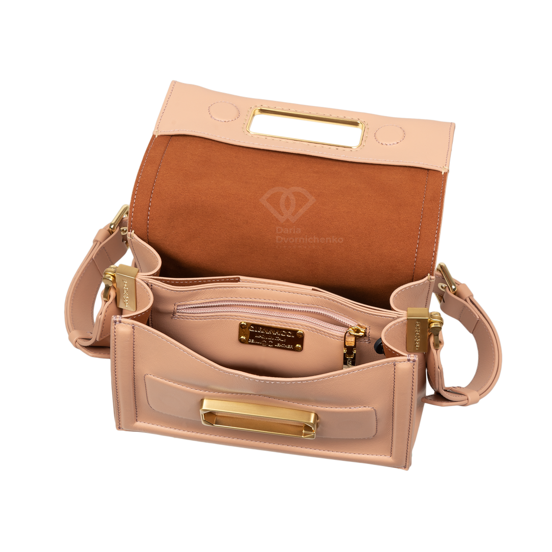 Элегантная сумочка выполнена из высококачественной кожи наппа, прямоугольная форма и четкие линии подчеркивают современный дизайн. Золотистые пряжки,замок и металлические элементы на ремешке и клапане придают изысканный акцент и дорогой вид. Закрывается на стильный клапан с золотистой металлической пластиной, которая служит центральным элементом дизайна. Внутренняя часть сумки отделана эффектной контрастной подкладкой из алькантары- добавляет изделию индивидуальности и стиля. Внутри 2 отделения, 1 карман на магнитах, 1 карман на молнии. Большой запас регулировки плечевого ремня до 135 см