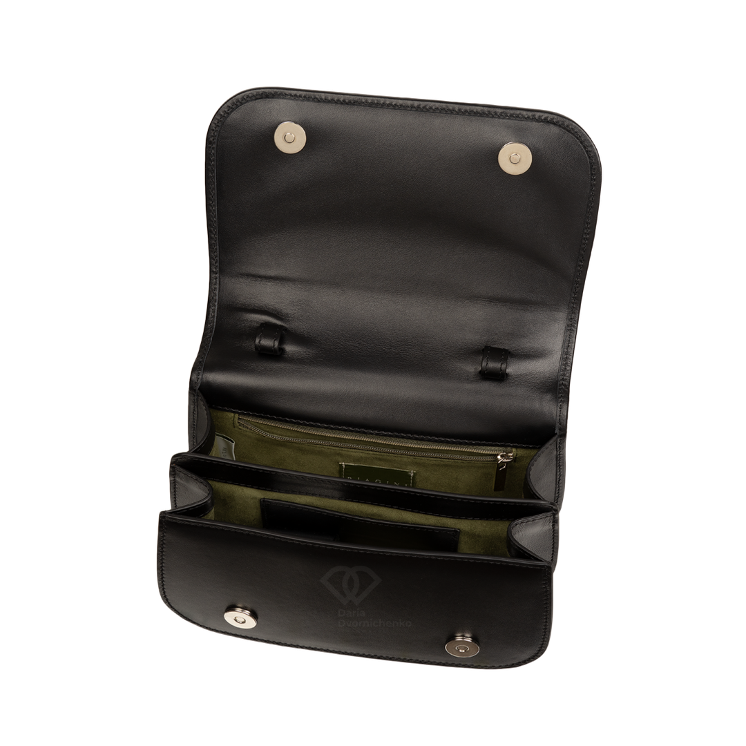 2 короткие ручки, 1 длинный ремень, внутри два отделения, два кармана, один из них на молнии