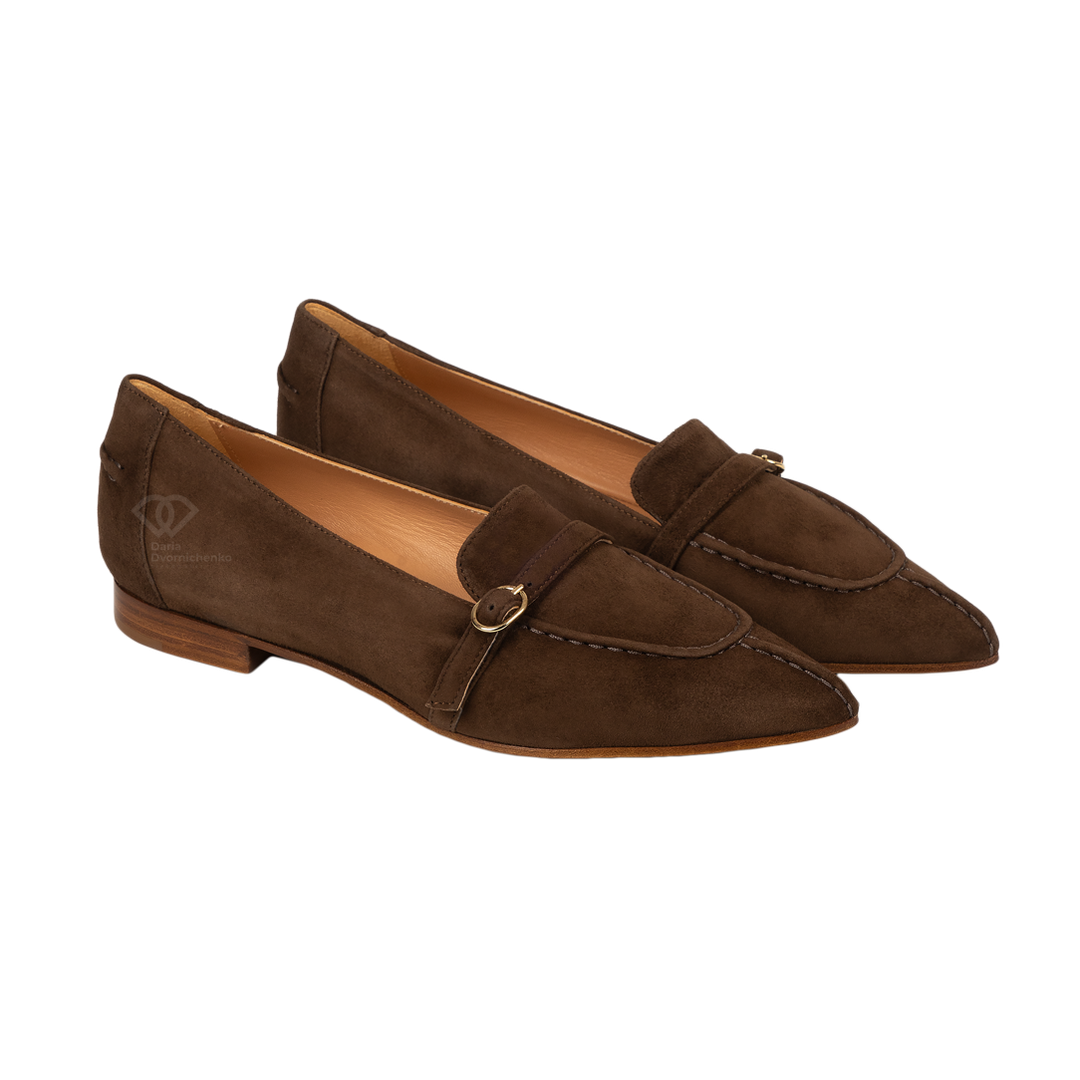 Модель изготовлена из мягкой натуральной замши глубокого кофейного оттенка.Декоративный шов на мысе и тонкий ремешок с золотистой пряжкой добавляют паре индивидуальности и элегантности.Заостренный носок придает традиционным лоферам более современный и женственный вид. Отличный выбор для создания стильных повседневных образов.