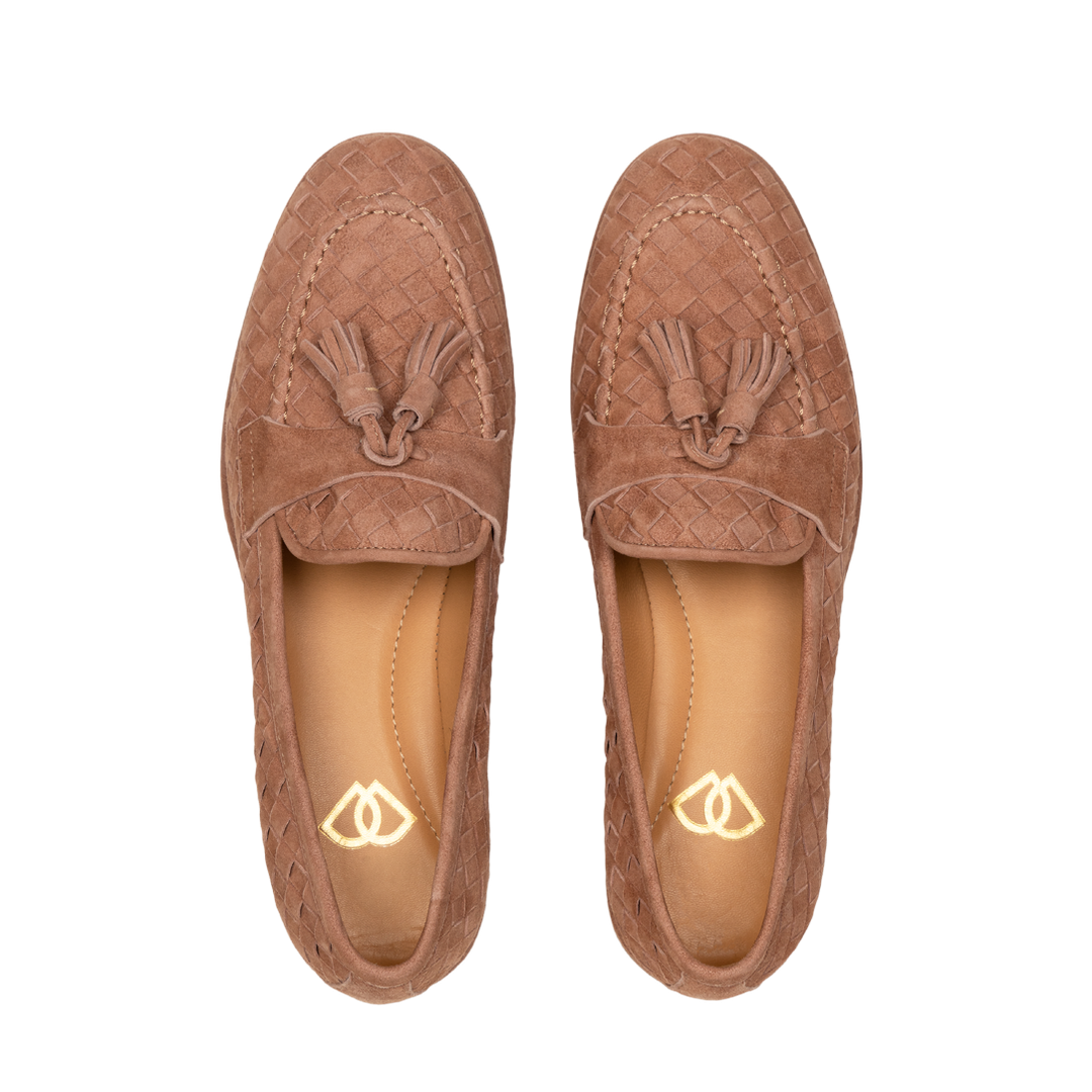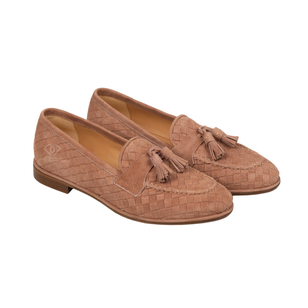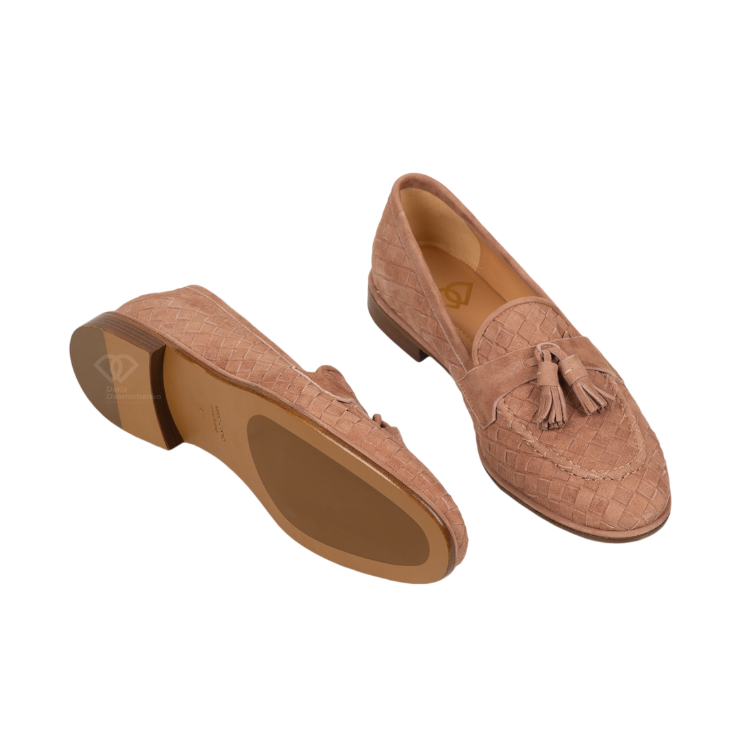 Модель выполнена из премиальной натуральной замши с уникальной плетеной фактурой, которая придает паре визуальный объем и элегантную мягкость. Плетение ручной работы (intreciato style) и классический силуэт с декоративными кисточками. Техника плетения не только эффектно выглядит, но и делает обувь более адаптивной — замша мягко облегает стопу, исключая натирание. Продуманная конструкция стельки и гибкая подошва снижают нагрузку на позвоночник при длительной ходьбе.