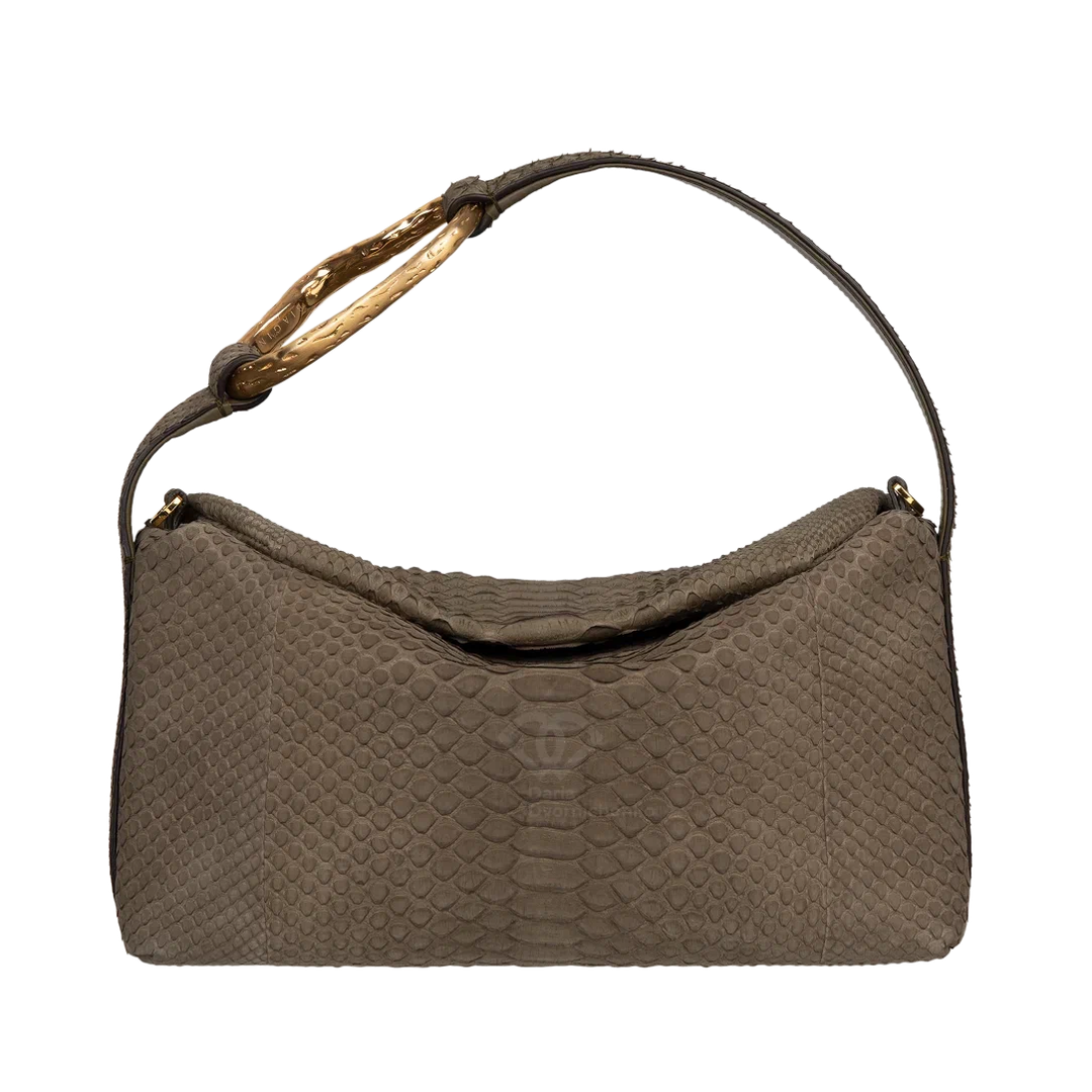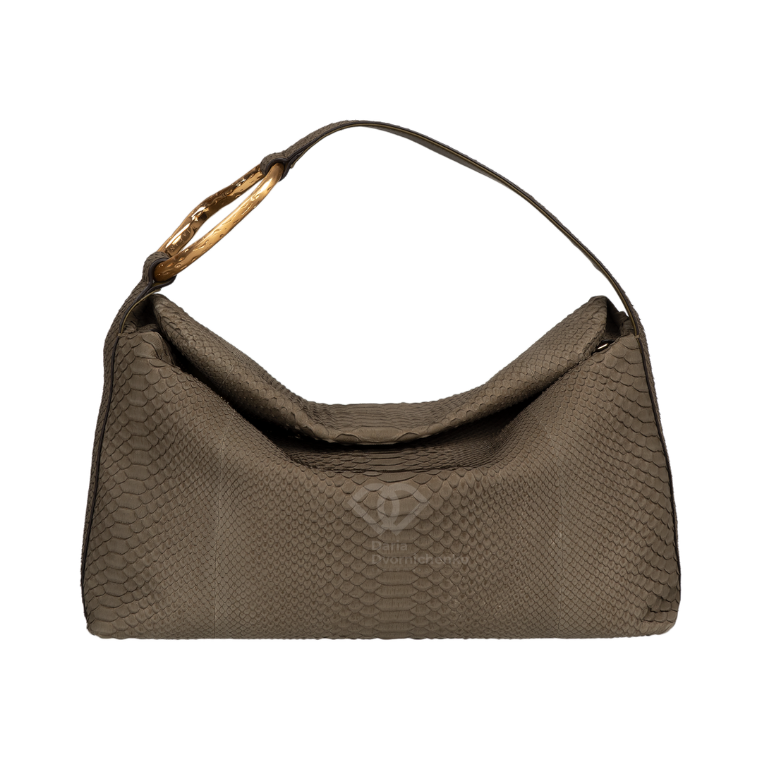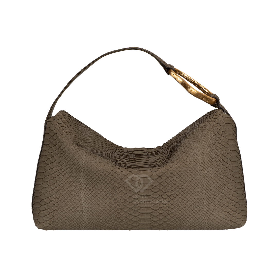 Сумочка выполнена из питона с велюровой фактурой -нубук. Внутри вместительное пространство, карман на молнии для мелких предметов. Съёмный и регулируемый ремень позволяет носить как классическую сумку в руке и через плечо. Золотистая фурнитура добавляет благородства, текстура кожи питона делает дизайн более выразительным. Модель выполнена в лаконичной форме с плавными линиями и легкой асимметрией, что придает аксессуару выразительность. Главный акцент- изящная ручка с золотистым металлическим декором создающая благородный контраст с мягкой текстурой сумки.
