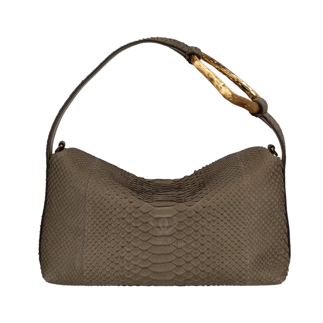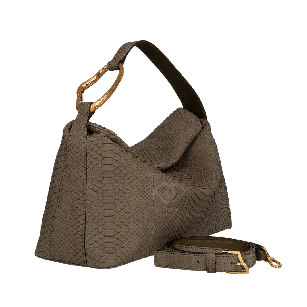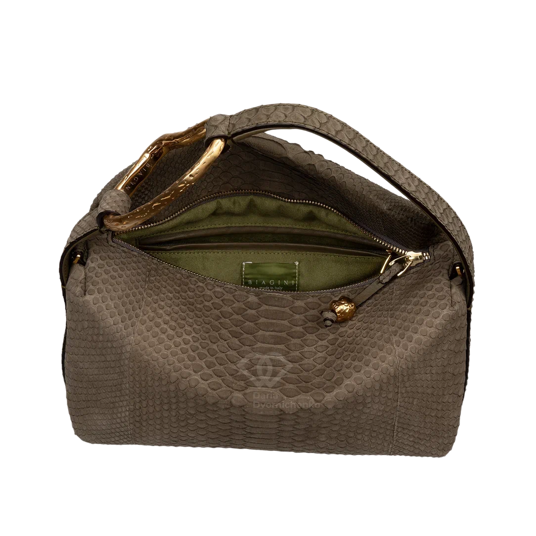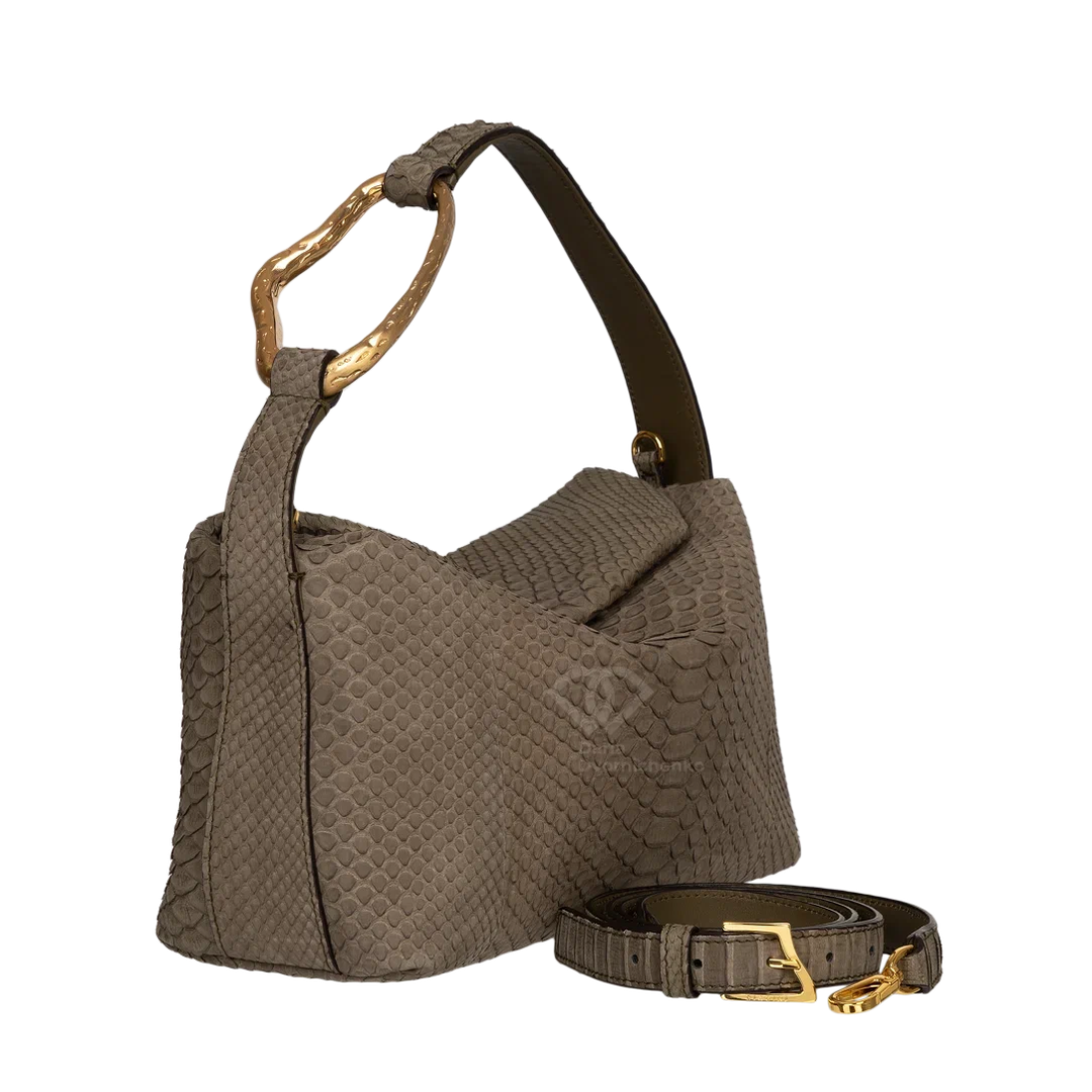 Сумочка выполнена из питона с велюровой фактурой -нубук. Внутри вместительное пространство, карман на молнии для мелких предметов. Съёмный и регулируемый ремень позволяет носить как классическую сумку в руке и через плечо. Золотистая фурнитура добавляет благородства, текстура кожи питона делает дизайн более выразительным. Модель выполнена в лаконичной форме с плавными линиями и легкой асимметрией, что придает аксессуару выразительность. Главный акцент- изящная ручка с золотистым металлическим декором создающая благородный контраст с мягкой текстурой сумки.