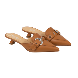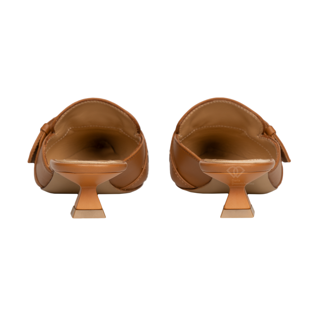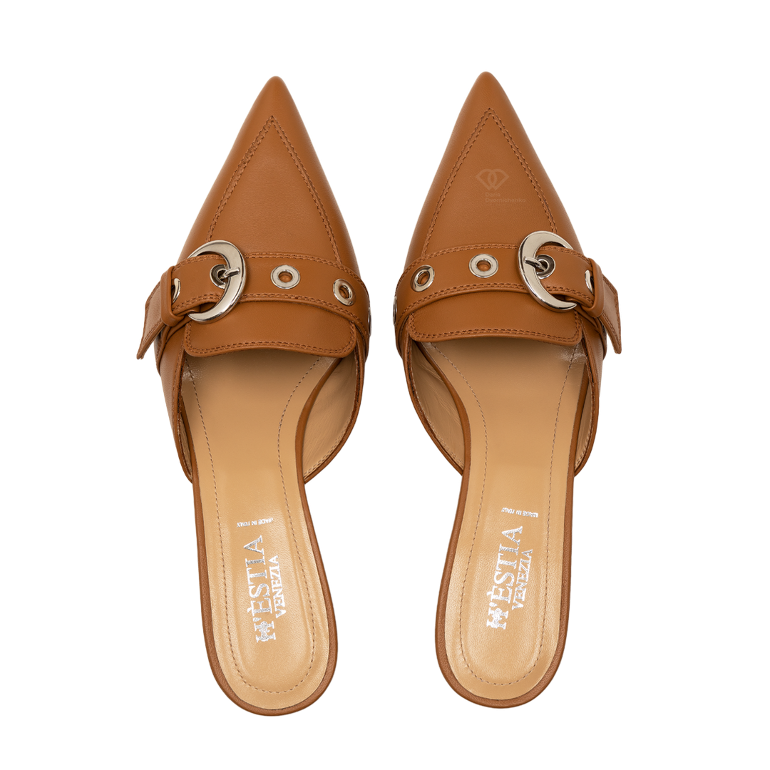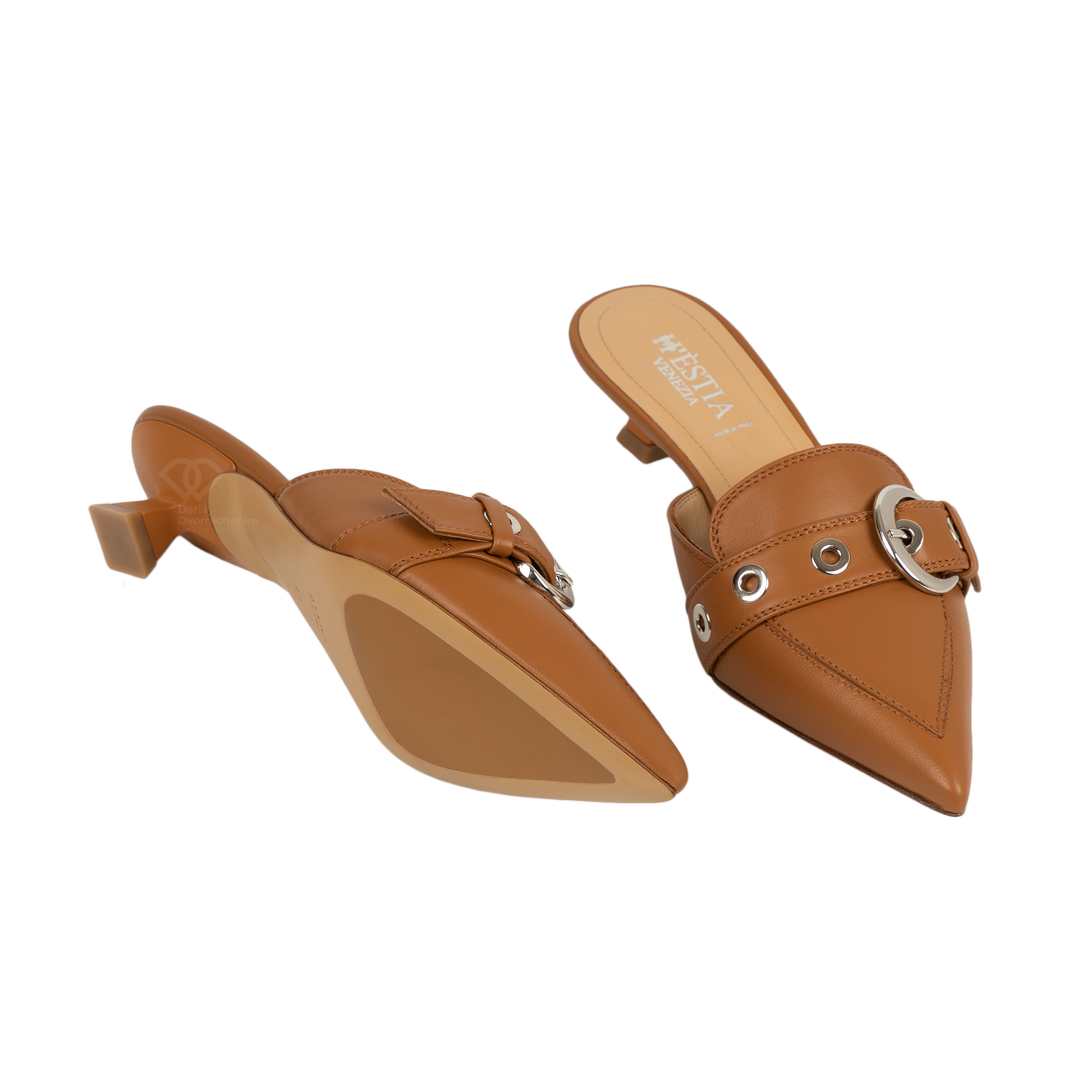 Эти элегантные мюли — идеальное сочетание венецианского стиля и современного комфорта. Насыщенный карамельный оттенок и дерзкая фурнитура делают их ярким акцентом как для делового образа, так и для вечернего выхода.Главная особенность модели — широкий ремешок с массивной серебристой пряжкой и люверсами, которые придают обуви современный характер с легким налетом стиля гранж.Острый мыс , визуально удлиняет силуэт.