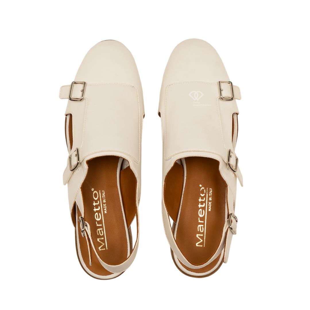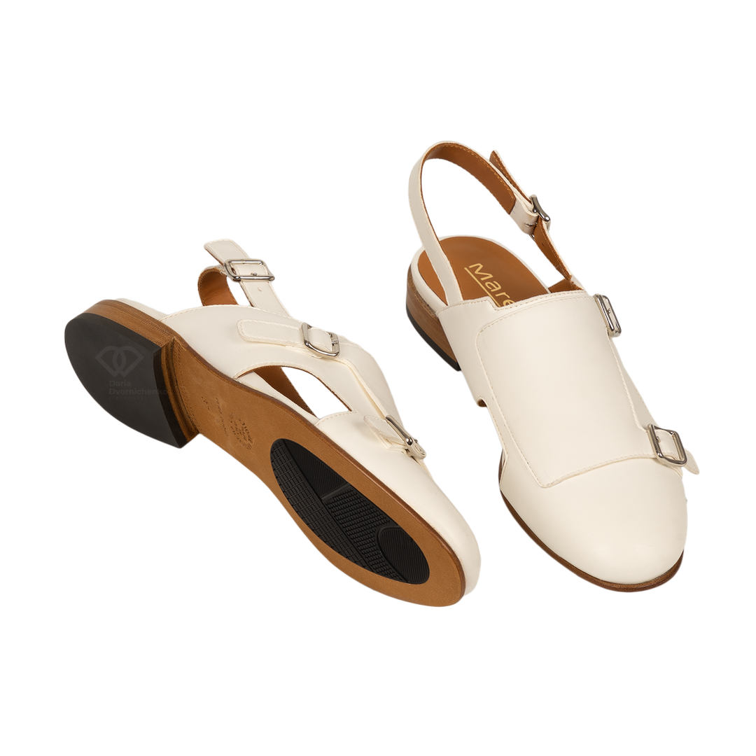 Лаконичная форма, вдохновленная мужскими лоферами или монками, в сочетании с открытой пяткой создает ультрамодный и свежий силуэт для летнего сезона.Кипенно-белый — освежает любой образ и подчеркивает загар.Два функциональных ремешка с серебристыми пряжками позволяют регулировать подъем.Стелька и подкладка из кожи коньячного оттенка создают эффектный контраст.