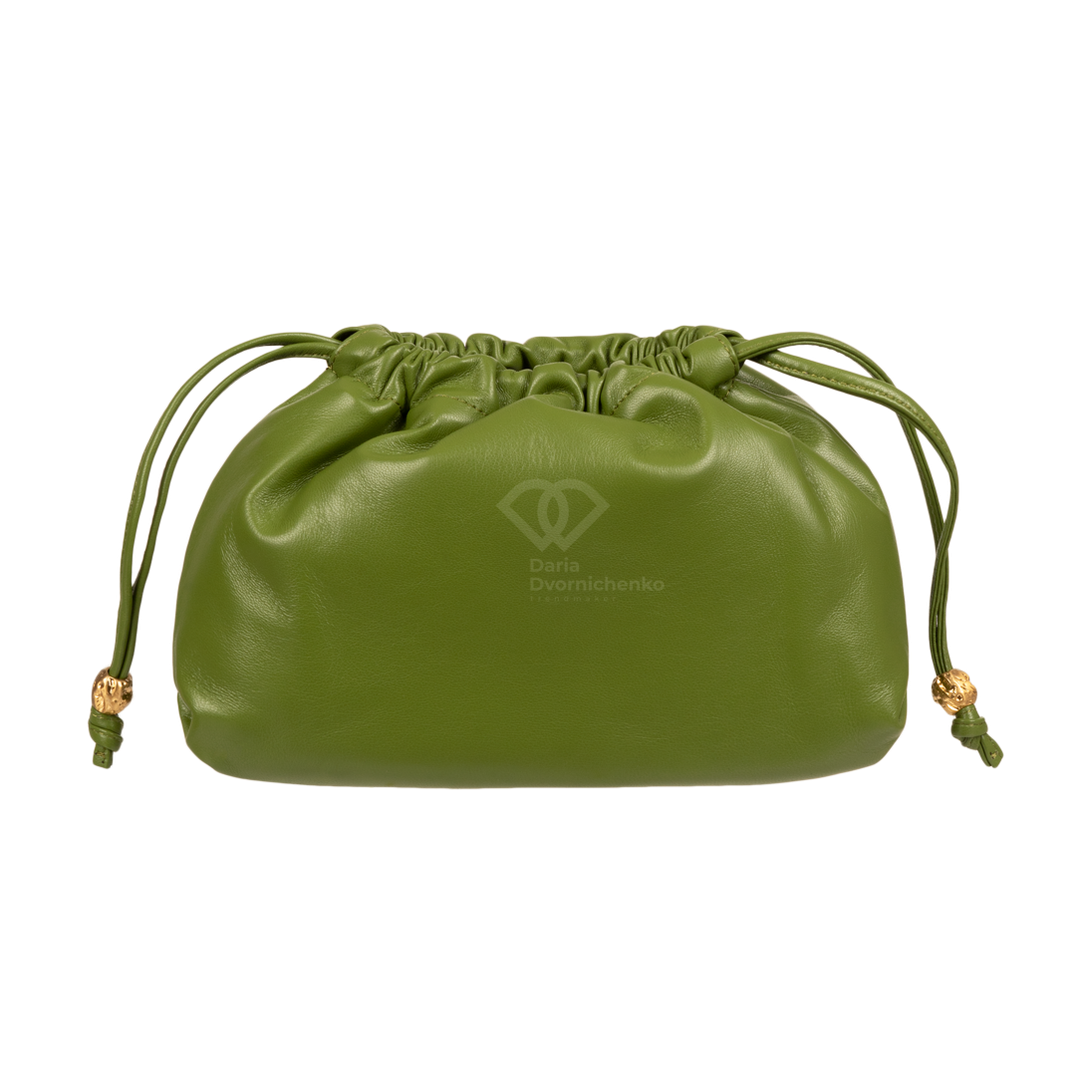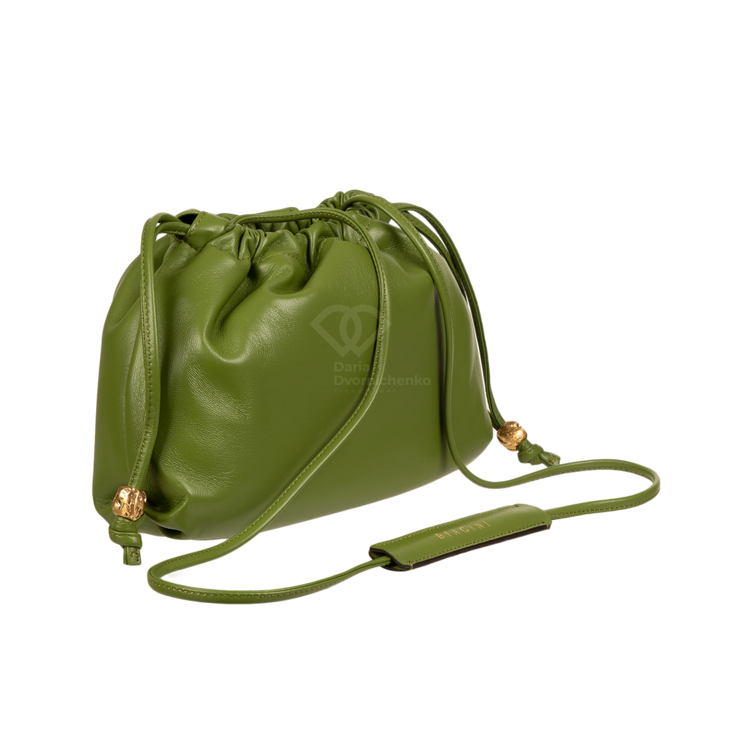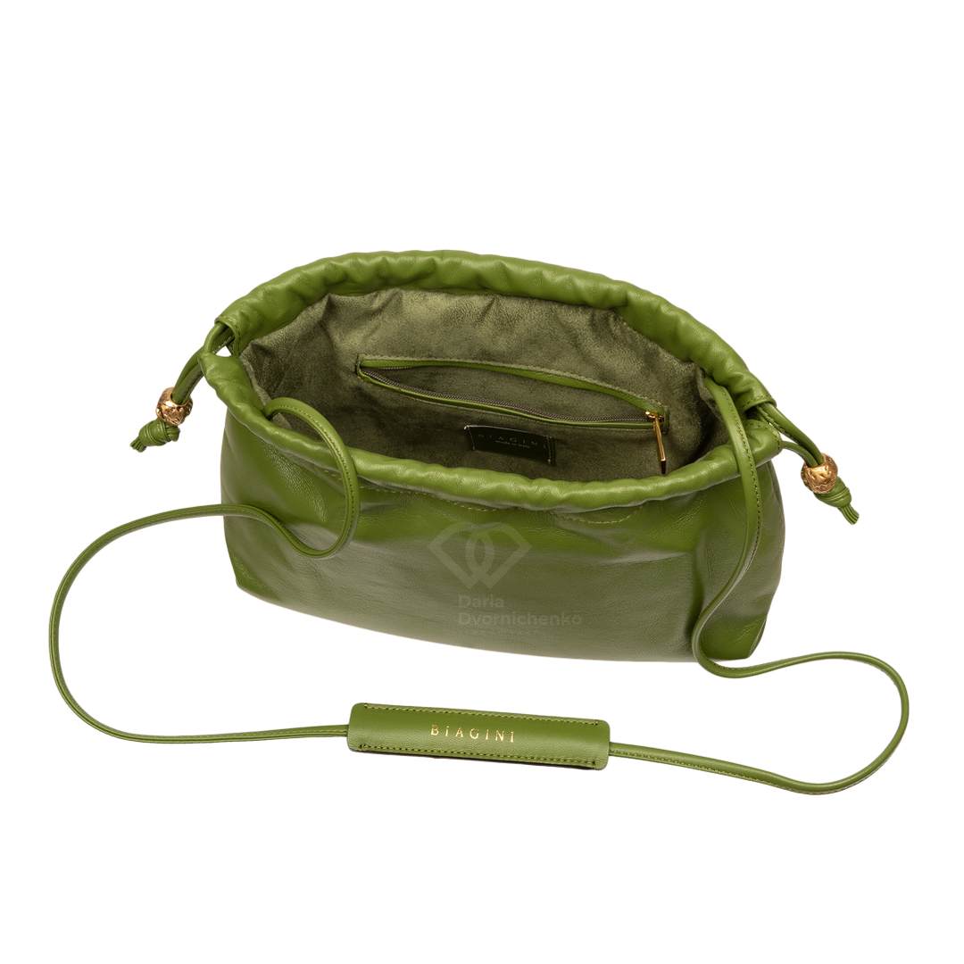 Сумочка выполнена полностью из высококачественной натуральной кожи. Внутри подкладка из алькантары, одно основное отделение, обеспечивающее достаточное пространство для хранения вещей, предусмотрены внутренний карманы , один из них на молнии. Модель в форме мешка затягивается на кожаные шнурки с элегантными золотистыми металлическими бусинами , что не только обеспечивает удобное закрытие, но и служит стильным декоративным элементом. Сумка оснащена длинным тонким плечевым ремнем из кожи с мягким наплечником для комфортного ношения.