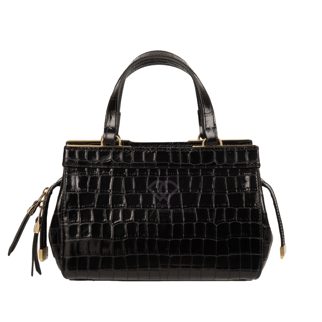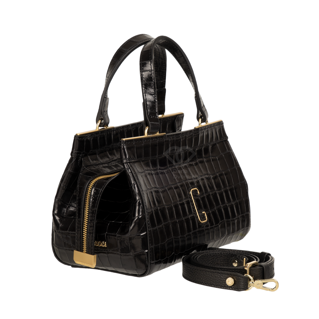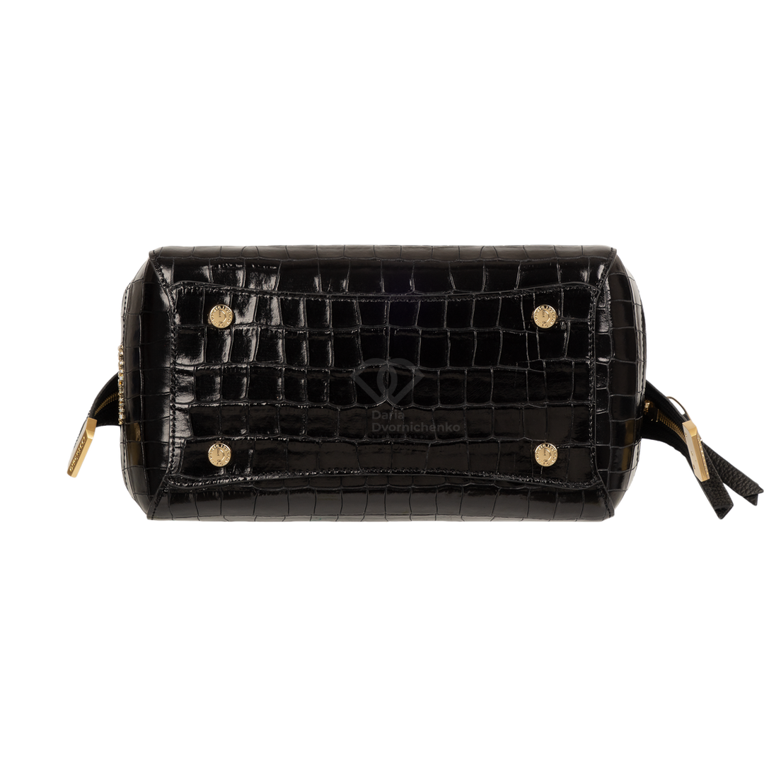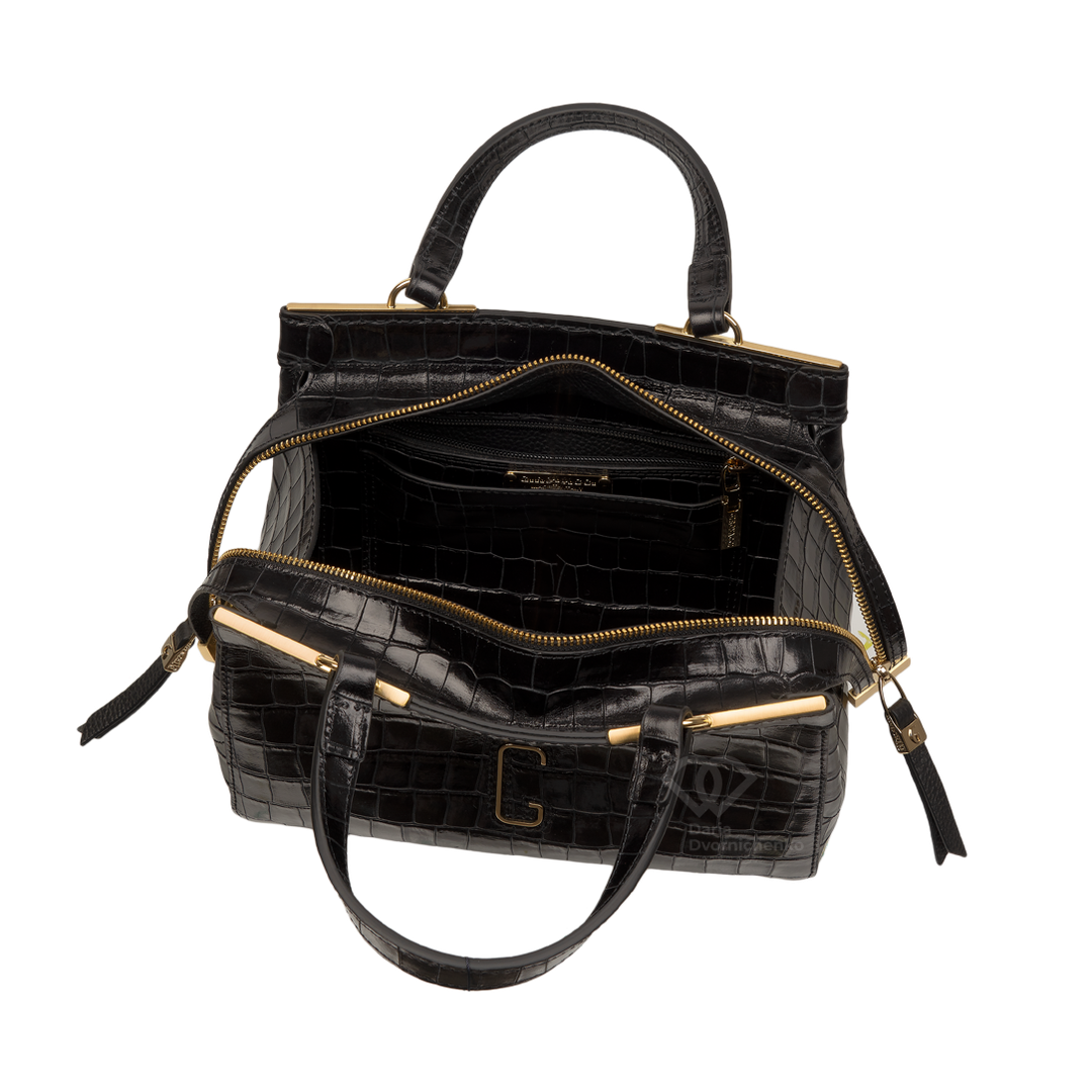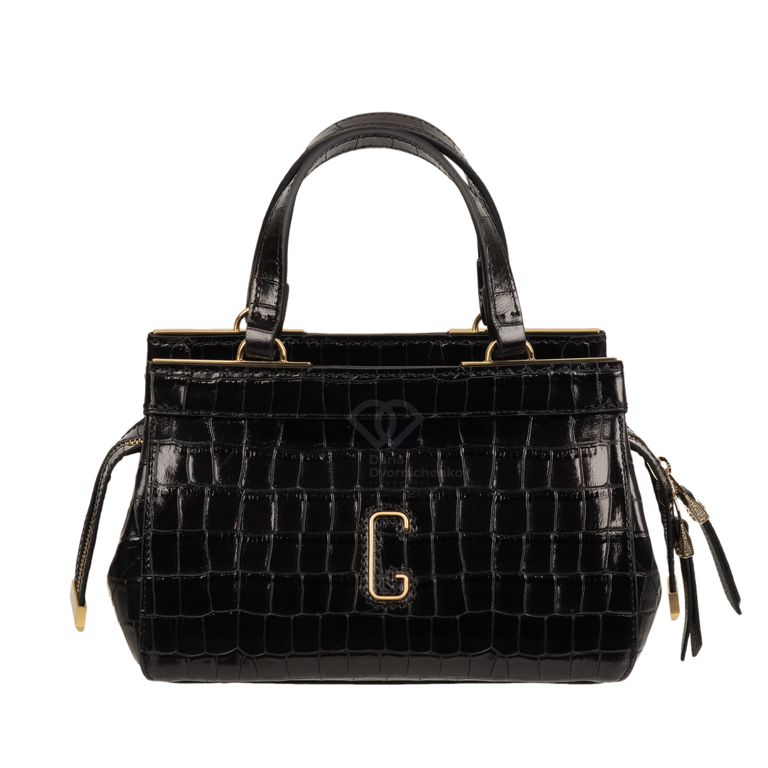 Сумка-саквояж выполнена из качественной кожи с эффектным тиснением под кожу крокодила, что придает образу особую глубину и премиальность. Жесткий каркас отлично держит форму, подчеркивая архитектурный силуэт сумки. Удобные двойные ручки позволяют комфортно носить сумку в руке или на сгибе локтя. В комплекте (опционально) идет наплечный ремень.