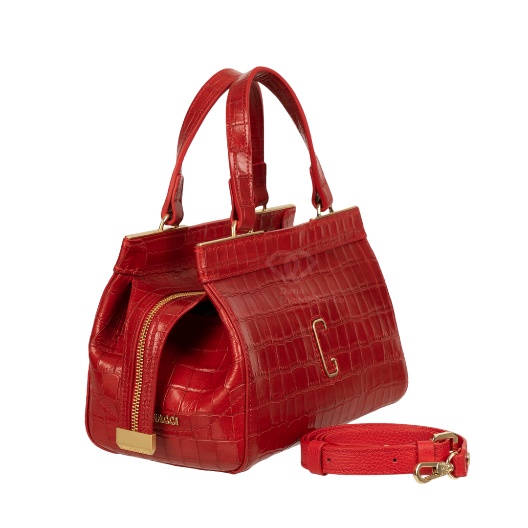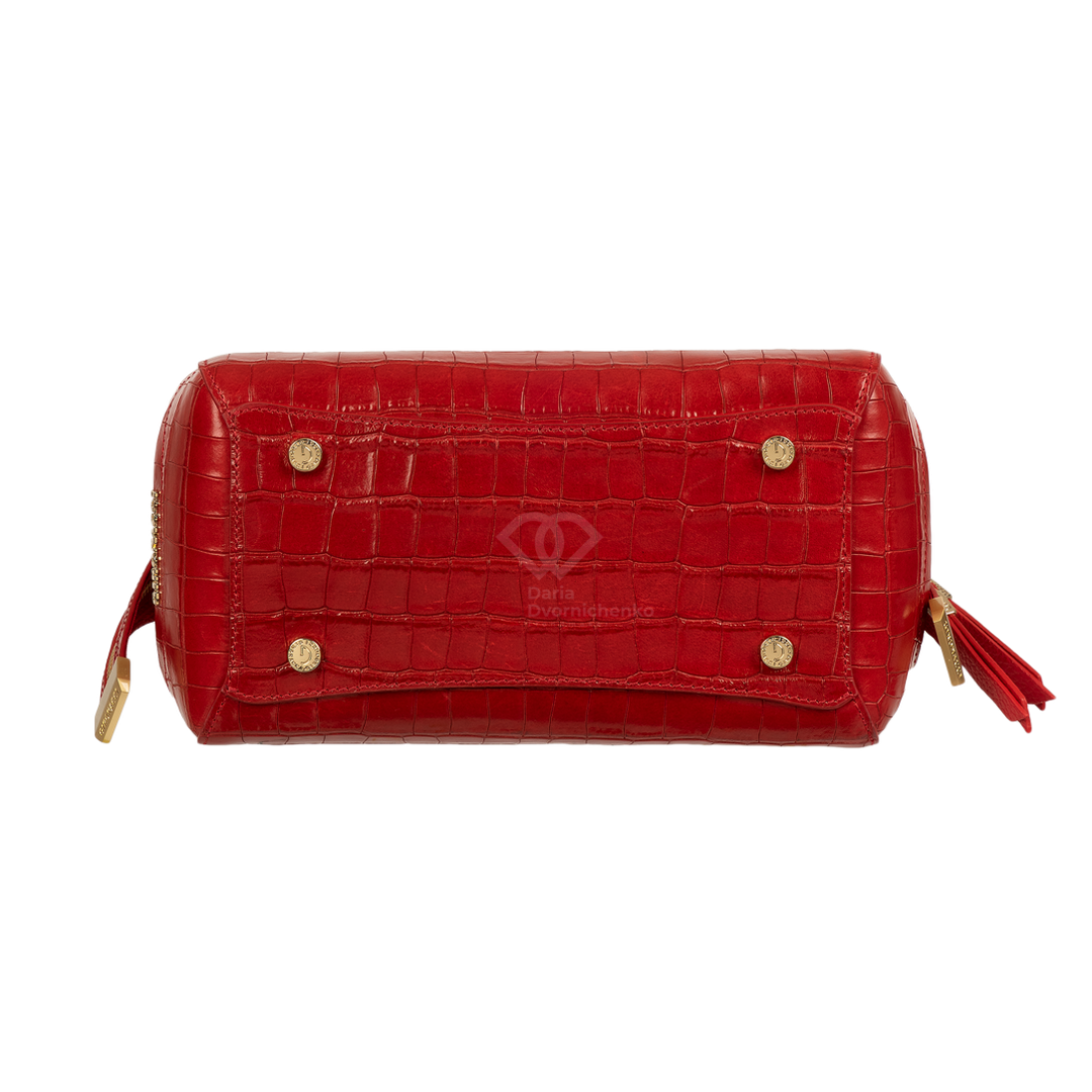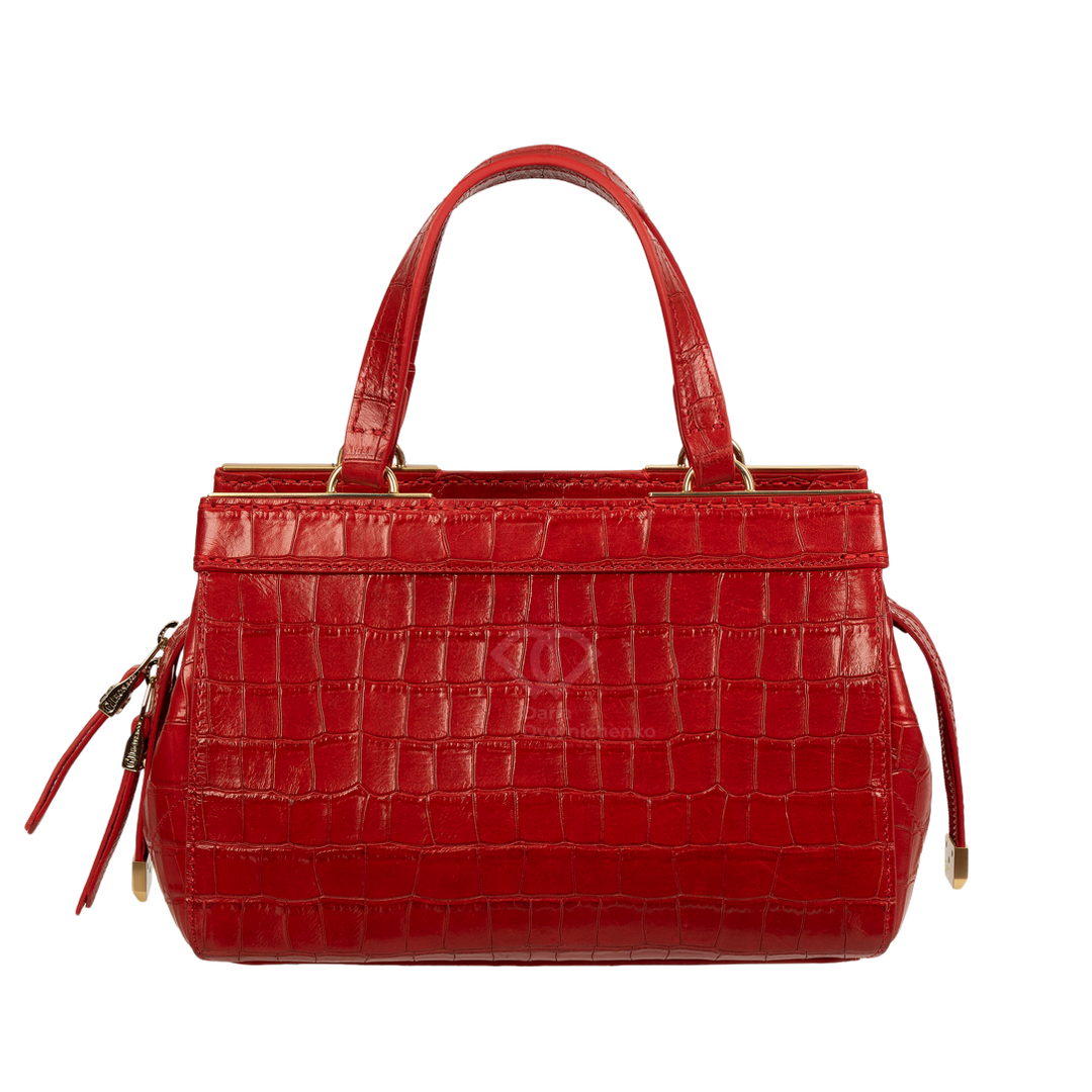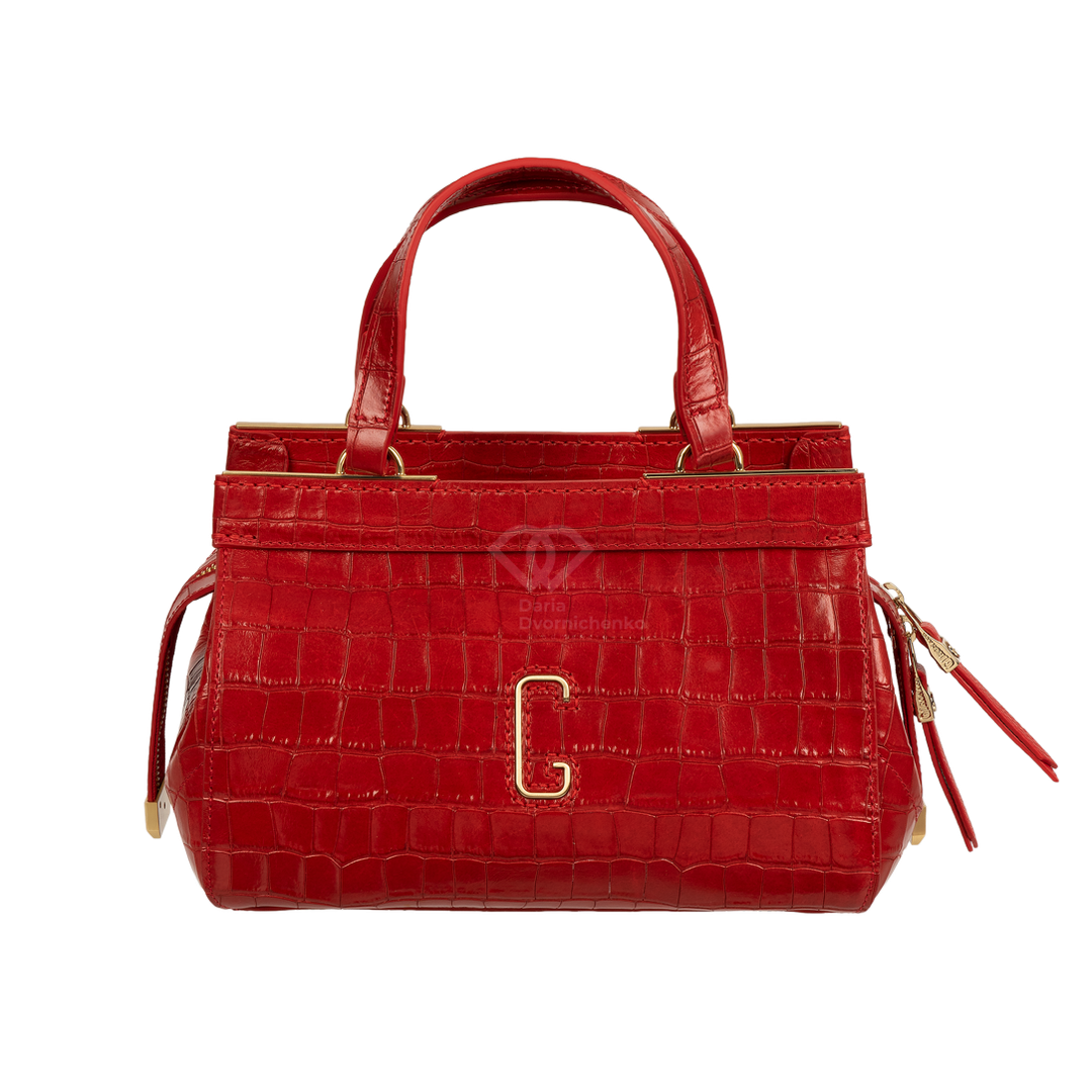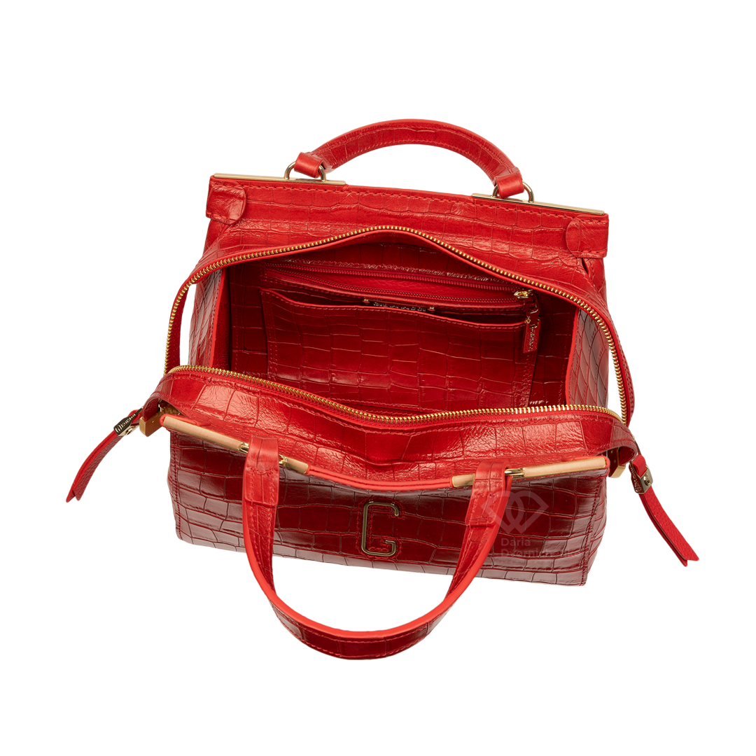 Сумка-саквояж выполнена из качественной кожи с эффектным тиснением под кожу крокодила, что придает образу особую глубину и премиальность. Жесткий каркас отлично держит форму, подчеркивая архитектурный силуэт сумки. Удобные двойные ручки позволяют комфортно носить сумку в руке или на сгибе локтя. В комплекте (опционально) идет наплечный ремень.