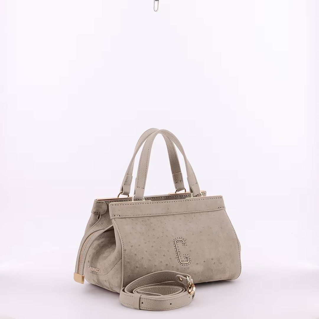 Саквояж выполнен из премиальных материалов с фактурой «под страуса», что придает изделию особую глубину и текстурность. Лаконичный силуэт с четкими линиями и расширяющимися боковинами, боковая часть которых дополнена золотистой молнией. Удобные двойные ручки для ношения в руке и съемный, регулируемый плечевой ремень.