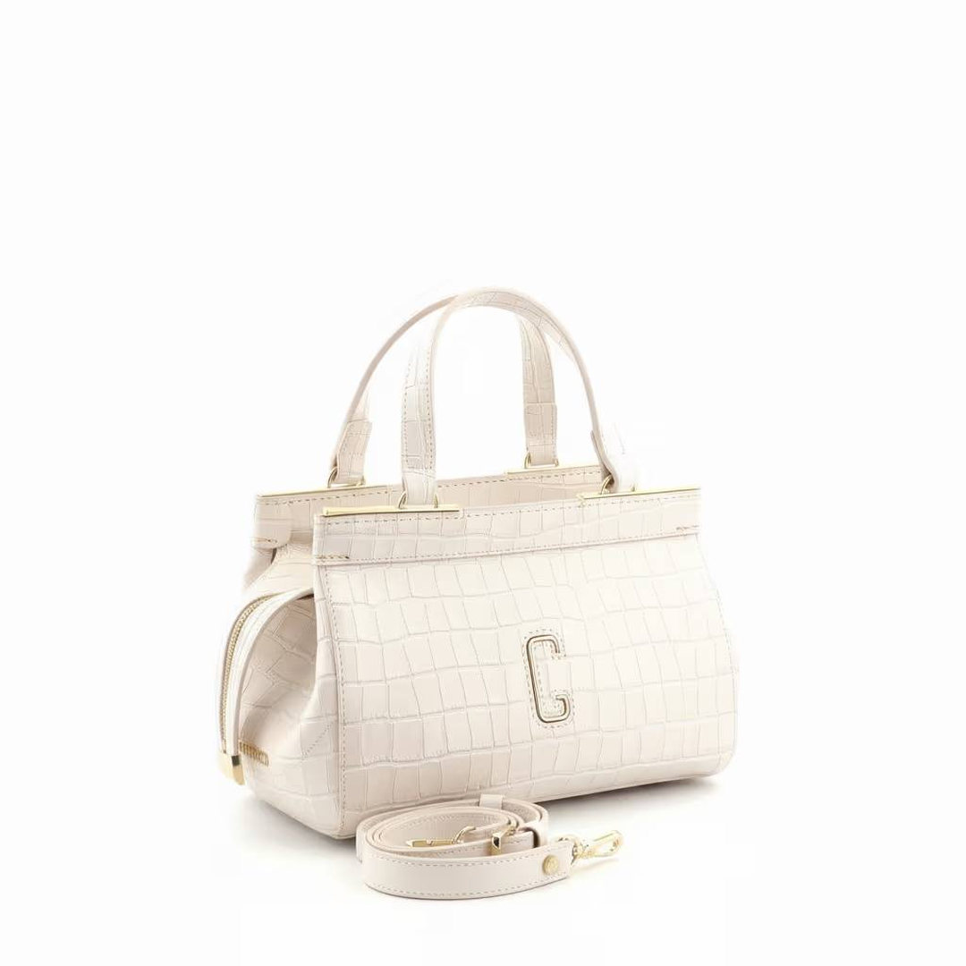 Саквояж выполнен из глянцевой кожи с глубоким тиснением под крокодила. Компактный, но структурированный силуэт с расширяющимися боками делает его удобным для хранения необходимых мелочей.Жесткие короткие ручки позволяют носить сумку в руках, а входящий в комплект съемный регулируемый ремень — на плече.