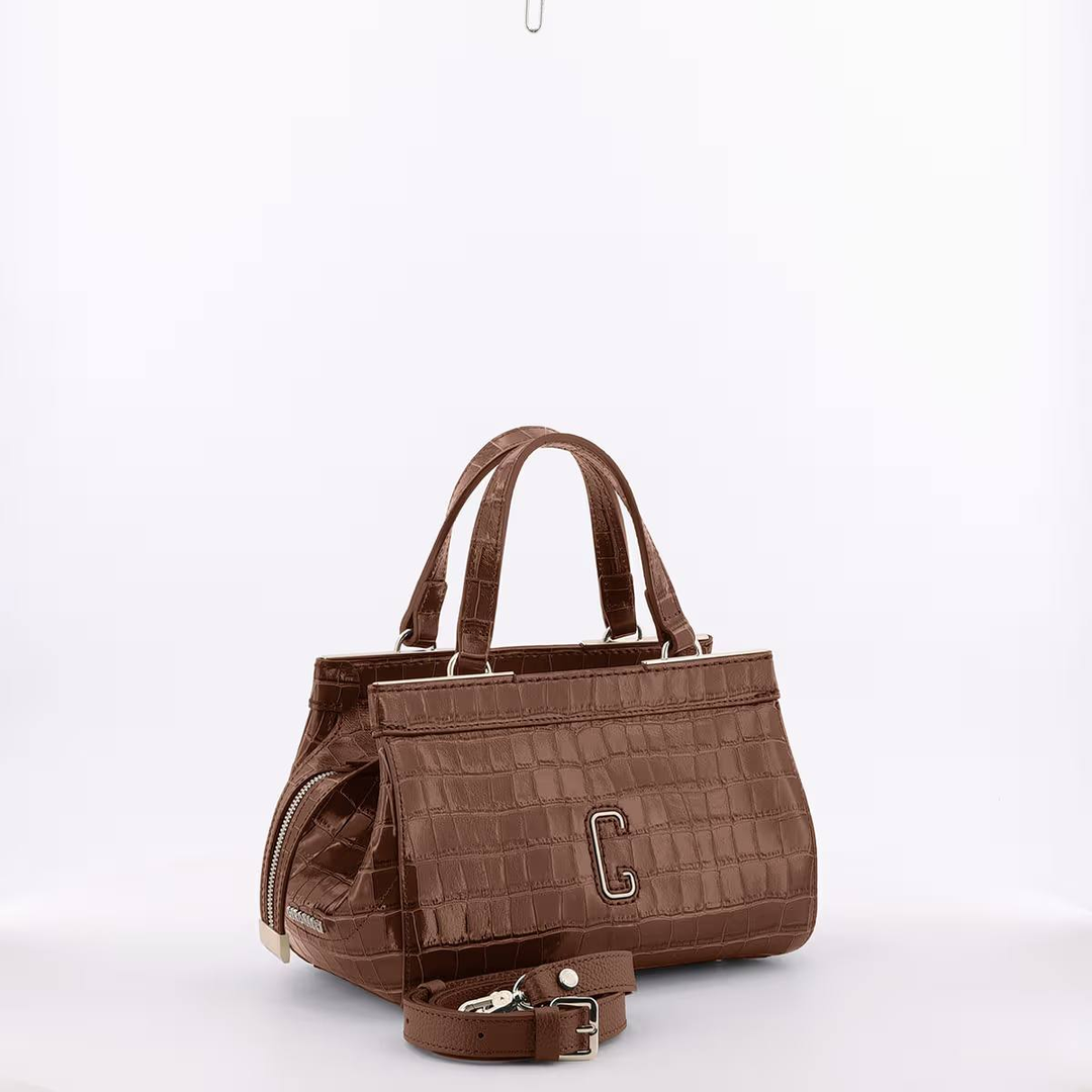 Саквояж выполнен из глянцевой кожи с глубоким тиснением под крокодила. Компактный, но структурированный силуэт с расширяющимися боками делает его удобным для хранения необходимых мелочей.Жесткие короткие ручки позволяют носить сумку в руках, а входящий в комплект съемный регулируемый ремень — на плече.