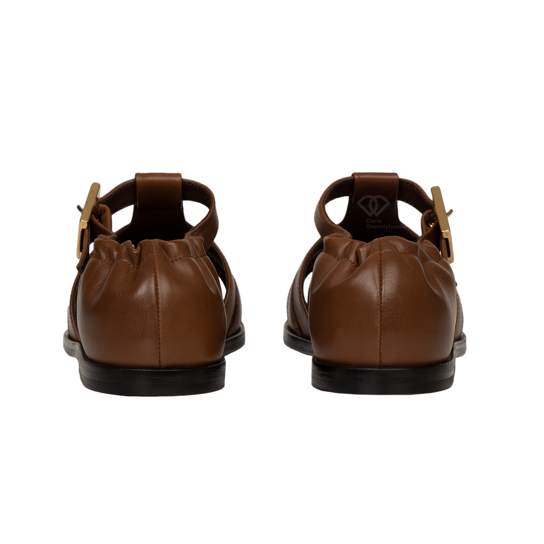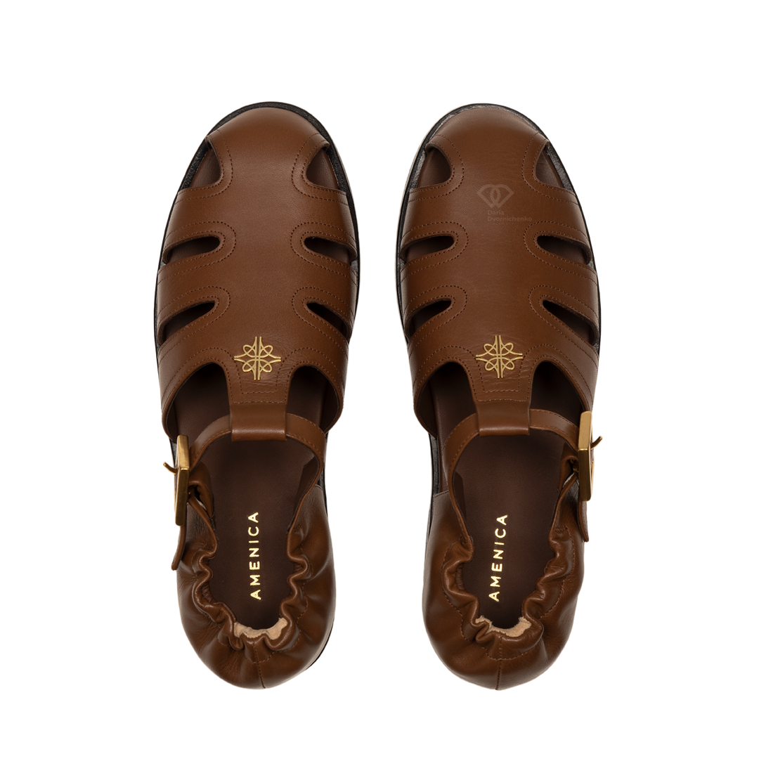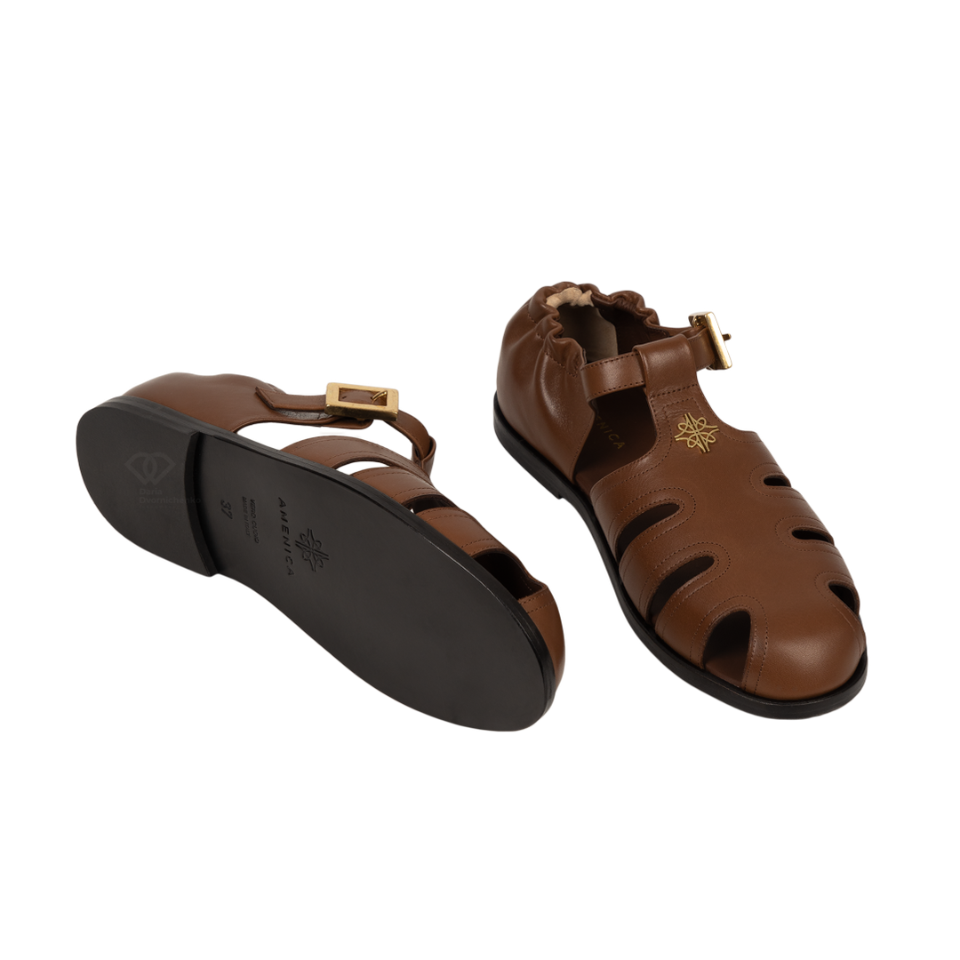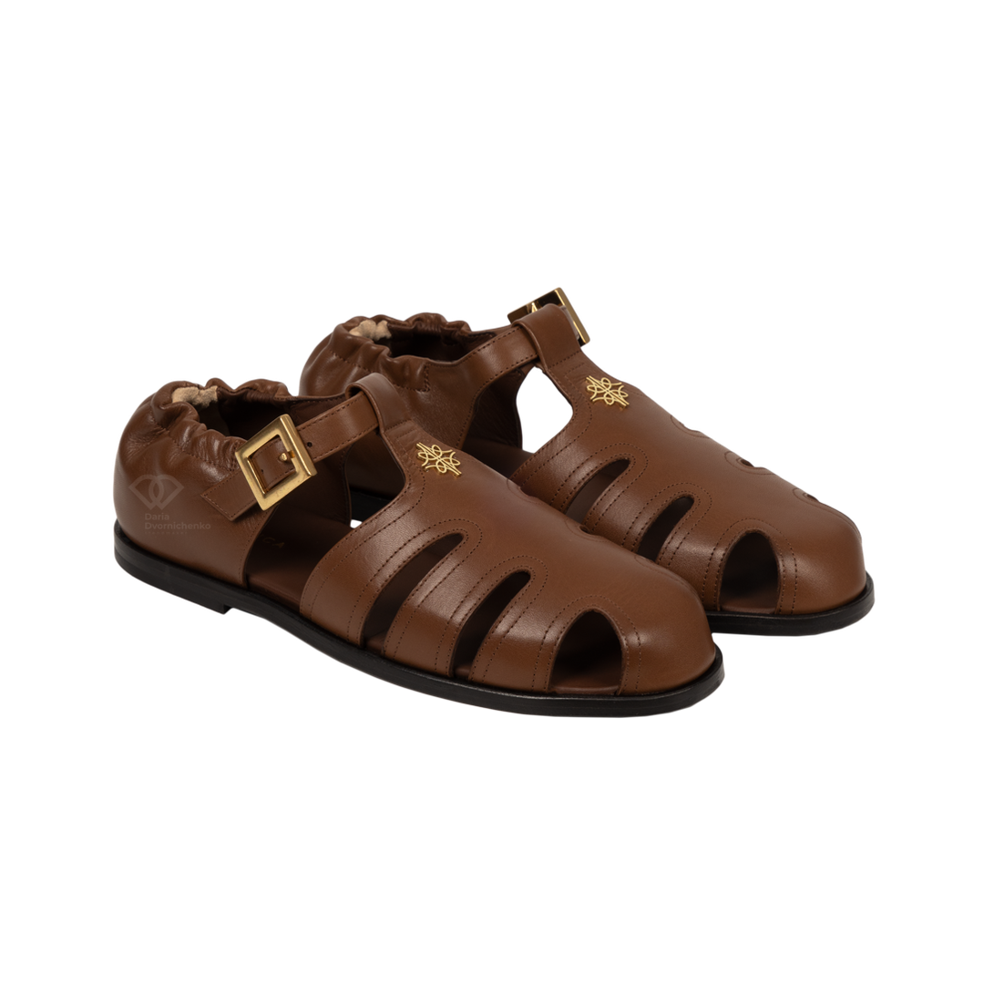 Глубокий коньячный (коричневый) цвет и широкие кожаные ремешки. Закрытый мыс делает модель уместной даже в офисном дресс-коде, а вырезы по бокам обеспечивают отличную вентиляцию. Фирменное золотистое тиснение бренда на перемычке и массивная золотая пряжка на ремешке. Эластичная вставка на пятке позволяет легко надевать сандалии без лишних усилий.