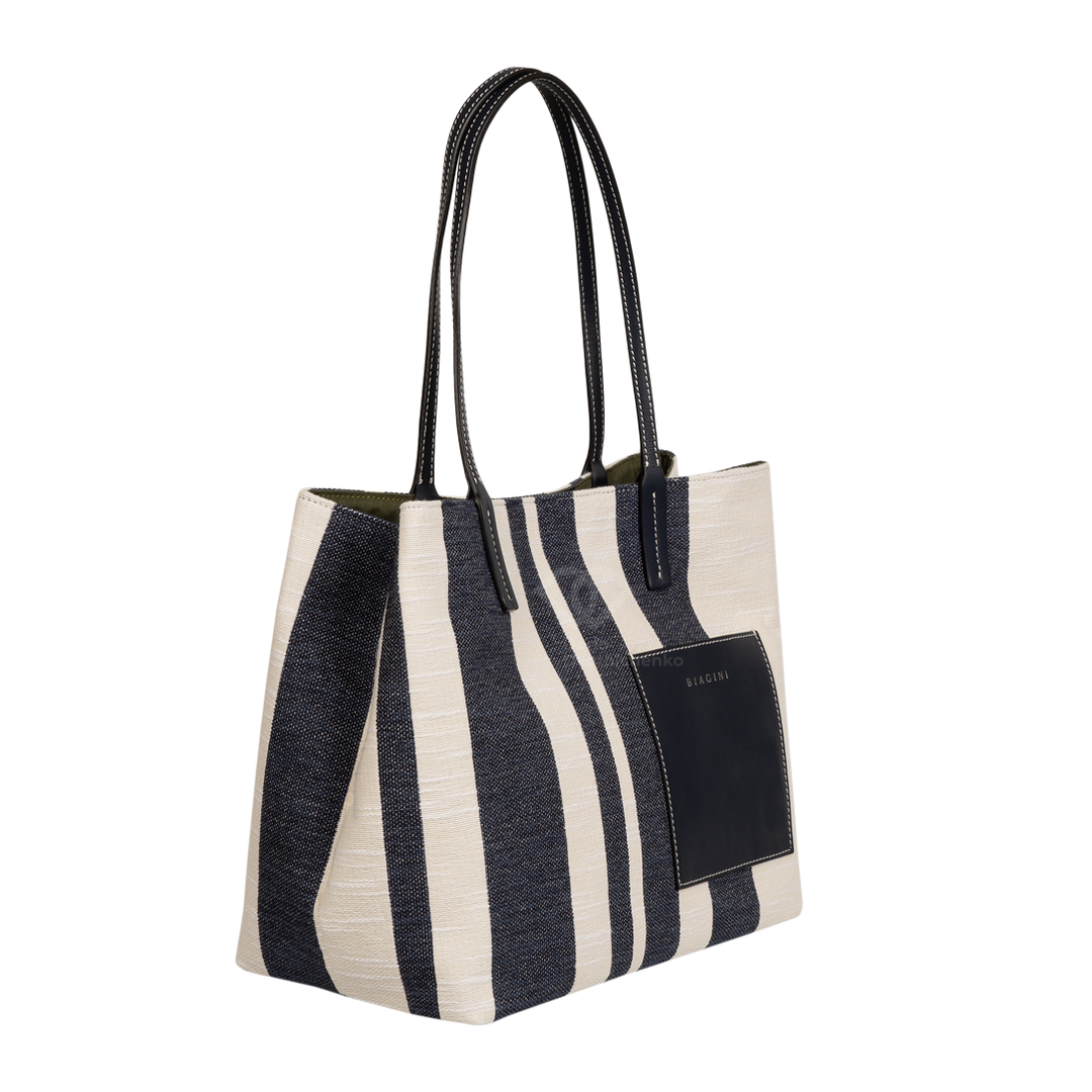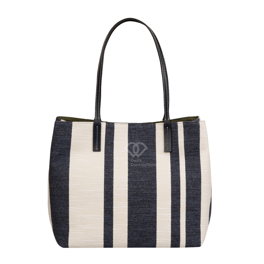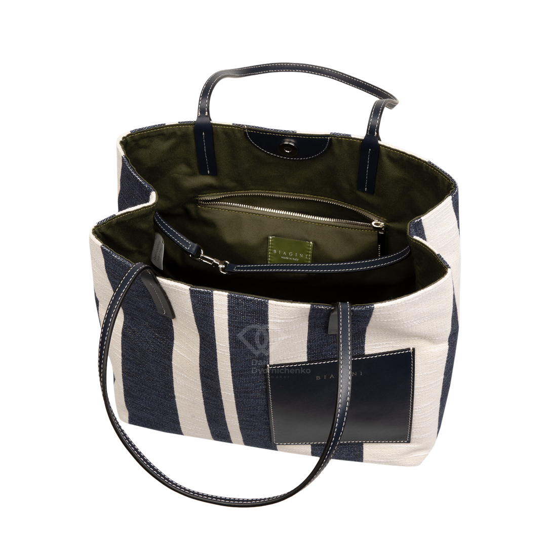 Сумочка выполнена из канвы с кожаной отделкой ручек , подкладка тканевая темно зеленого цвета, одно отделение по середине , один внутренний карман на молнии и один внешний нашивной кожаный карман. Внутри есть утяжки, которые позволяют изменить форму шоппера и сделать его более квадратным.