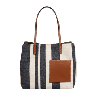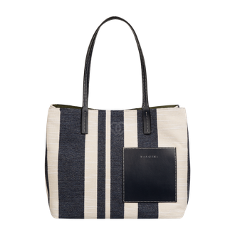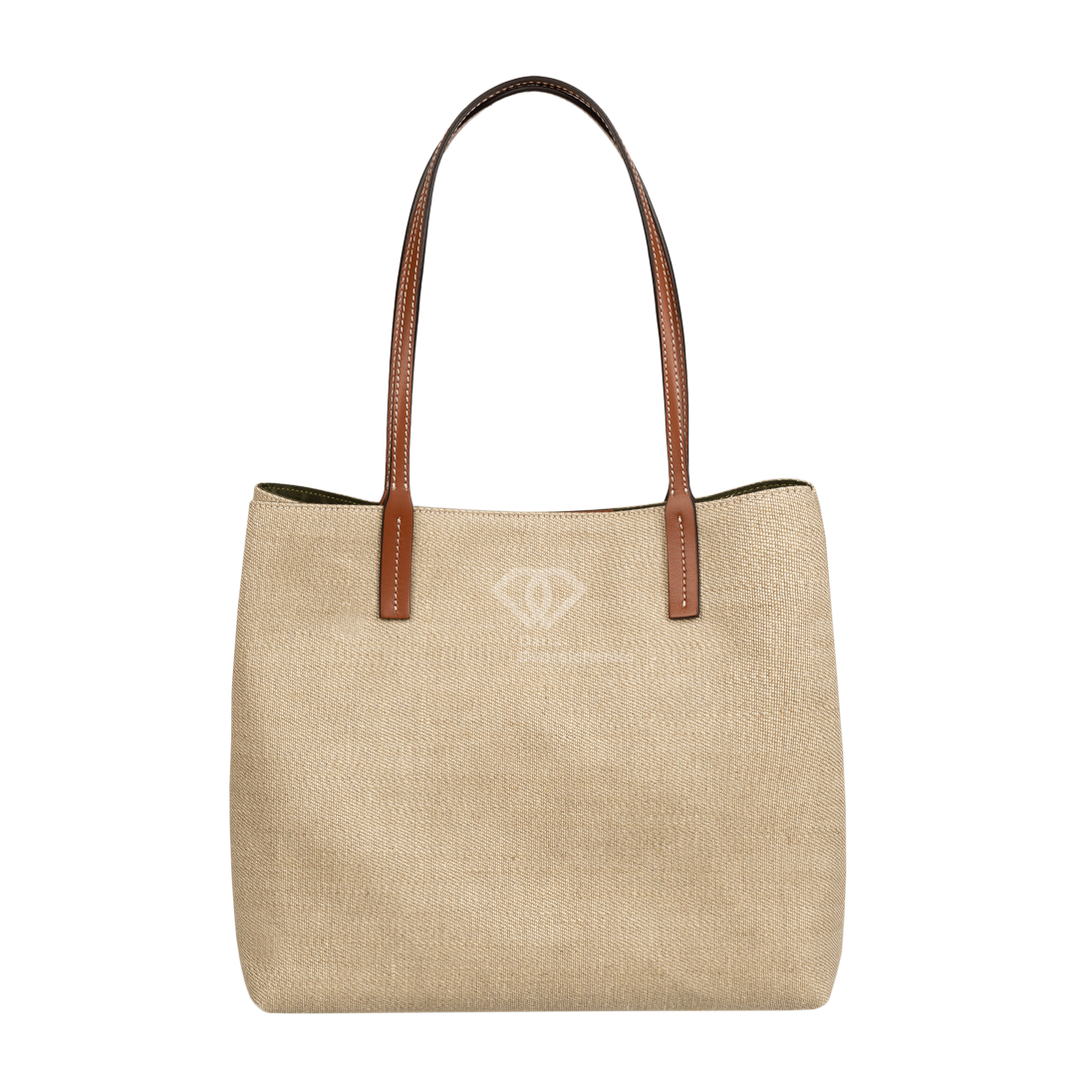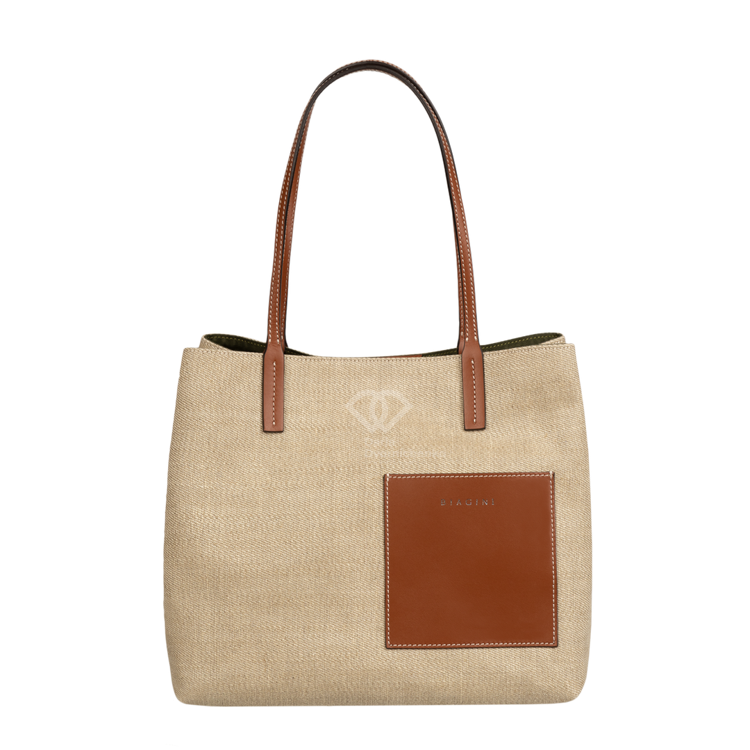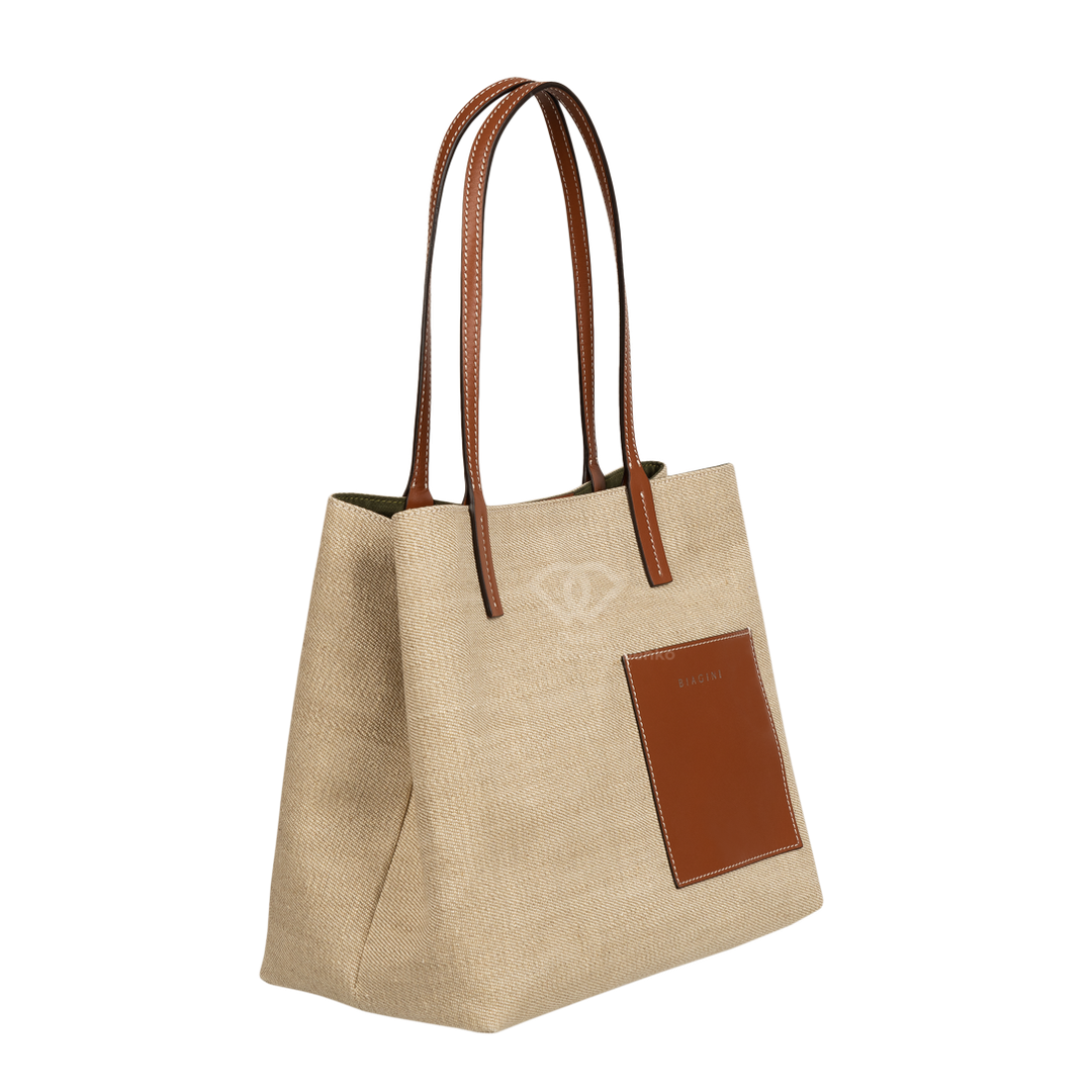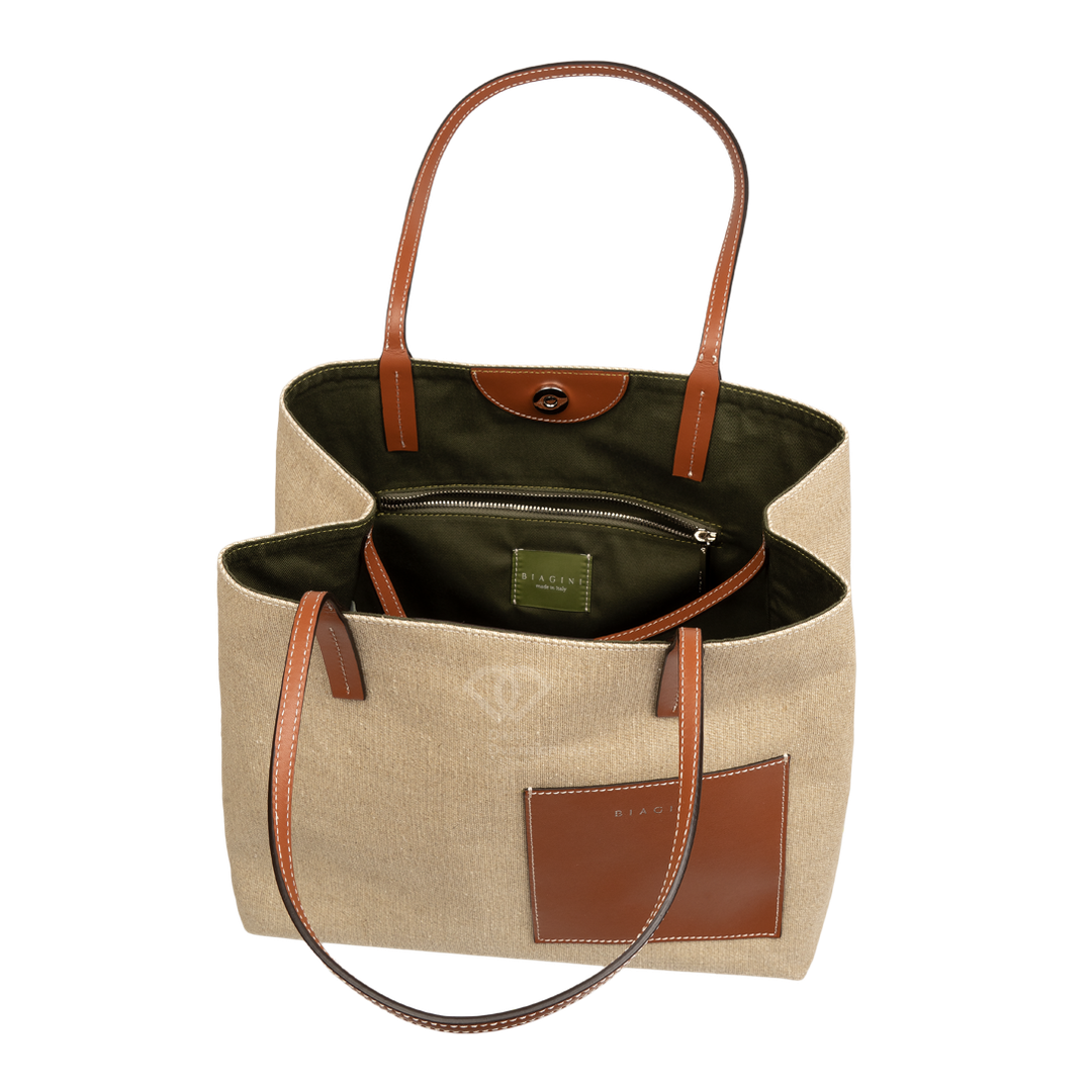 Сумочка выполнена из канвы с кожаной отделкой ручек , подкладка тканевая темно зеленого цвета, одно отделение по середине , один внутренний карман на молнии и один внешний нашивной кожаный карман. Внутри есть утяжки, которые позволяют изменить форму шоппера и сделать его более квадратным.