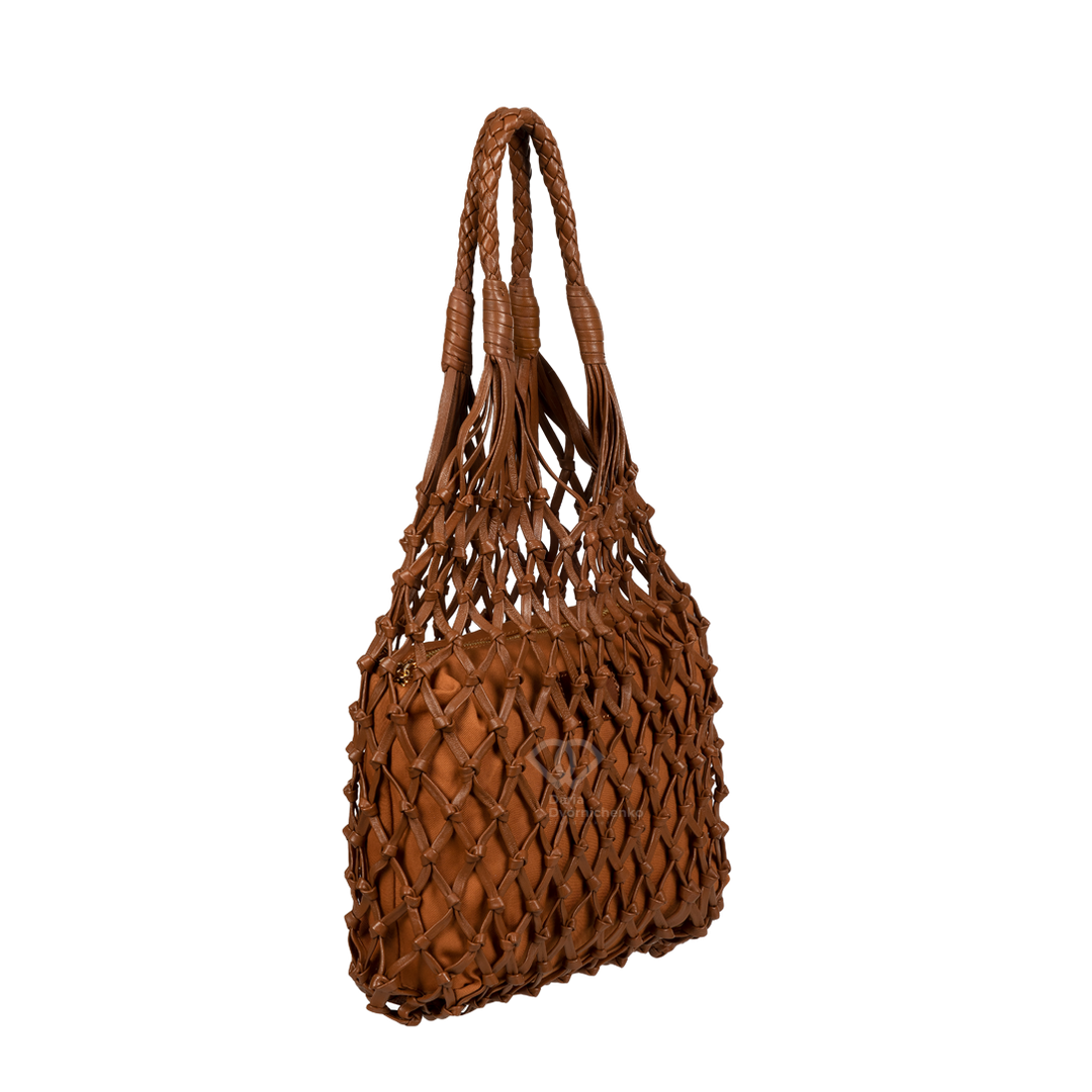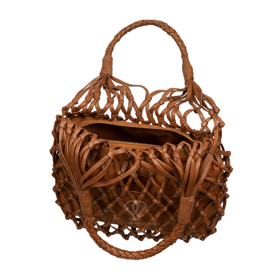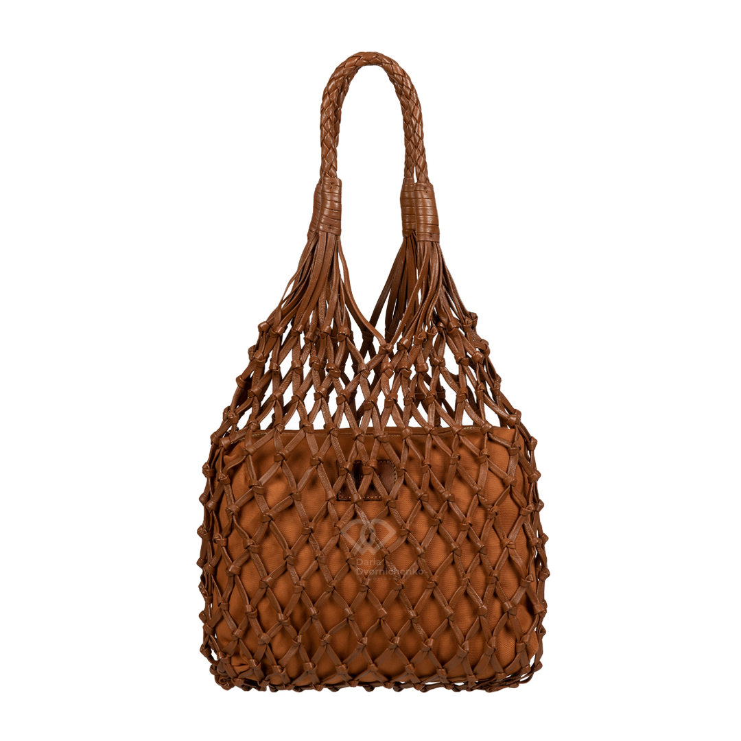 Сумка-хобо, выполненная в сложной технике плетения «макраме» из кожаных шнуров, объединяет в себе богемный шик и современную роскошь. Внешний каркас сумки представляет собой ажурную сетку, искусно сплетенную из мягких кожаных ремешков, переходящих в эффектные кисти у основания ручек. Внутри находится съемный текстильный чехол, который обеспечивает сохранность ваших вещей и создает красивый цветовой контраст. Плетеные ручки удобно ложатся на плечо, не соскальзывают и со временем становятся еще мягче, подстраиваясь под вас.