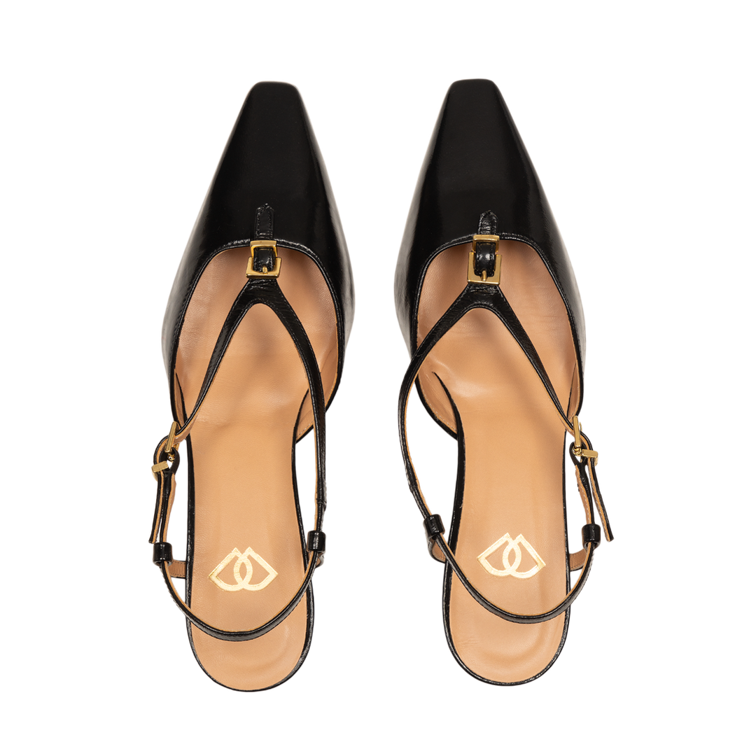 Cлингбэки с Т-образным ремешком- это элегантность в стиле ретро, переосмысленная для современного ритма города.Глянцевая лаковая кожа, которая сохраняет форму и притягивает взгляды.Изящный Т-образный ремешок с золотистой пряжкой не только служит украшением, но и надежно фиксирует стопу. Острый, слегка вытянутый мыс добавляет образу строгости и французского шика.