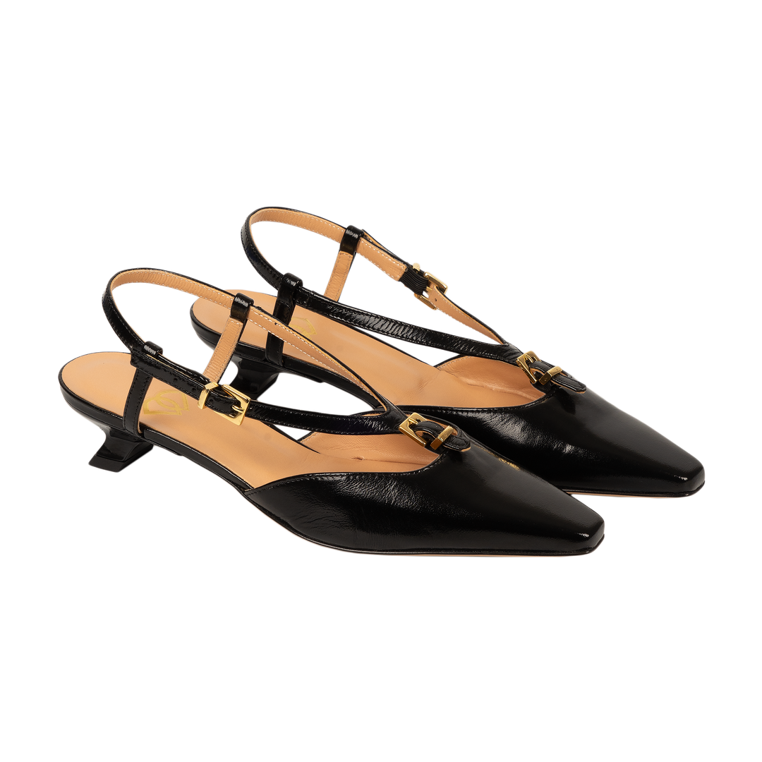 Cлингбэки с Т-образным ремешком- это элегантность в стиле ретро, переосмысленная для современного ритма города.Глянцевая лаковая кожа, которая сохраняет форму и притягивает взгляды.Изящный Т-образный ремешок с золотистой пряжкой не только служит украшением, но и надежно фиксирует стопу. Острый, слегка вытянутый мыс добавляет образу строгости и французского шика.