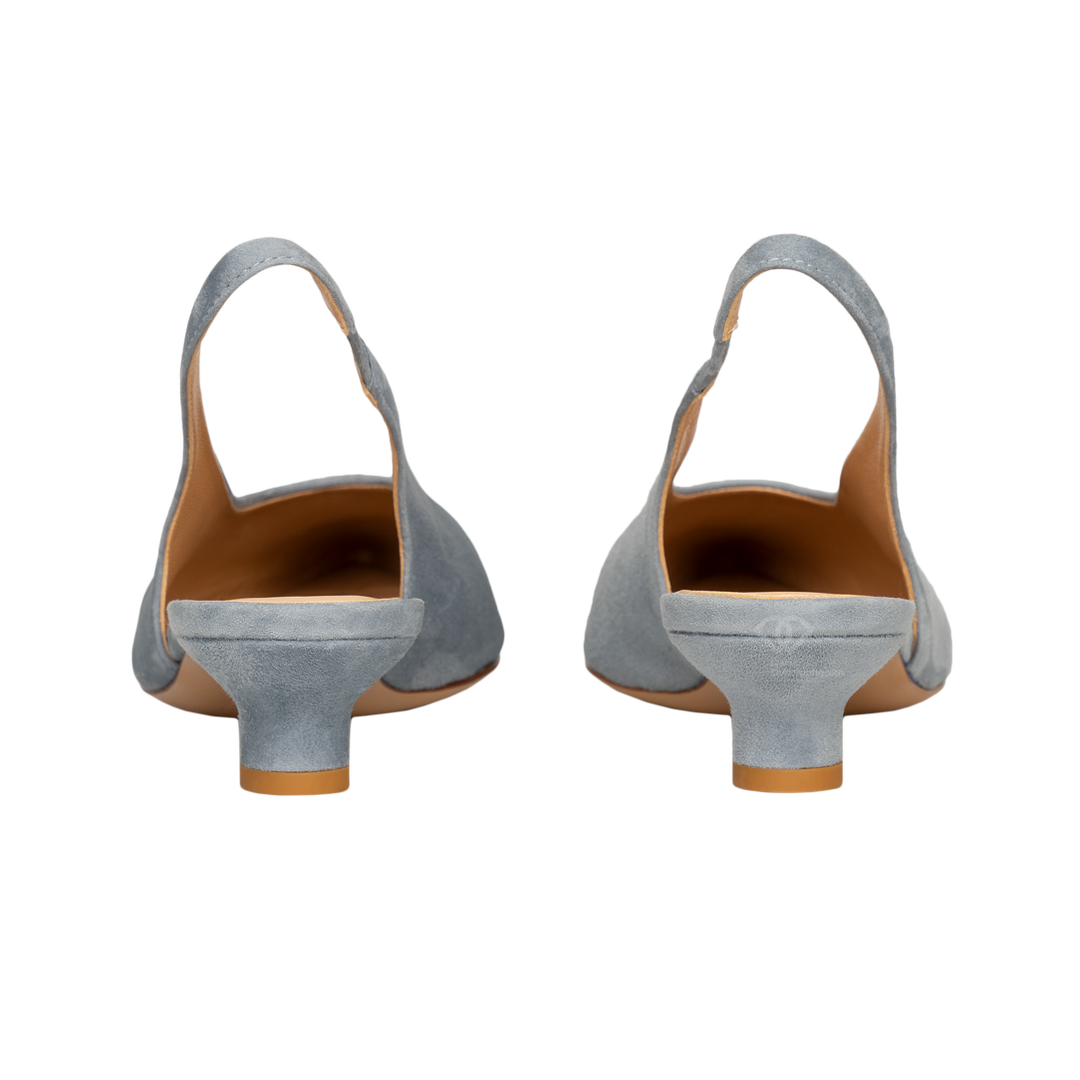 Голубые замшевые слингбэки с глубоким вырезом - это воплощение женственности и нежности. Модель в изысканном серо-голубом оттенке выполнена из бархатистой замши. Глубокий вырез — главный тренд сезона, который делает стопу более изящной, а силуэт — летящим. Натуральная премиальная замша, приятная на ощупь и устойчивая к заломам.Заостренный мыс и открытая пятка создают утонченный, аристократичный образ.Изящный каблук-рюмочка золотая середина между стилем и удобством. Благородная текстура замши в сочетании с небесным оттенком мгновенно освежает образ и привлекает внимание.