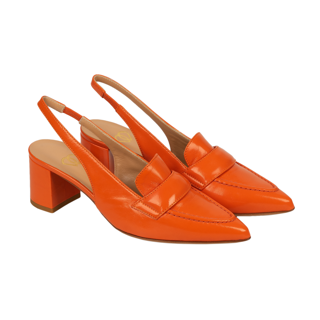 Элегантные кожаные слингбэки в стиле «лоферы» - cмелое сочетание классики и трендов. Эти туфли объединяют в себе строгость лоферов и изящество открытых слингбэков. Модель выполнена в безупречном белом цвете и ярком оранжевом цвете, который станет освежающим акцентом в вашем гардеробе.Декоративная планка и характерный шов на мысе отсылают к стилистике классических лоферов. Заостренный мыс визуально удлиняет ноги и придает образу утонченность.Средний по высоте широкий каблук обеспечивает комфорт при ходьбе, позволяя сохранять легкость в течение всего дня.Эластичный ремешок на пятке мягко, но плотно фиксирует стопу.