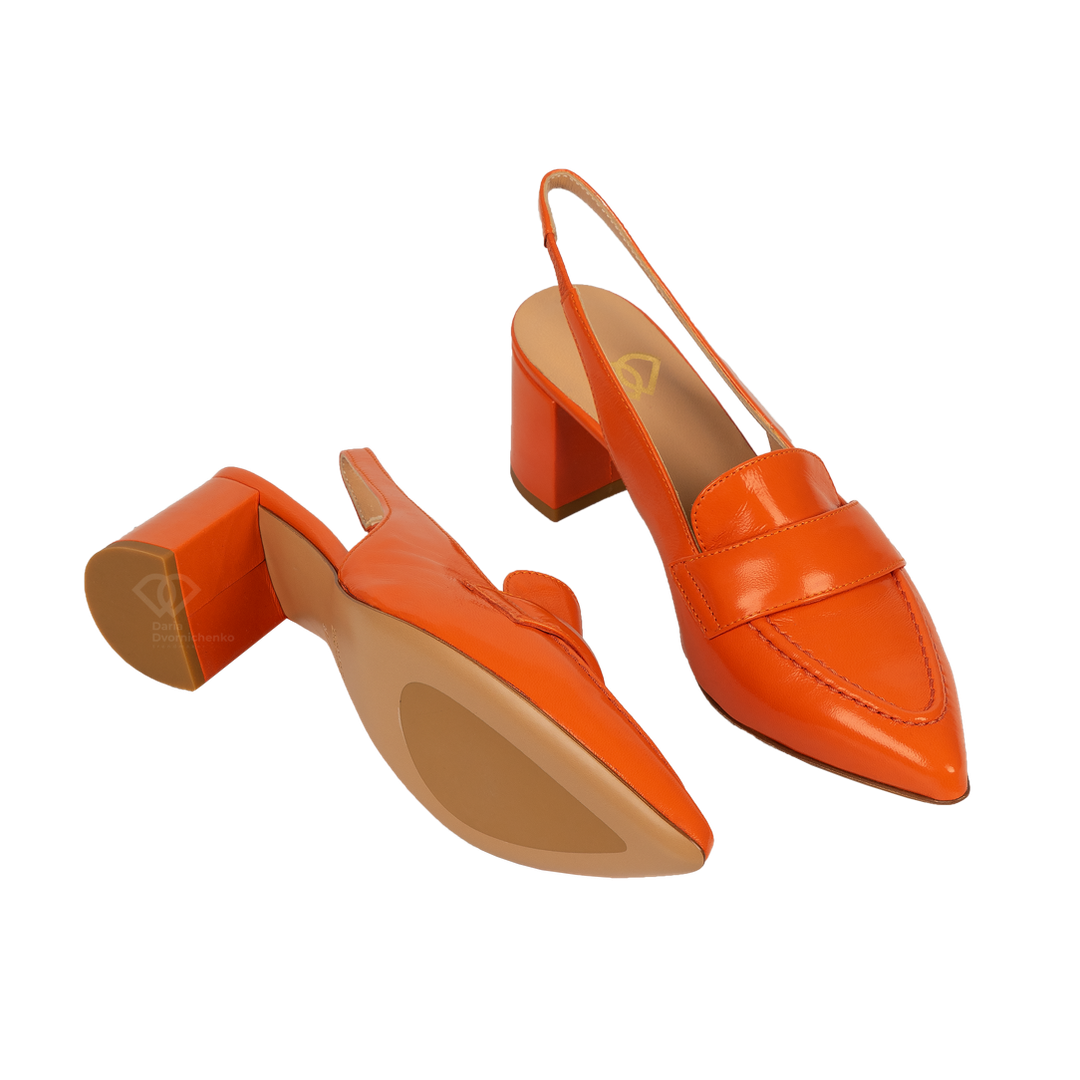 Элегантные кожаные слингбэки в стиле «лоферы» - cмелое сочетание классики и трендов. Эти туфли объединяют в себе строгость лоферов и изящество открытых слингбэков. Модель выполнена в безупречном белом цвете и ярком оранжевом цвете, который станет освежающим акцентом в вашем гардеробе.Декоративная планка и характерный шов на мысе отсылают к стилистике классических лоферов. Заостренный мыс визуально удлиняет ноги и придает образу утонченность.Средний по высоте широкий каблук обеспечивает комфорт при ходьбе, позволяя сохранять легкость в течение всего дня.Эластичный ремешок на пятке мягко, но плотно фиксирует стопу.