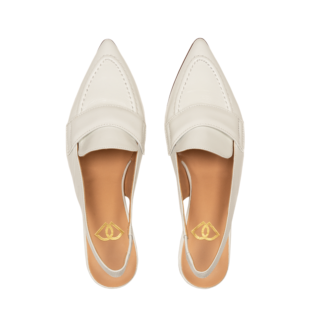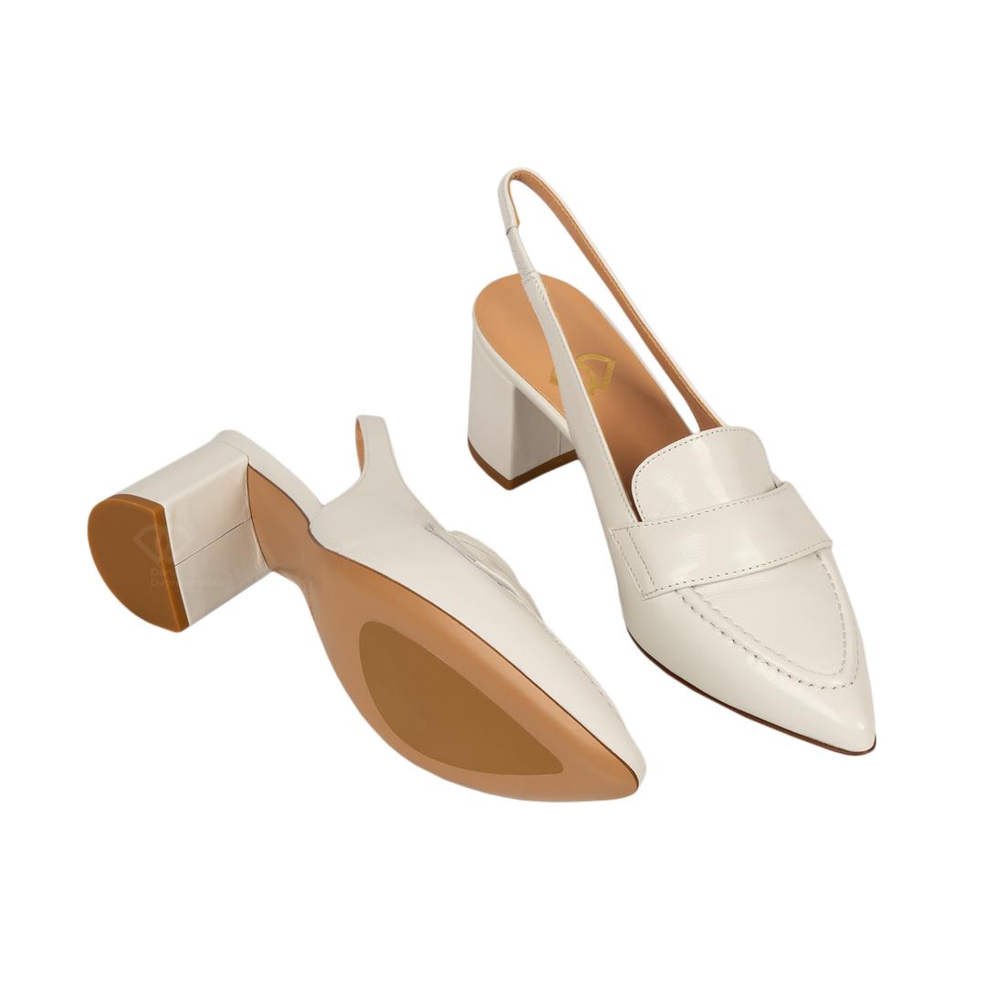 Элегантные кожаные слингбэки в стиле «лоферы» - cмелое сочетание классики и трендов. Эти туфли объединяют в себе строгость лоферов и изящество открытых слингбэков. Модель выполнена в безупречном белом цвете и ярком оранжевом цвете, который станет освежающим акцентом в вашем гардеробе.Декоративная планка и характерный шов на мысе отсылают к стилистике классических лоферов. Заостренный мыс визуально удлиняет ноги и придает образу утонченность.Средний по высоте широкий каблук обеспечивает комфорт при ходьбе, позволяя сохранять легкость в течение всего дня.Эластичный ремешок на пятке мягко, но плотно фиксирует стопу.