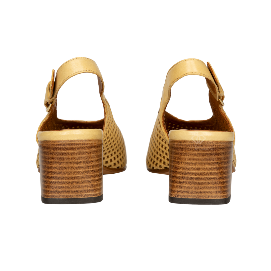 Воздушная элегантность для жарких дней. Легкие и изящные туфли с открытой пяткой — мастхэв для летнего сезона. Благодаря сетчатому плетению обувь обеспечивает идеальную вентиляцию, оставаясь при этом изысканным аксессуаром. Удобный устойчивый каблук средней высоты с фактурой под натуральное дерево. Сложное плетение из тонких кожаных полос создает эффект полупрозрачности и легкости. Регулируемый ремешок на пятке с золотистой пряжкой позволяет идеально настроить посадку.