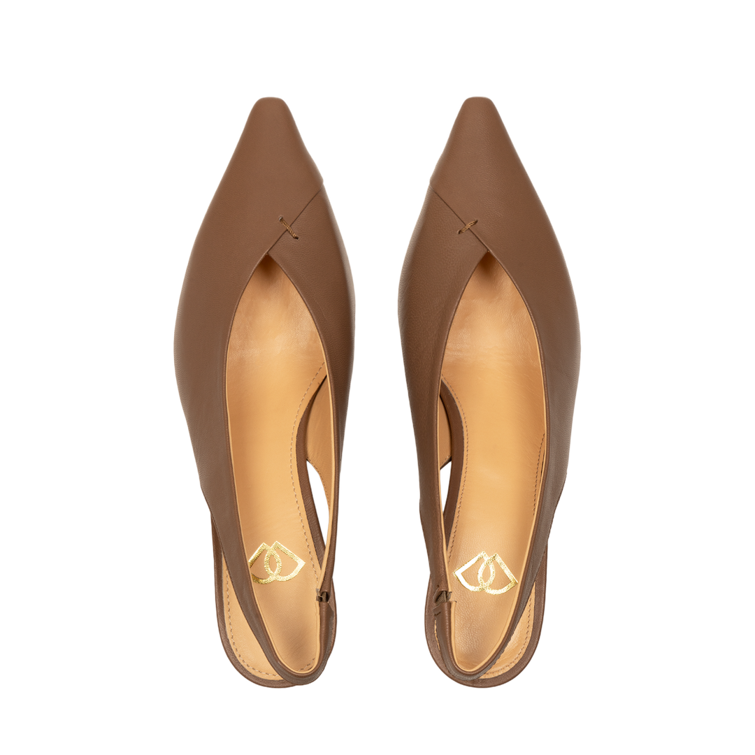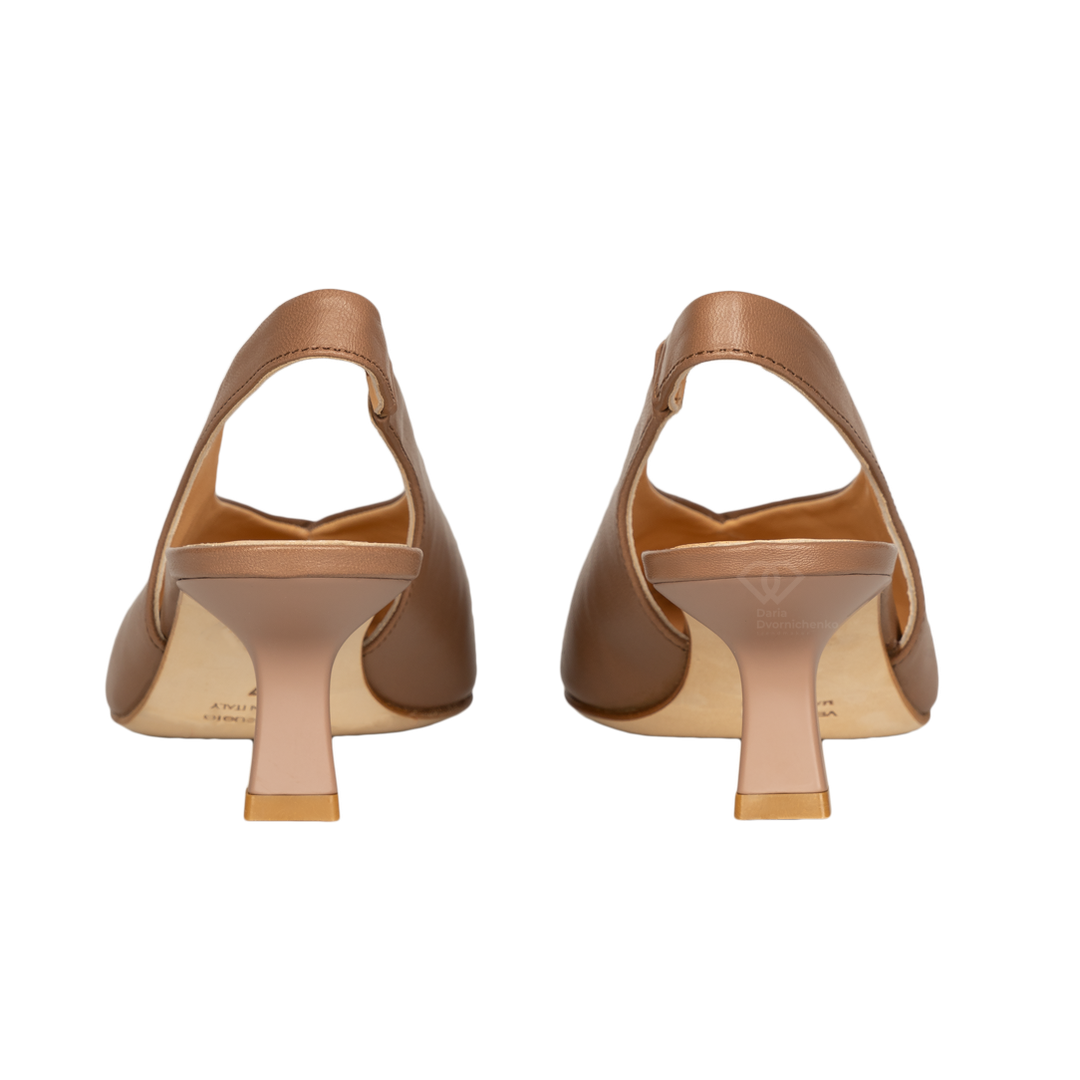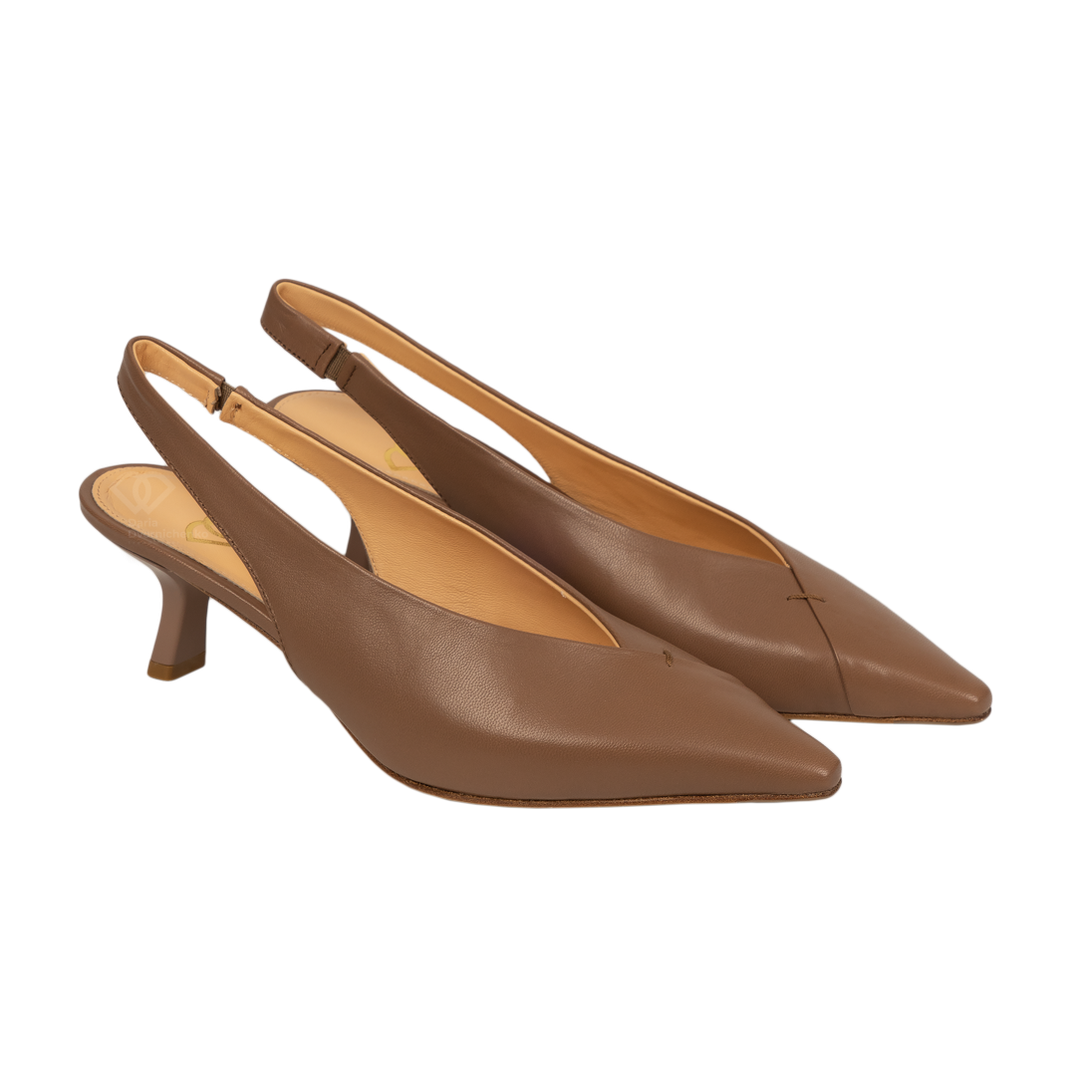 Минималистичный дизайн, глубокий тауповый оттенок и безупречные линии делают эти слингбэки идеальной базой. V-образный вырез: Визуально удлиняет линию ноги, делая силуэт более стройным и изящным. Острая форма добавляет строгости и шика, оставаясь при этом актуальной вне времени.