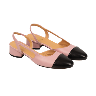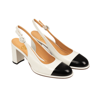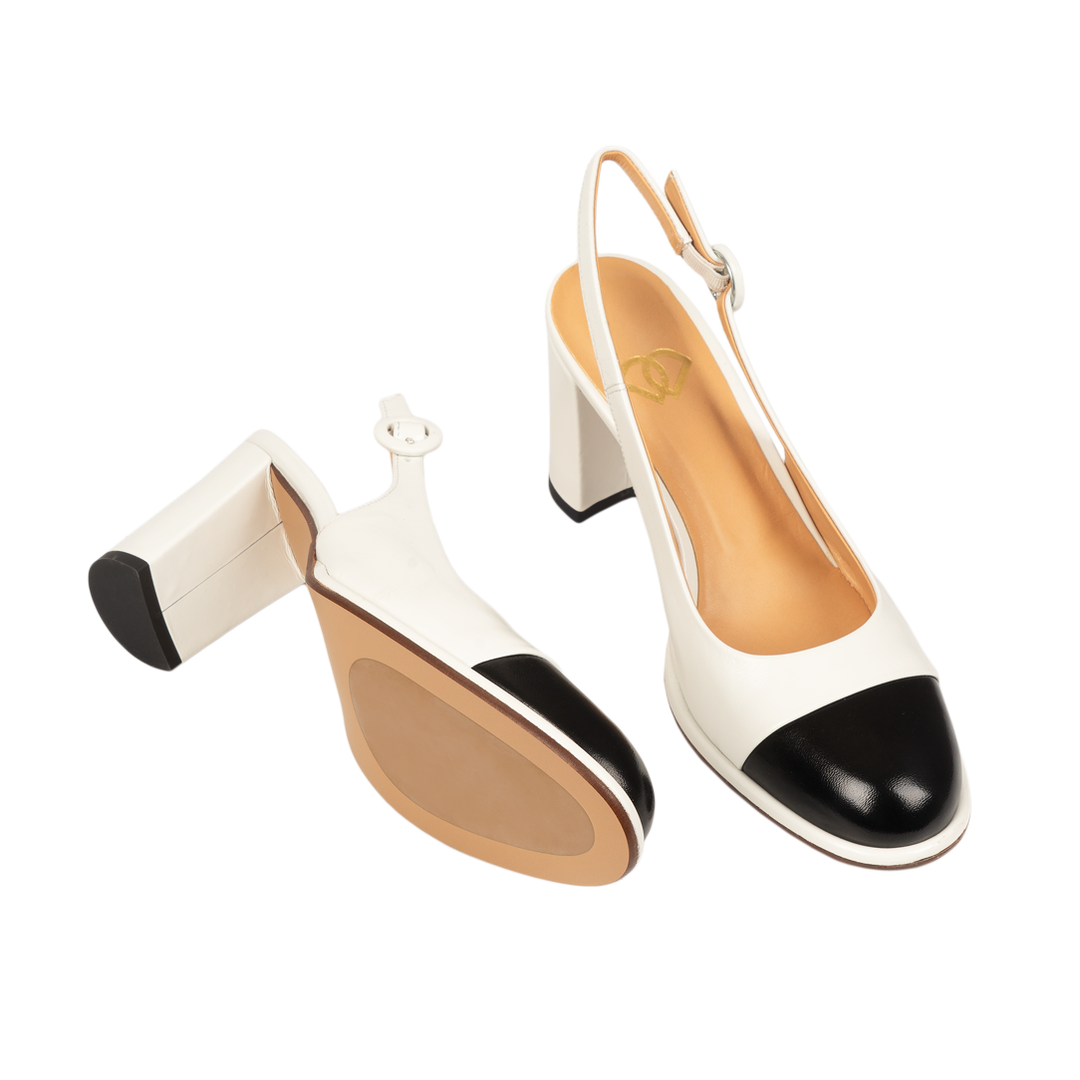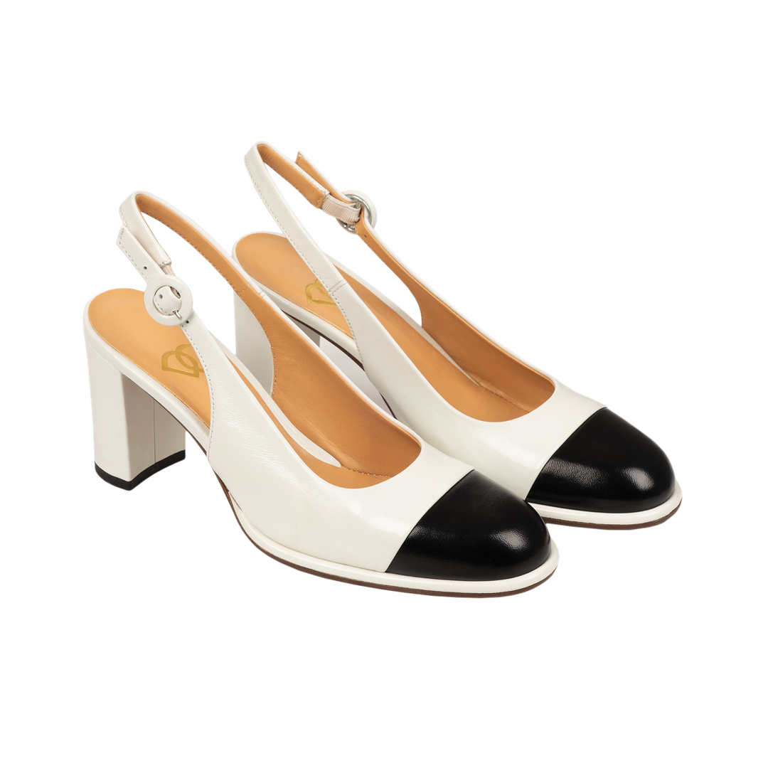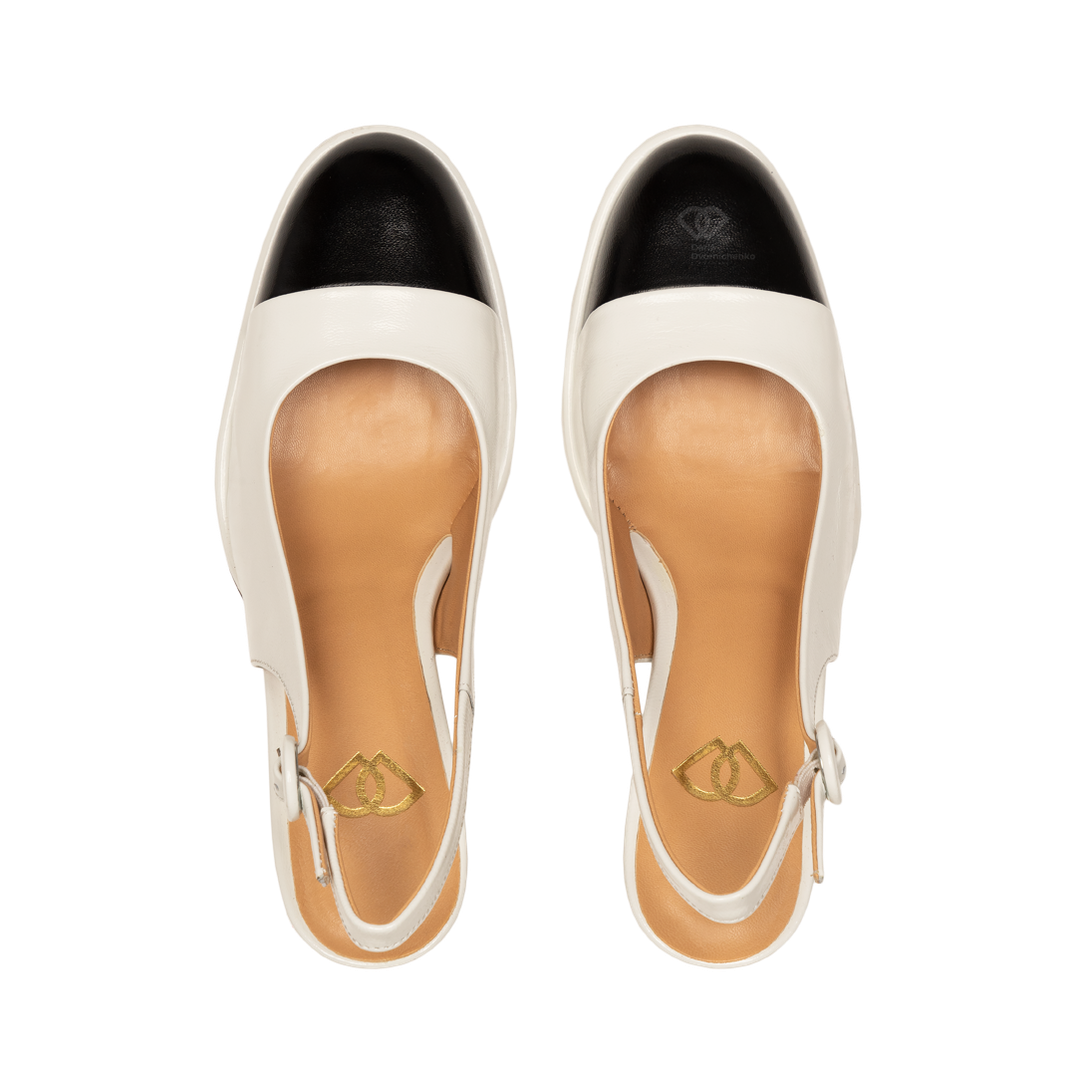 Лаконичные слингбэки с квадратным каблуком - удобная и стильная модель, сочетающая в себе контрастные цвета.Вырезы по бокам добавляют модели оригинальности.Устойчивый квадратный каблук средней высоты обеспечивает максимальный комфорт при ходьбе.Закругленный мыс и открытая пятка делают эту пару универсальной для весенне-летнего сезона.