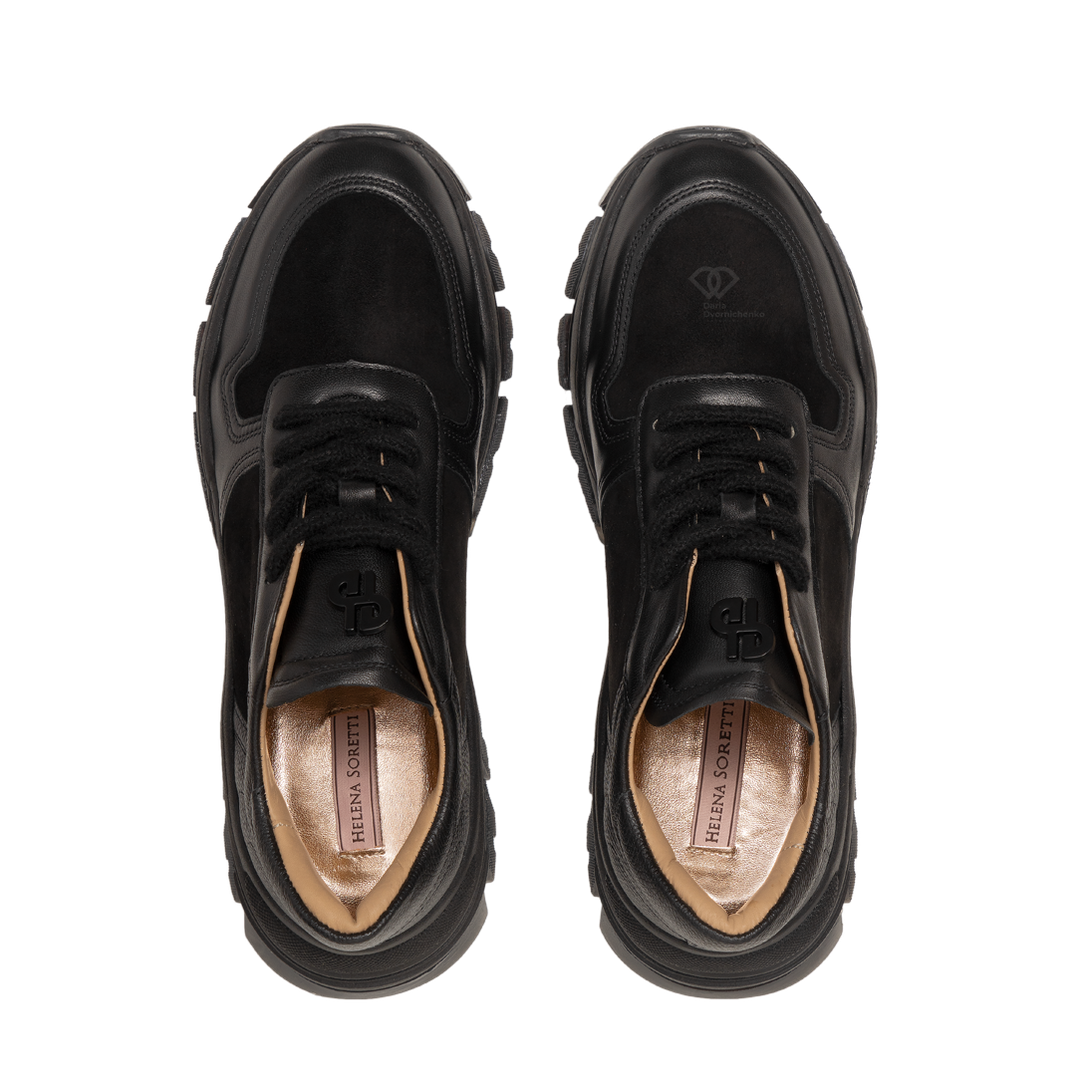 Стильные кроссовки, сочетающие классическую элегантность и современный спортивный дизайн, абсолютно базовая модель которая выдержит все испытания временем и трендами. Верх выполнен из комбинации гладкой кожи и мягкой замши глубокого черного цвета. Это обеспечивает не только великолепный внешний вид, но и долговечность. Внутренняя отделка из бежевой кожи, на язычке фирменный моногамный логотип.Черная цветовая гамма делает эту модель универсальной и легкой для сочетания как с деловым стилем, так и с повседневными джинсами. Массивная подошва обеспечивает превосходную амортизацию и подчеркивает актуальный силуэт.