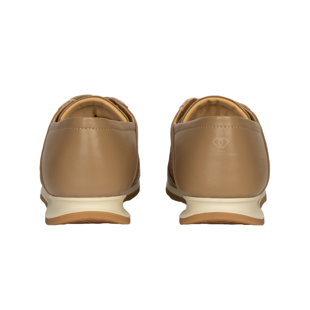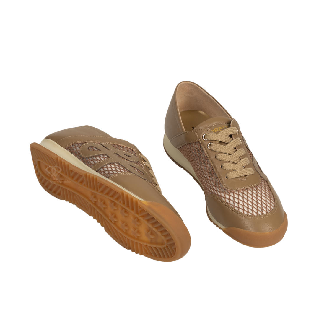 Легкость и изысканность в каждой детали. Эти кроссовки от Helena Soretti созданы для тех, кто ищет комфортную обувь на весну и лето, не жертвуя стилем. Уникальная перфорированная фактура и мягкие линии делают эту пару идеальным спутником для долгих прогулок. Вставки из прочной крупной сетки обеспечивают свободную циркуляцию воздуха — вашим ногам будет комфортно даже в жаркую погоду.Фигурные кожаные аппликации по бокам и золотистая фурнитура добавляют модели премиальный вид.