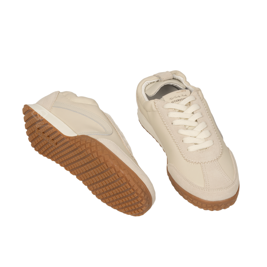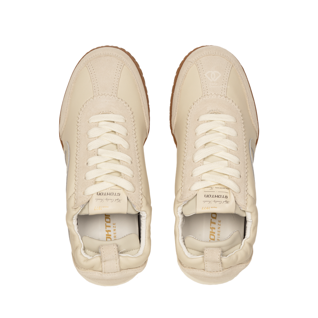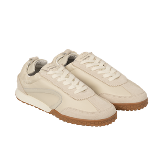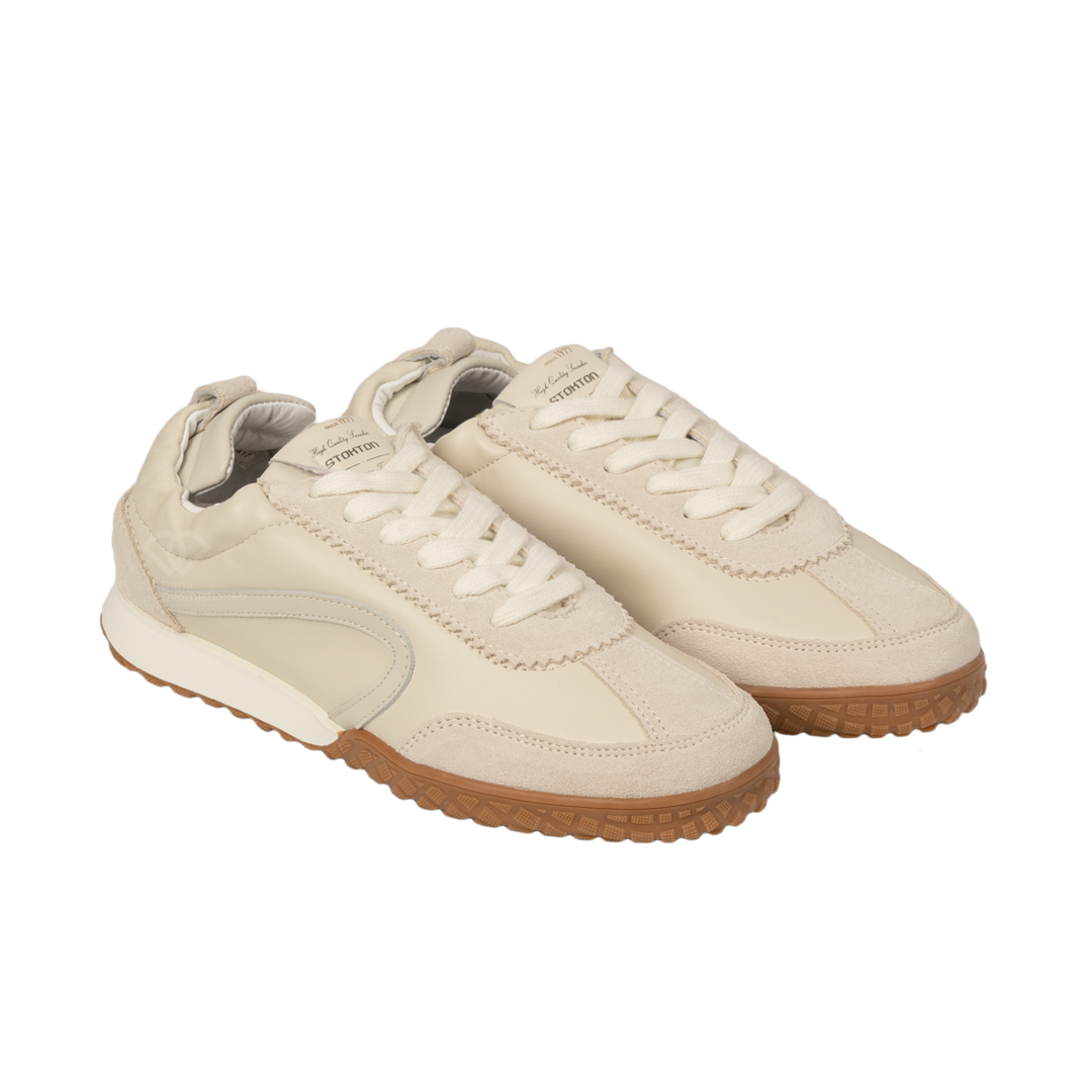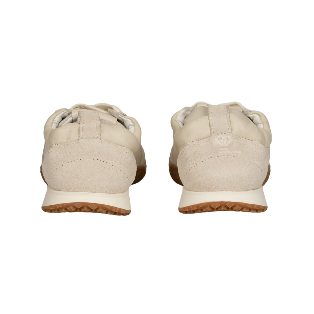 Модель выполнена в стиле ретро-раннеров, но в люксовом исполнении. Сочетание нежной матовой кожи и бархатистой замши создает объемный, многослойный вид. Тракторный протектор заходит на мысок, защищая обувь от износа и добавляя паре дерзкий, уверенный характер.Фигурные вставки и декоративная строчка подчеркивают анатомические линии стопы, делая силуэт кроссовок изящным и легким.