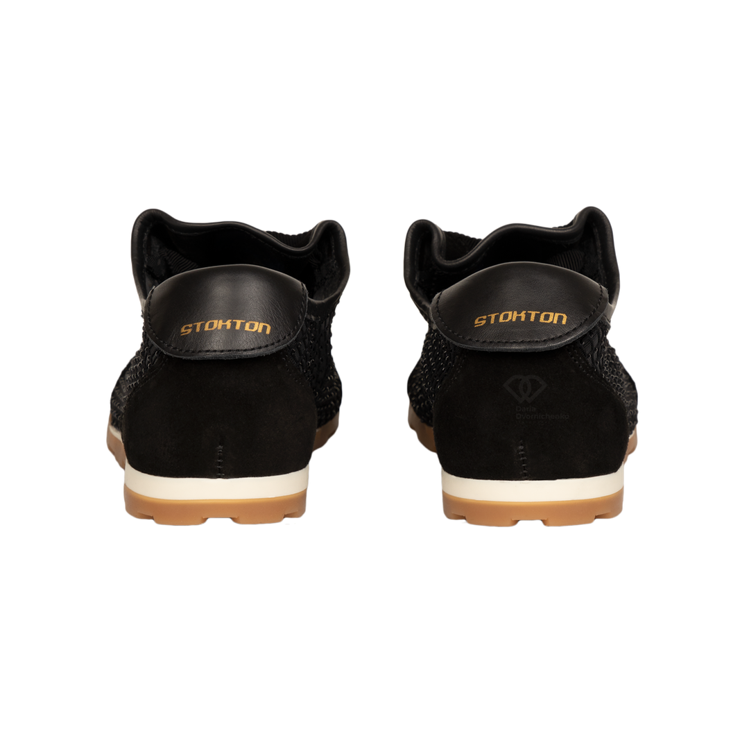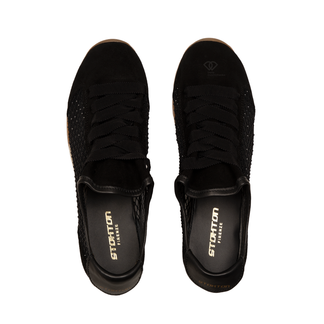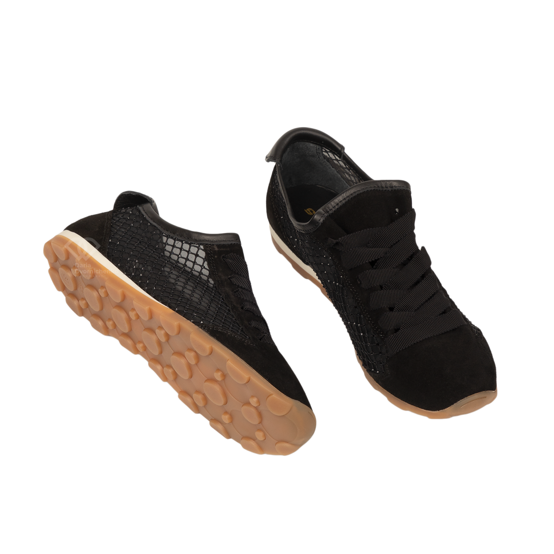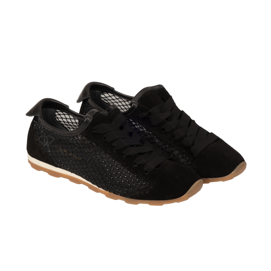 Сочетание глубокого черного цвета, игры фактур и полупрозрачных элементов выводит повседневную обувь на новый уровень. Основная часть выполнена из крупноячеистого сетчатого текстиля. Это не только создает дерзкий визуальный эффект, но гарантирует вентиляцию даже в самый жаркий летний полдень.Носочная часть, задник и планка шнуровки выполнены из высококачественной натуральной замши. Это придает мягкой конструкции необходимую форму, прочность и статусность.Вместо классических шнурков модель дополнена широкими лентами из репса. Этот декоративный прием добавляет спортивному силуэту нотки элегантности и позволяет завязывать эффектные объемные банты.