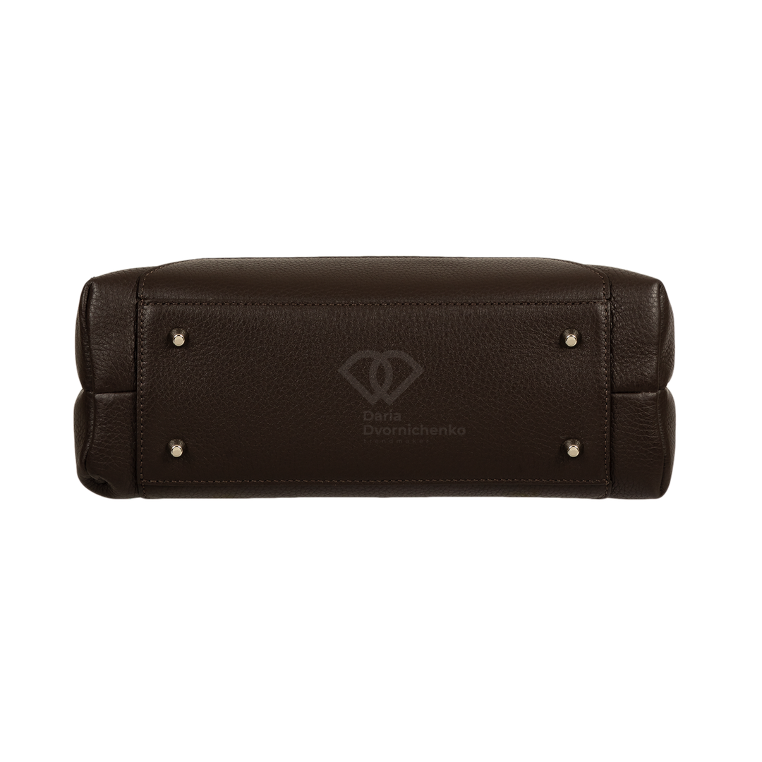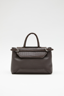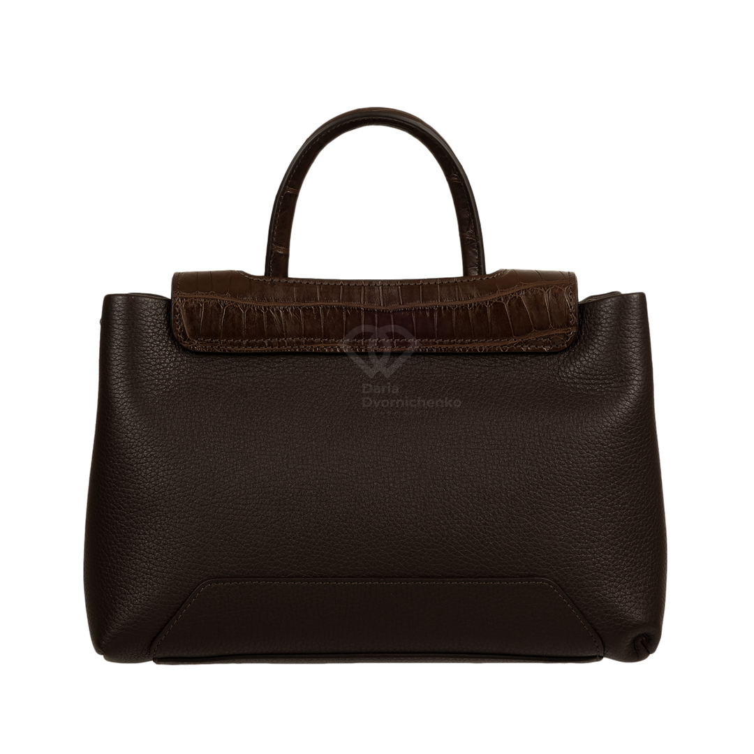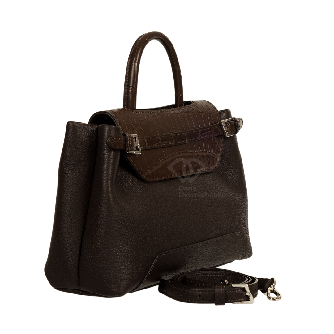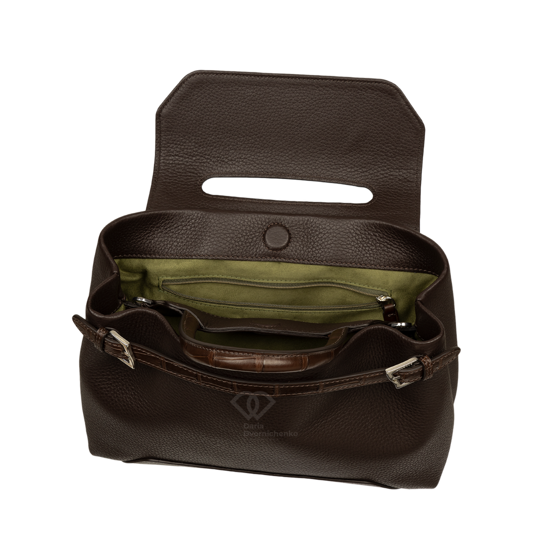 Топ Хэндл- особенностью модели является комбинирование гладкой зернистой кожи основного корпуса с вставками из кожи крокодила на клапане и верхней части ручки, что придает изделию роскошный и дорогой вид. Сумка оснащена удобной верхней ручкой, а также имеет элегантные ремешки с металлическими пряжками по бокам, которые служат как декоративным элементом, так и позволяют регулировать объем. Клапан закрывается на скрытую магнитную кнопку, обеспечивая легкий доступ и надежное хранение содержимого. Внутри сумка отделана контрастной подкладкой оливкового цвета и имеет несколько отделений, включая карманы на молнии для ценных вещей и открытые карманы для мелочей, что обеспечивает прекрасную организацию пространства.